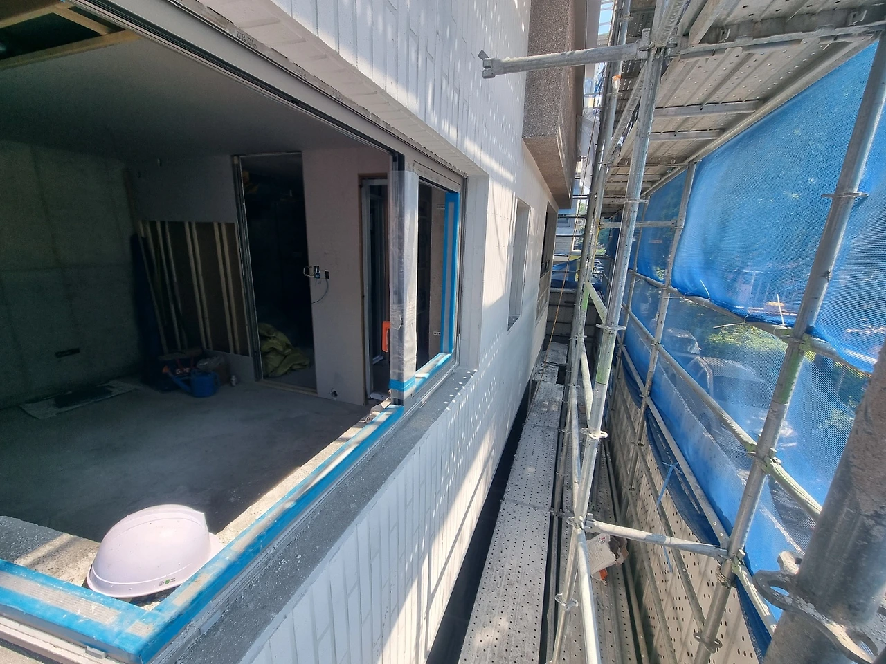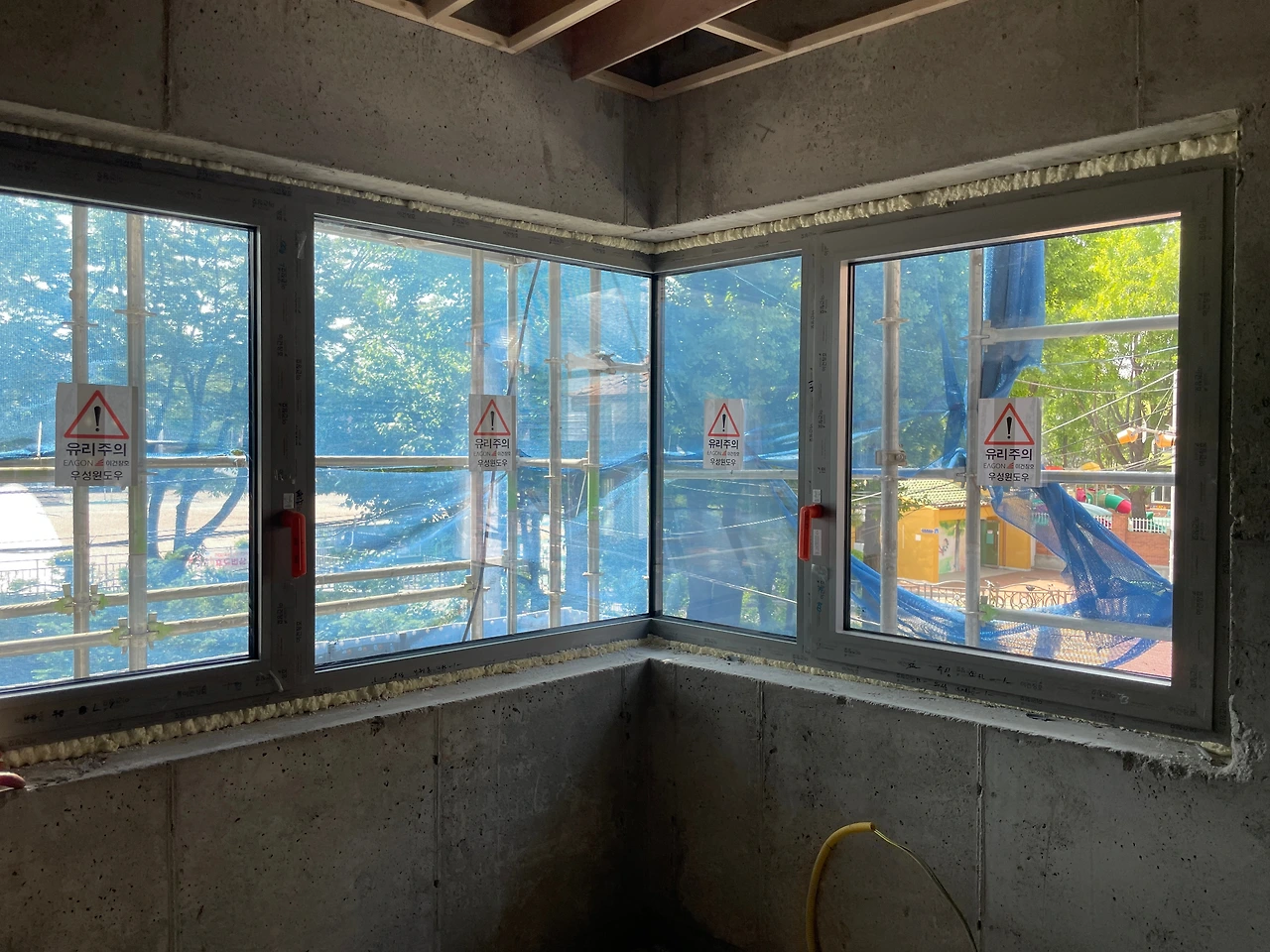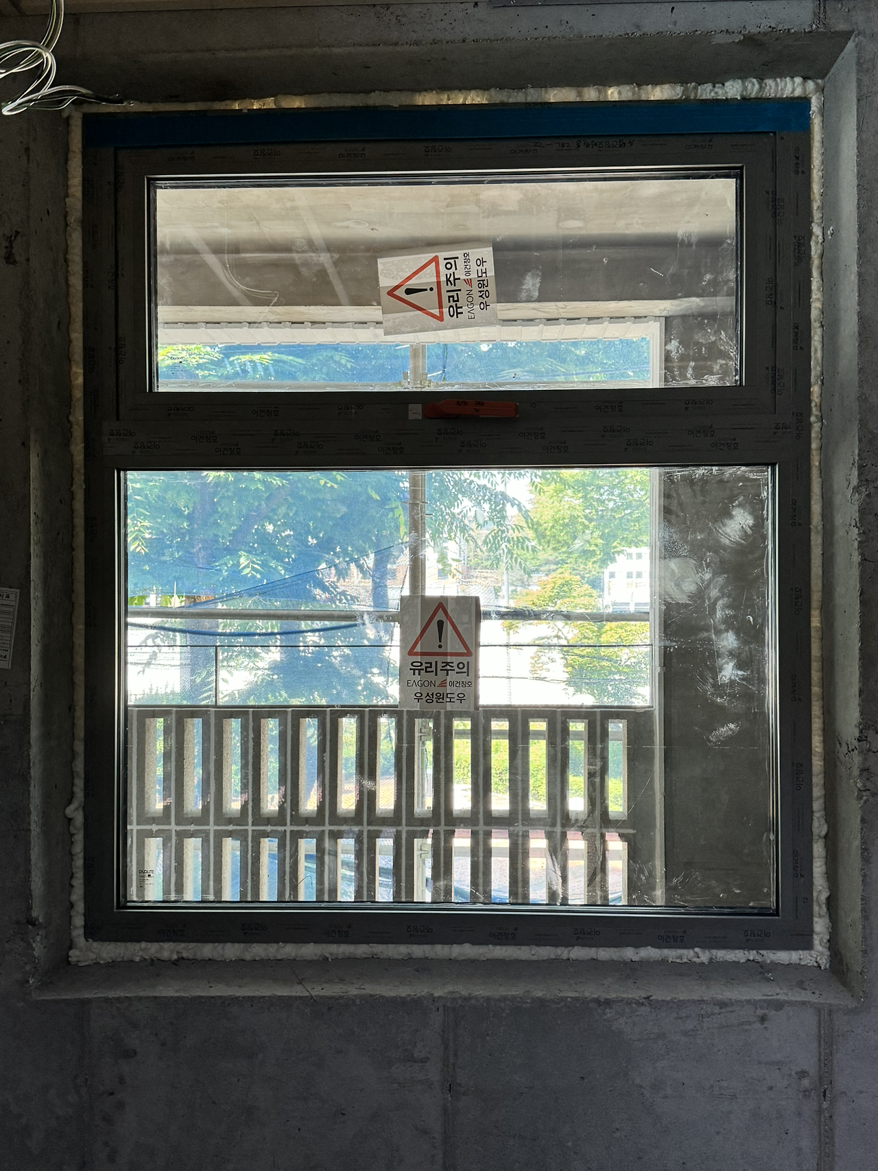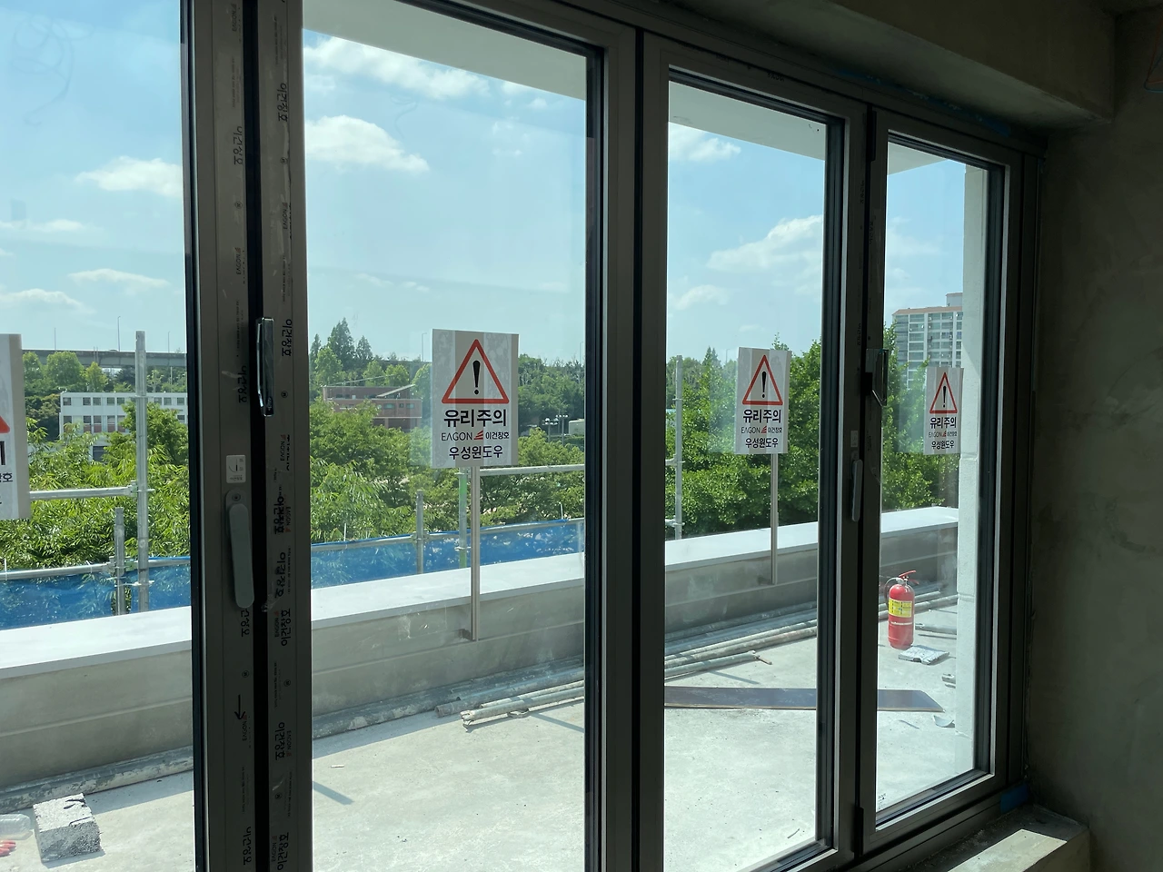 드디어, 창호 유리가 모두 끼워졌다. 아침에 일정이 있어서 직접 보진 못했지만, 3중 유리를 들어 올려 창호에 끼워 넣는 일이라 어려운 작업이었을 듯하다. 오후에 돌아오니 어느새 창은 다 끼워져 있고 창이 제대로 완성되니 단열과 소음차단이 잘되어 내부가 선선하고 주말 체육공원에서 뛰노는 사람들이 소리가 멀리서 나는 듯 조용해졌다. 큰 창문들이 있다 보니 외부 시선에 대한 걱정도 있었는데 약간의 반사가 생겨 야간에만 잘 차단하면 그 부분도 해소가 되었다.