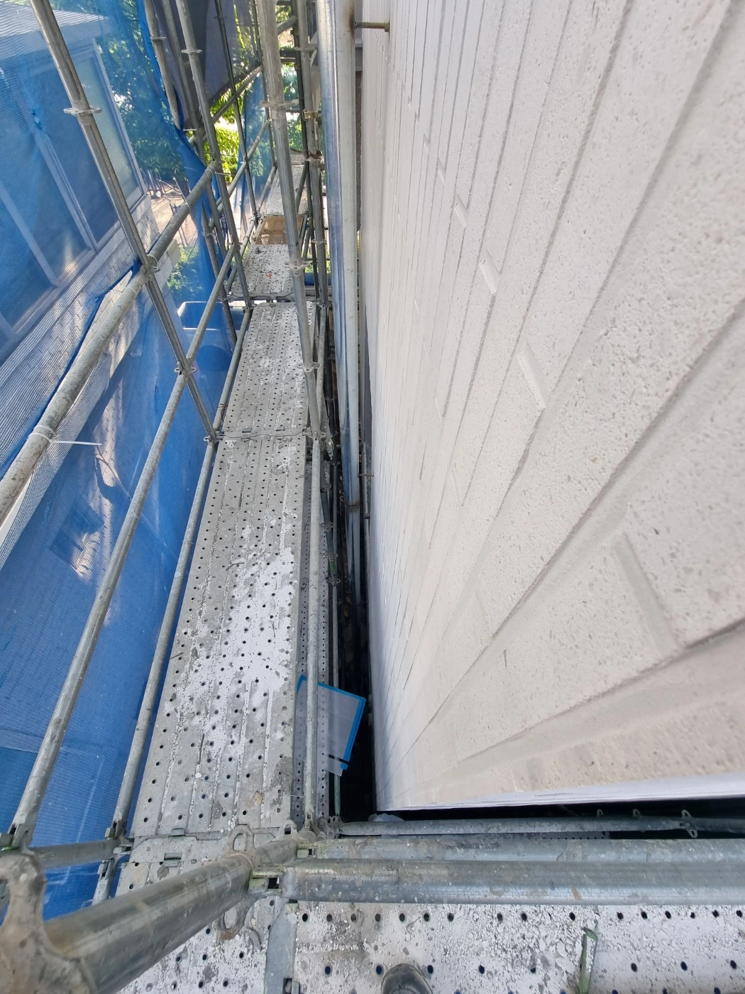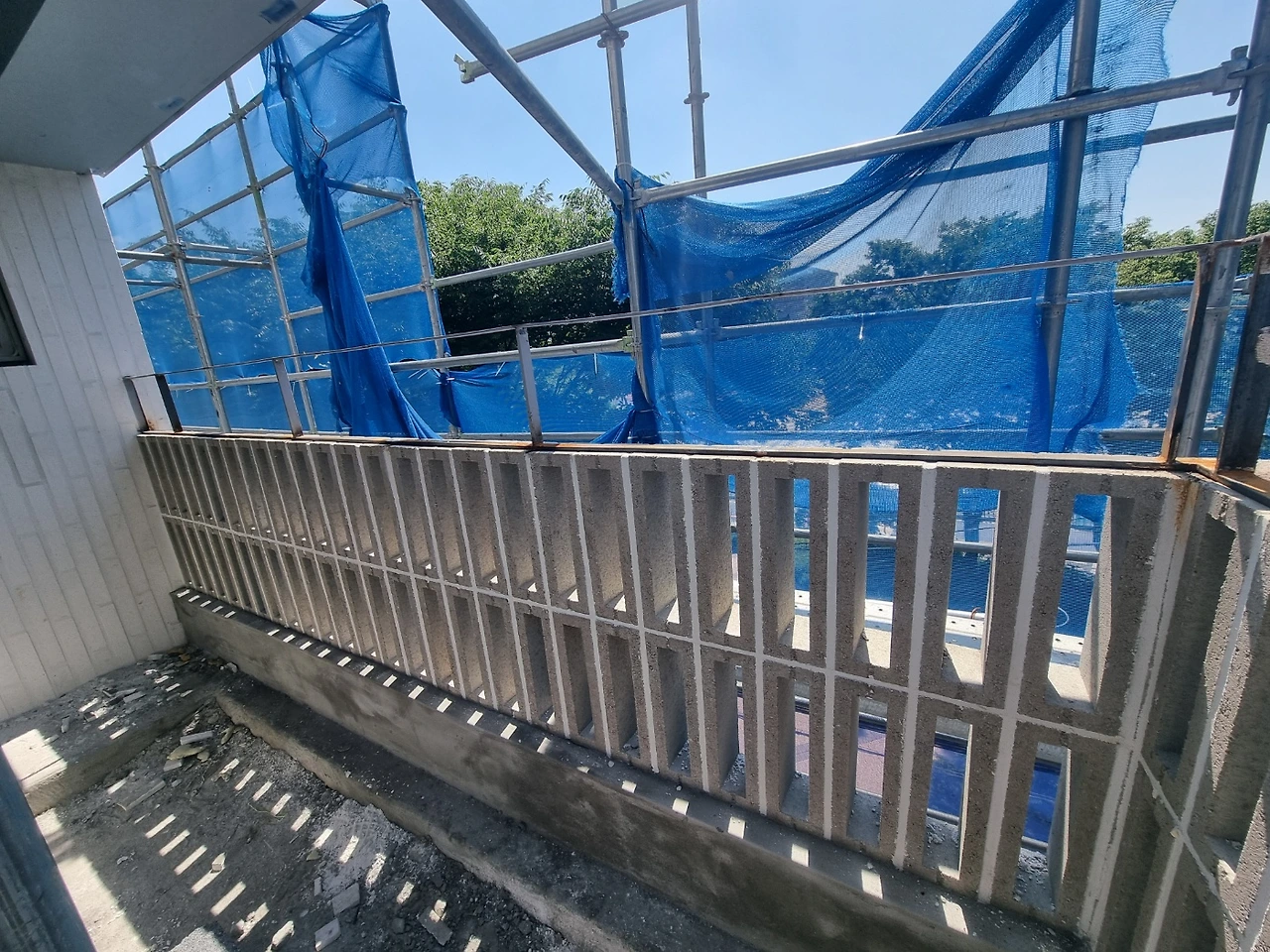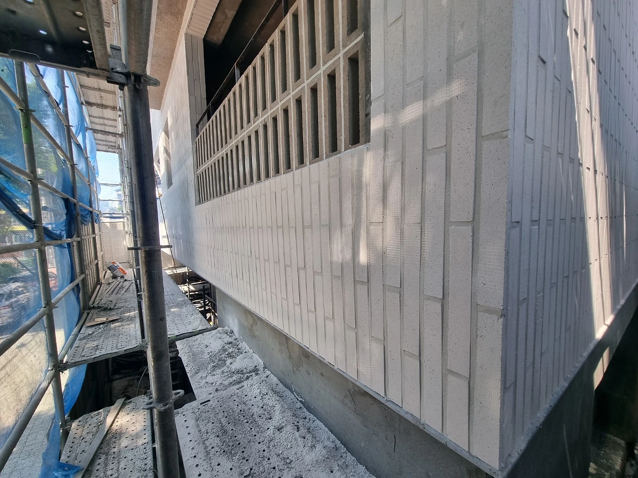 메지까지 외부 벽돌타일 작업이 끝났다. 밝은 외장재와 메지를 선택하다 보니 오염된 뷰분을 포함한 청소작업 후 발수처리가 남았다고 한다.