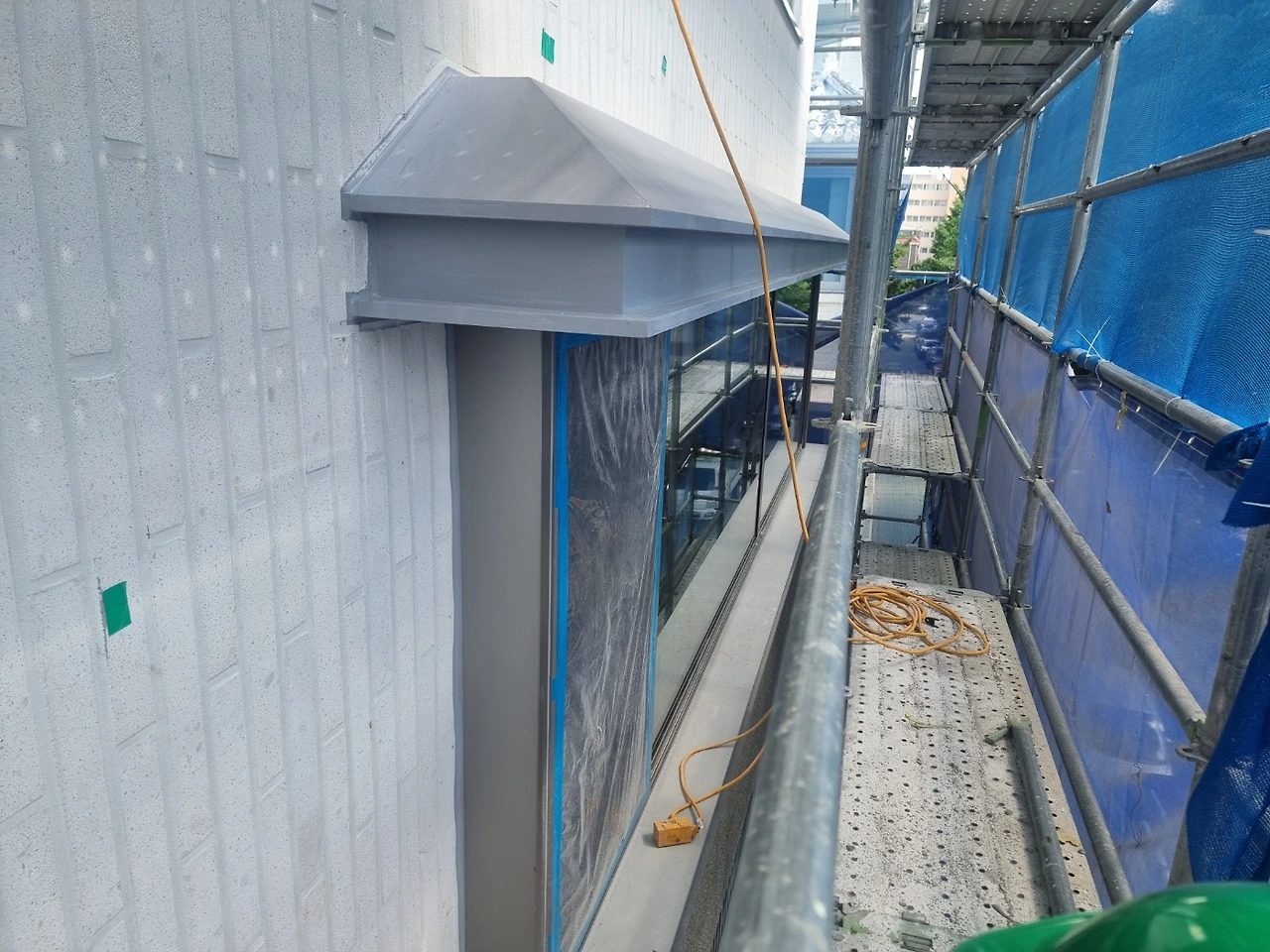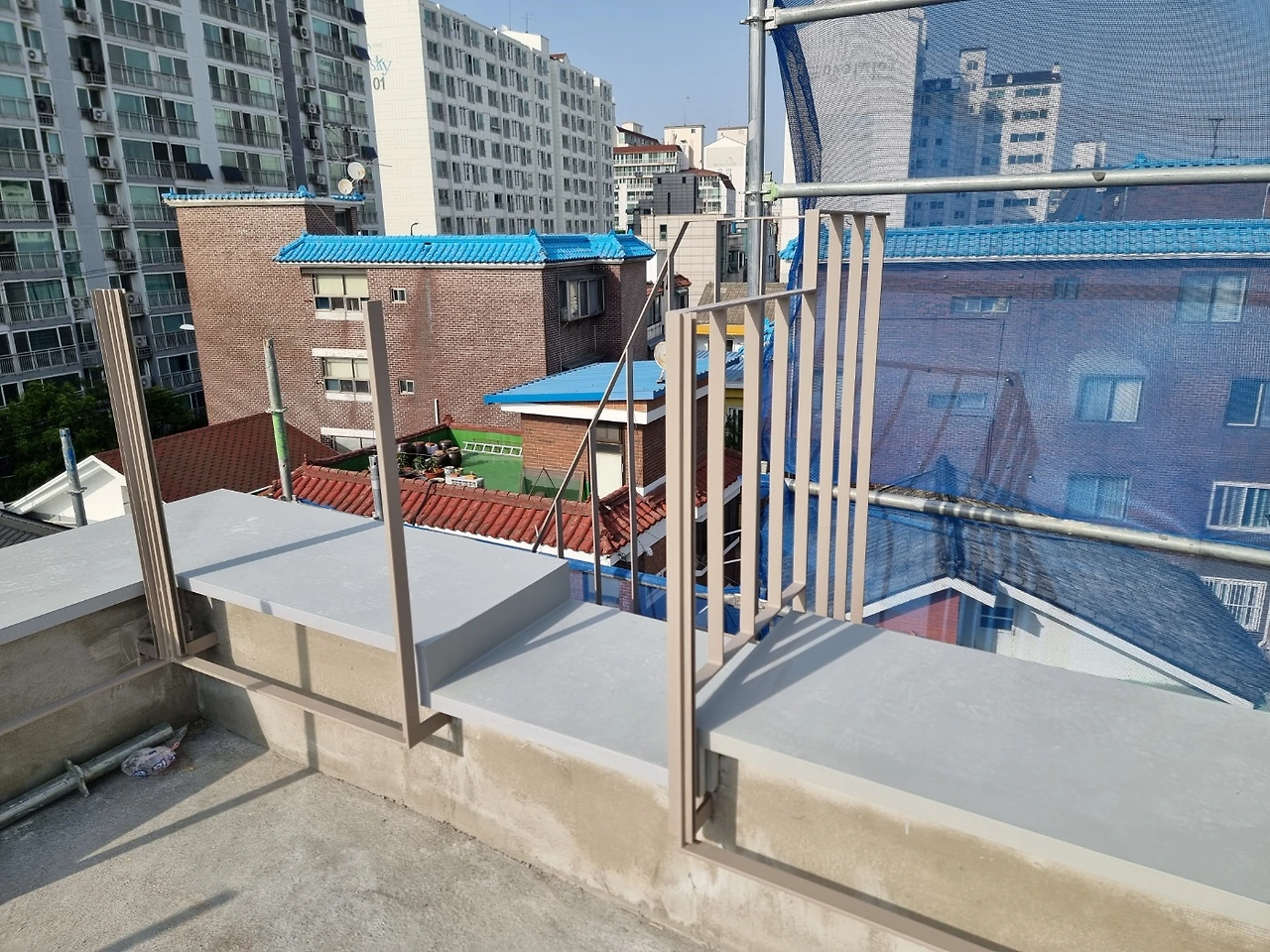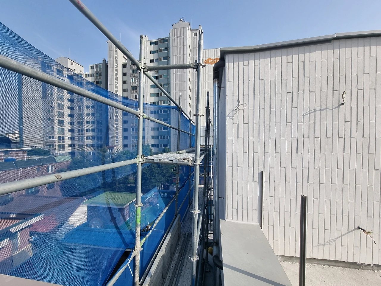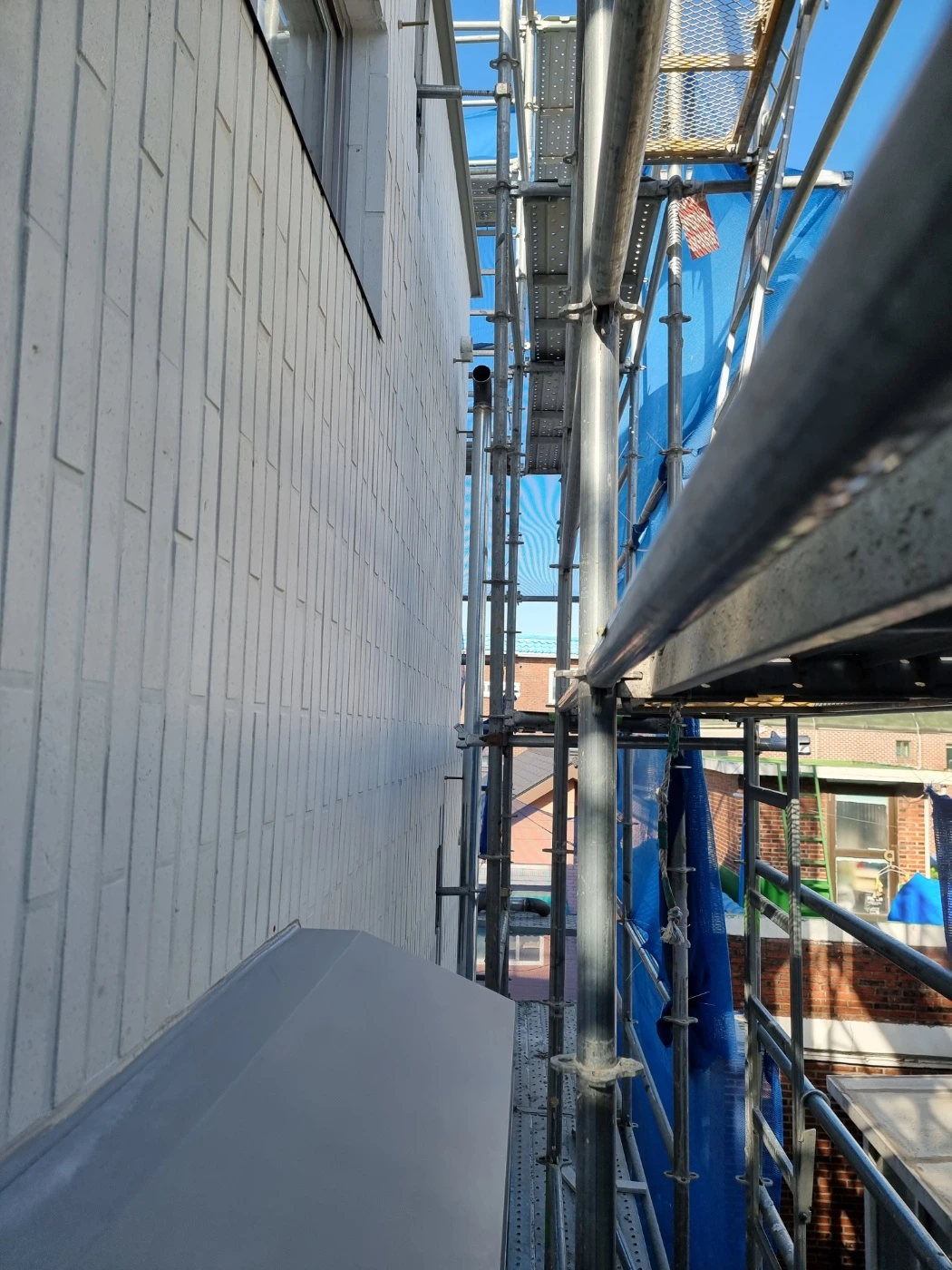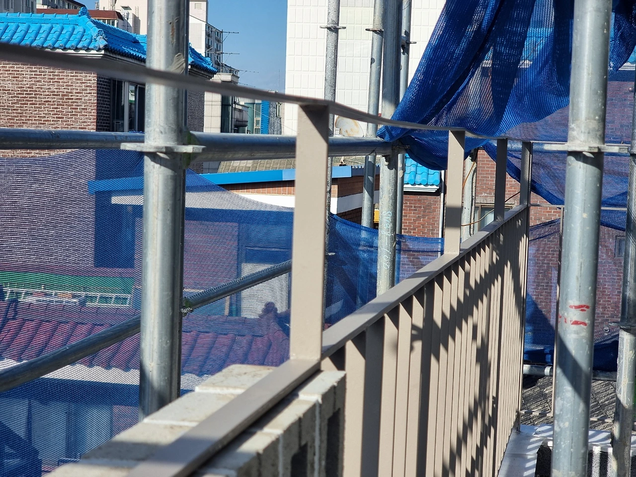 외벽 벽돌타일이 다 붙고 나니 벽에 붙어있거나 벽 위를 지나야 하는 작업들이 이어진다. 도시가스 배관이 설치되고, 비가 올 때 물 끊기를 해서 마감재를 보호하기 위한 후레싱이 창호 주변에 설치되었다. 내일 비가 예정되어 있어 잘 동작하는지 확인할 수 있는 기회가 되겠다. 녹방지를 위한 금속 방청 도장이 계속해서 진행되고 이제 지정컬러로 도장을 앞두고 있다.