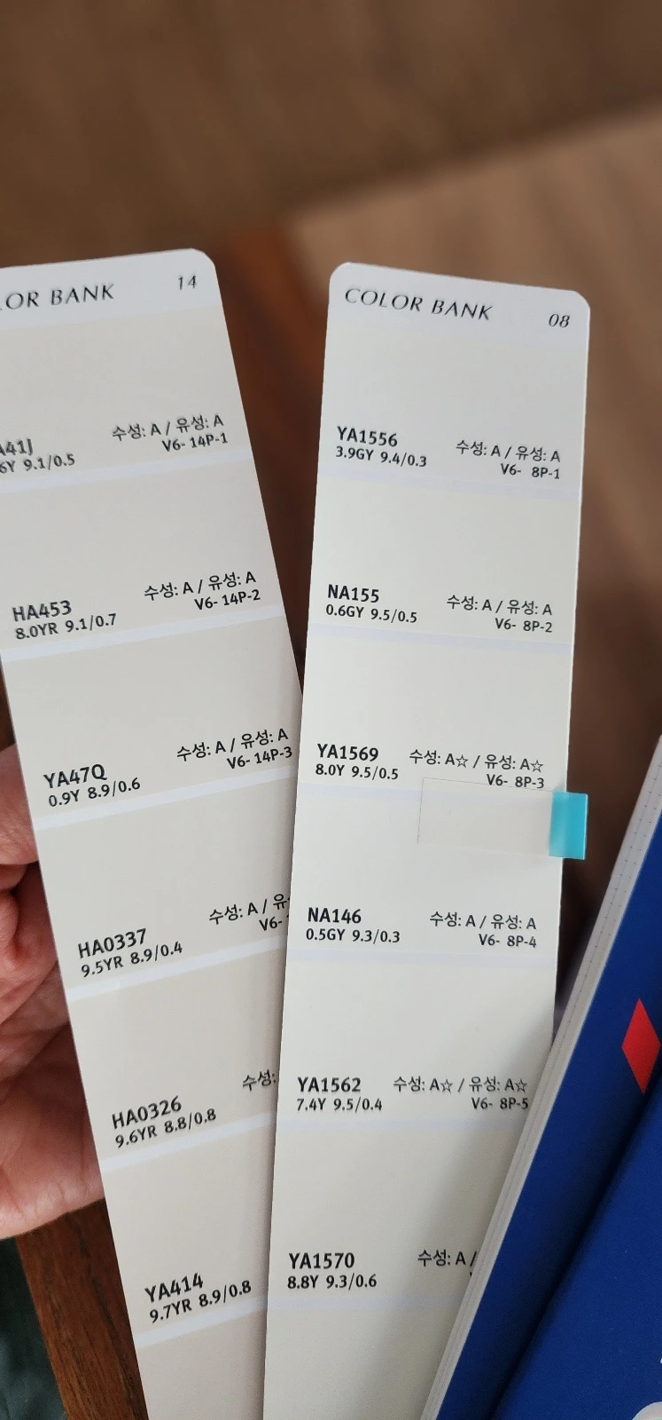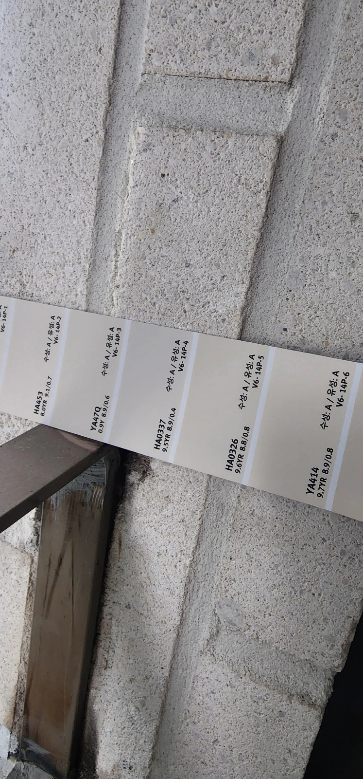 일찍 일어나 건물을 돌아보았다. 그중 눈에 띈 것이 난간 큐블럭 벽돌과 벽돌타일의 색상 차이. 마침 컬러칩을 두고 가셔서 적절한 색상값을 골라보았다. 타일과 난간의 컬러를 맞추는 것이 목적이나 낱장으로 붙인 벽돌타일과 색상을 맞춘다는 게 쉬운 일로 보이진 않는다. 게다가 발수제를 칠하면서 약간의 변화도 있었을 테고. 그럼에도 하나는 푸른빛이 돌 정도로 차가운 화이트이고 또 하나는 베이지와 붉은 기가 약간 섞인 화이트라 꽤 이질적으로 보이기도 하고 건물 전면이라 조정이 필요해 보인다. 색상 차는 별로 없는데 두 색의 느낌이 달라 어정쩡한 인상이 될 수 있어서이다. 딱 맞는 색상을 골라 '나중에 다시 칠하지'라는 생각도 했으나 4층 난간을 보고 얼른 접었다. 벽돌에 페인트 칠을 하는 게 굉장히 고난도의 힘든 작업은 아니겠지만, 그래도 이미 했던 작업을 다시 하자고 얘기하는 건 쉽지가 않다. 게다가 회색 벽돌 위에 칠한 색이 얼마나 잘 먹힐지 모를 일이지만, 비계 위에서 하는 안정적인 작업은 지금이 기회다. 두고두고 후회하지 말고 한번 의논해 보자는 생각으로 조소장님에게 문의 메일을 보내두었다.