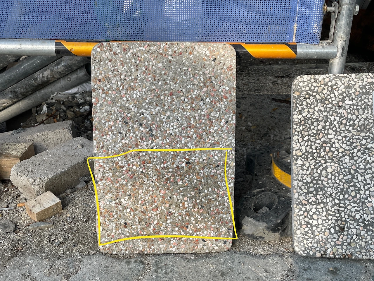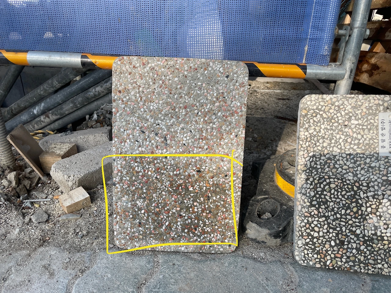 출근길에 잠깐 본 콩자갈 면 보수가 그리 좋은 컨디션으로 보이진 않았다. 자갈색의 도드라짐이 있는 걸로 보이는 반면, 주변 시멘트 위로 백색 얼룩도 또렷하게 드러나 보이는 게 우려가 된다.