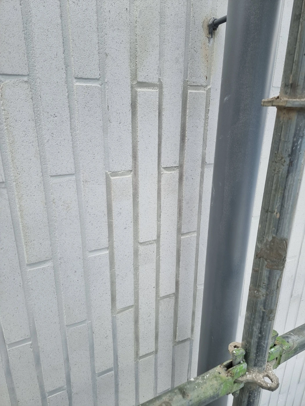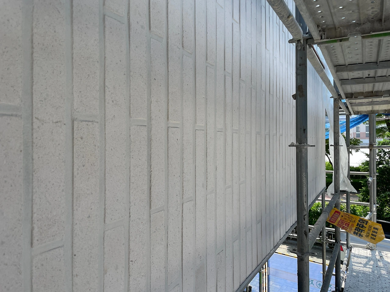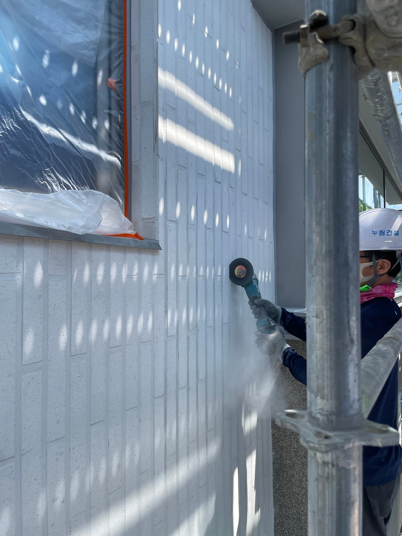 가설재 철거를 앞두고 조소장님이 외벽 전체에 대한 현장감리가 있었다. 가설재가 사라지고 나면 2층 이상은 접근하기도 곤란하고 작업이 어려워질 수밖에 없어 최대한 필요한 점검을 한 모양이다. 특히, 외벽 타일과 메지 색상이 밝다 보니 오염이 눈에 잘 띄기도 해서 집중적으로 확인되었다.