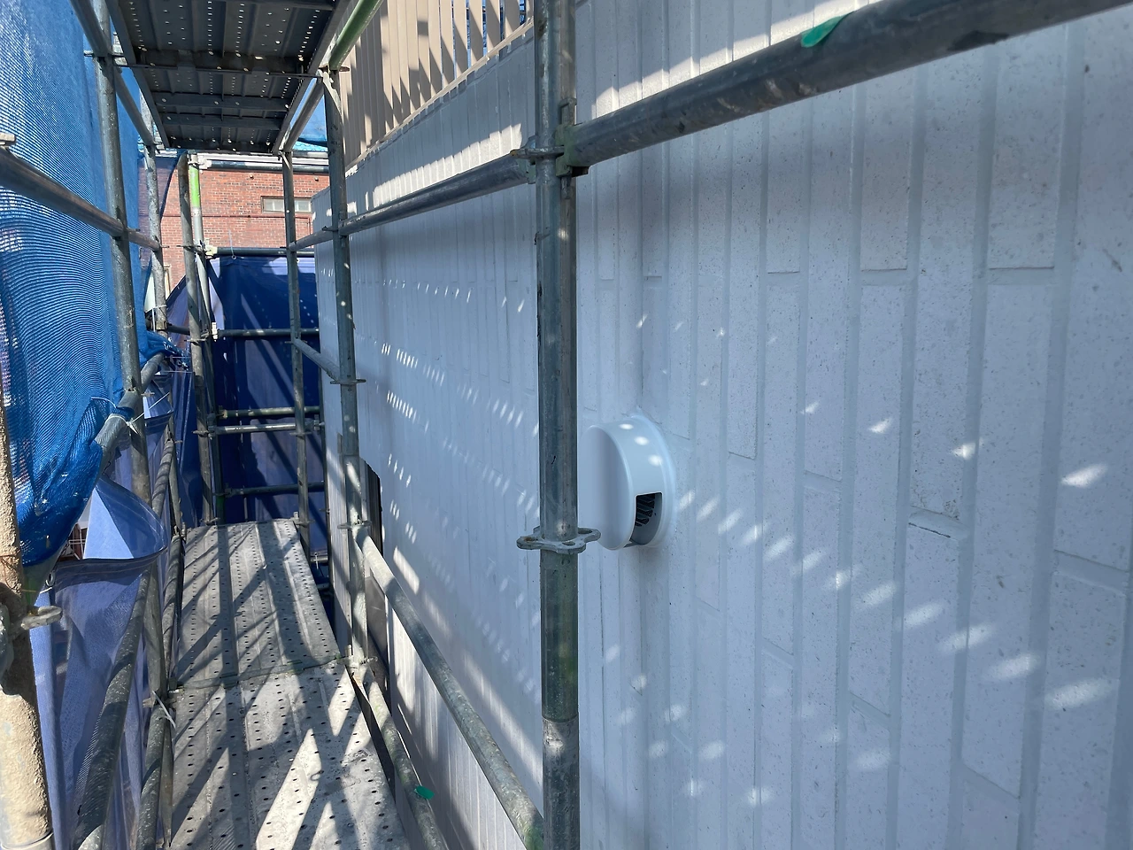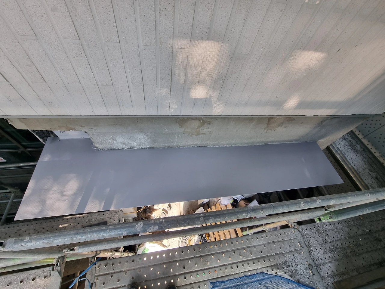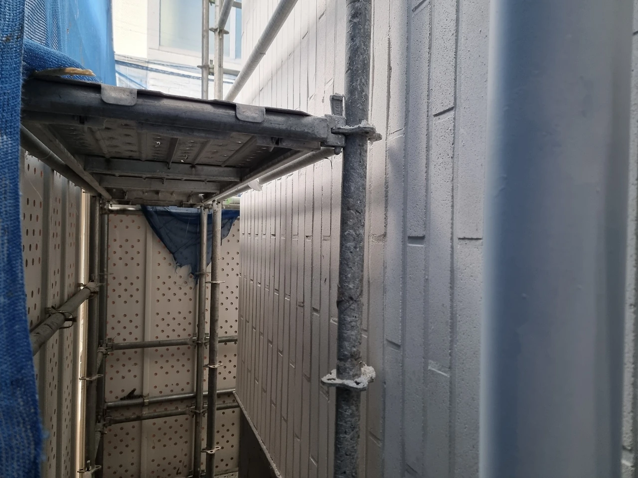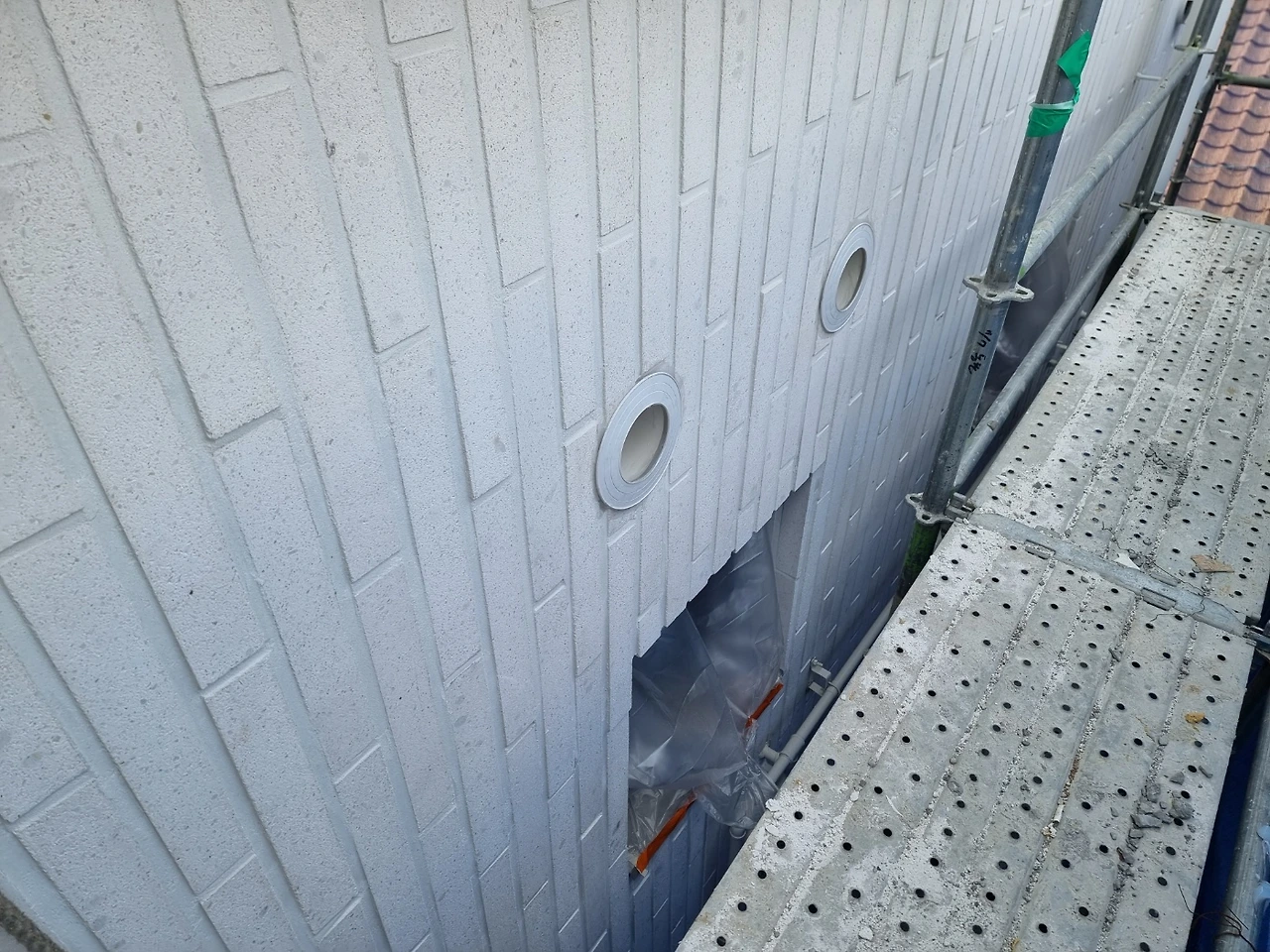 가설재 철거를 앞두고 조소장님이 외벽 전체에 대한 현장감리가 있었다. 가설재가 사라지고 나면 2층 이상은 접근하기도 곤란하고 작업이 어려워질 수밖에 없어 최대한 필요한 점검을 한 모양이다. 특히, 외벽 타일과 메지 색상이 밝다 보니 오염이 눈에 잘 띄기도 해서 집중적으로 확인되었다.