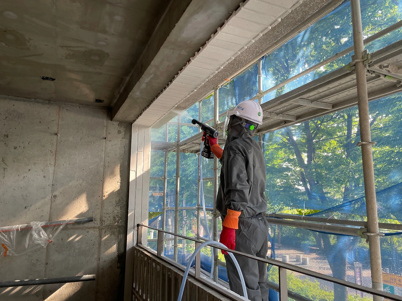오늘은 외벽 전체에 발수제 코팅 작업이 있다. 발수제는 외벽의 오염방지를 위함이고 약 1년가량 효과가 유지된다. 콩자갈 면까지 적용할지 현장에서 고민이 있었는데 벽돌타일에만 하는 것으로 결정했다.