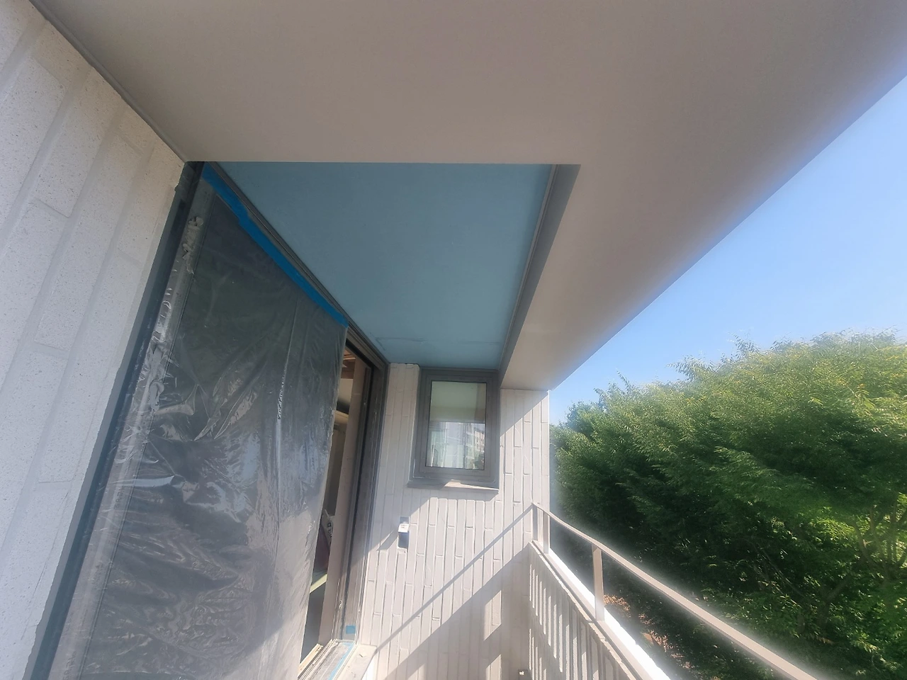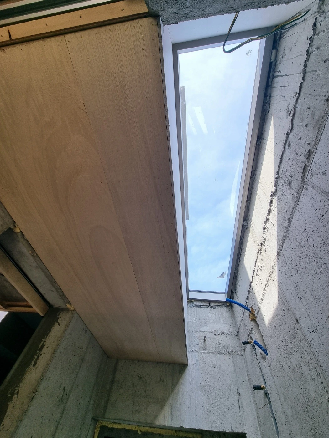 붙박이장 천장 설치가 되고 나니 상상과 현실의 괴리가 느껴진다. 계단실 쪽 복도가 좁은 만큼 창을 면한 서재로 들어오는 채광을 나눠주고 서로 연결된 느낌을 주도록 천장을 띄우고 유리를 넣기로 했는데, 작업 후 장 높이가 올라가고 붙박이장 깊이만큼 상부가 길어지니 원래 의도한 효과가 실제로 있을지 감이 잘 오질 않는다. 오히려 서재 쪽은 천장과 분리되다 보니 붙박이장이 강조되면서 공간이 좁아 보이는 듯한 인상도 있다. 보자마자 '천장까지 올렸어야 했나?'라는 생각이 스쳤지만, 계단실 입장에서는 내가 상상하지 못할 뿐 '어떤' 효과가 있을지도 모르니 기다려 보기로 한다.