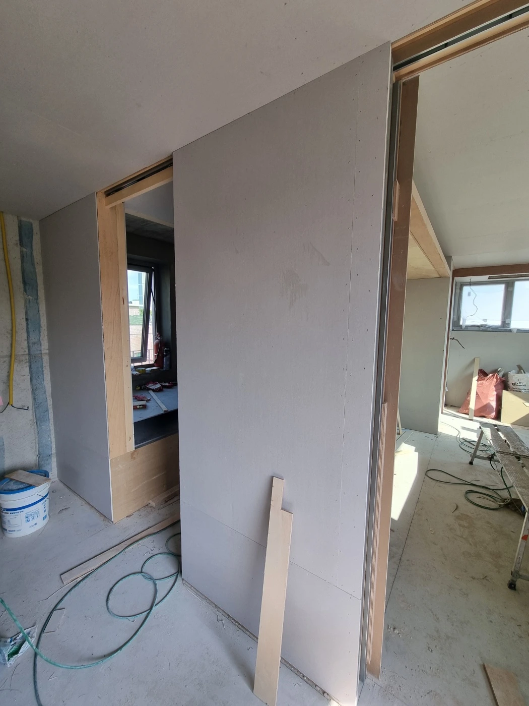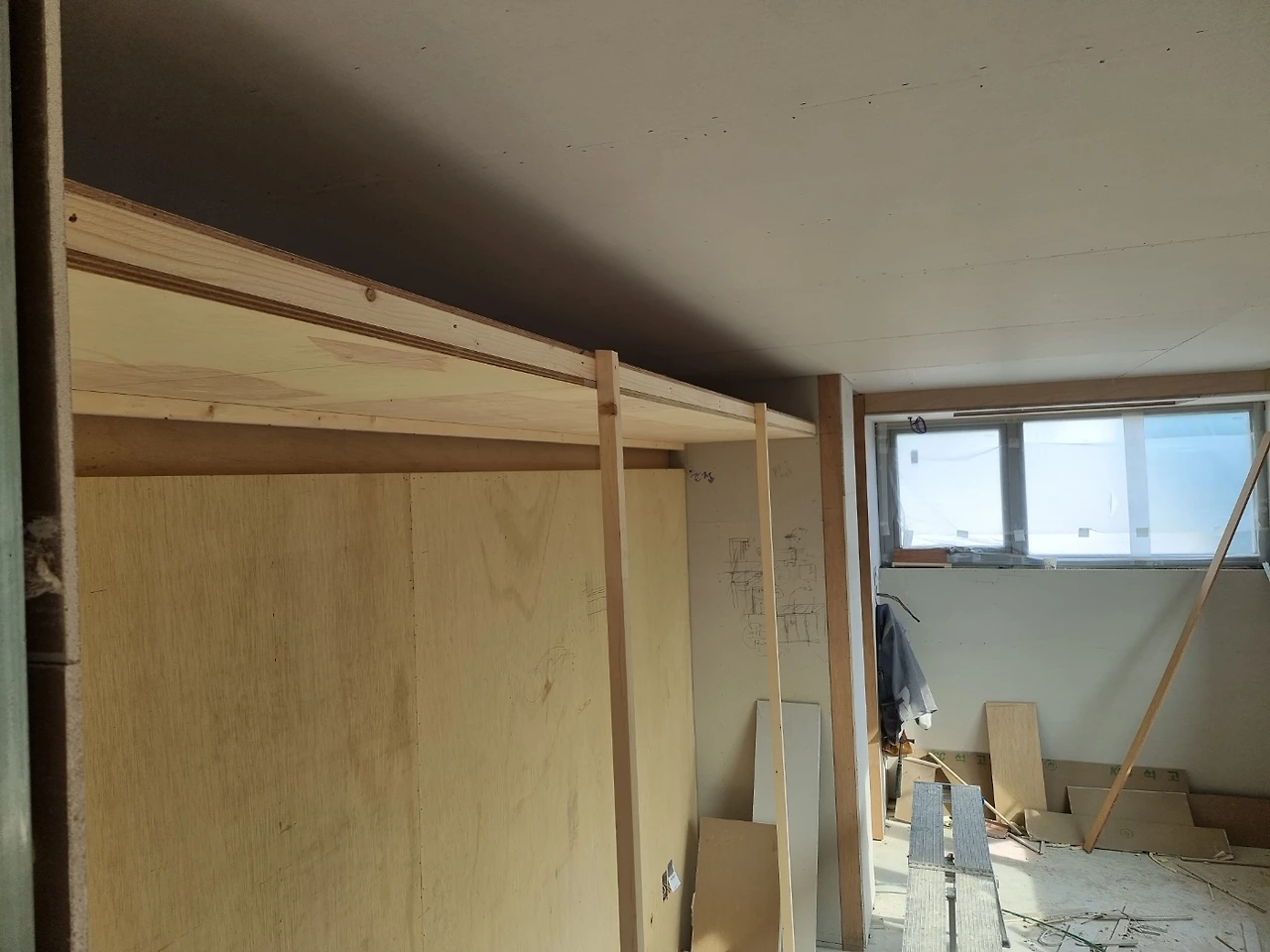공간에 맞게 붙박이장 넣는 걸 검토했다가 가구 제작비용이 크게 나와 이케아 팍스(PAX) 시스템 옷장을 넣고 SKYTTA 슬라이딩 도어를 넣기로 했다. 4층은 상부가 열린 구조라 내부 틀을 붙박이 업체에 별도로 주문하려다가 내부 목공팀과 의논해 뚫린 부분을 간단히 막기로 했다. 작업을 진행하다 보니 상부가 열려있는 상태에 슬라이딩 도어를 다는 게 구조적으로 안정적이지 않다 판단되어 지지대를 추가하여 마감하기로 했다. 아무래도 공간에 맞게 제작하면 딱 맞게 마무리는 되겠으나, 시스템 가구만큼 내부 구성이 다양하지는 못할 거라 쓰임새를 생각해서 변경했다.