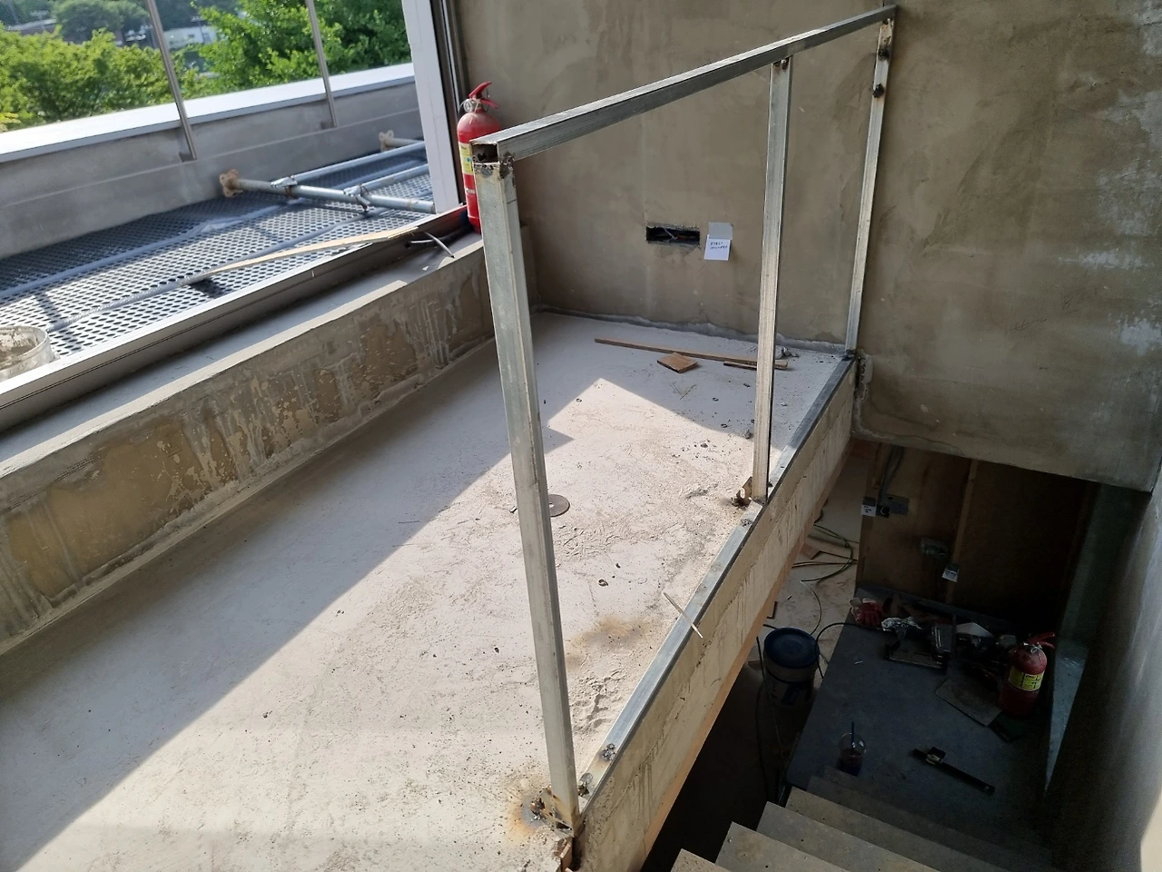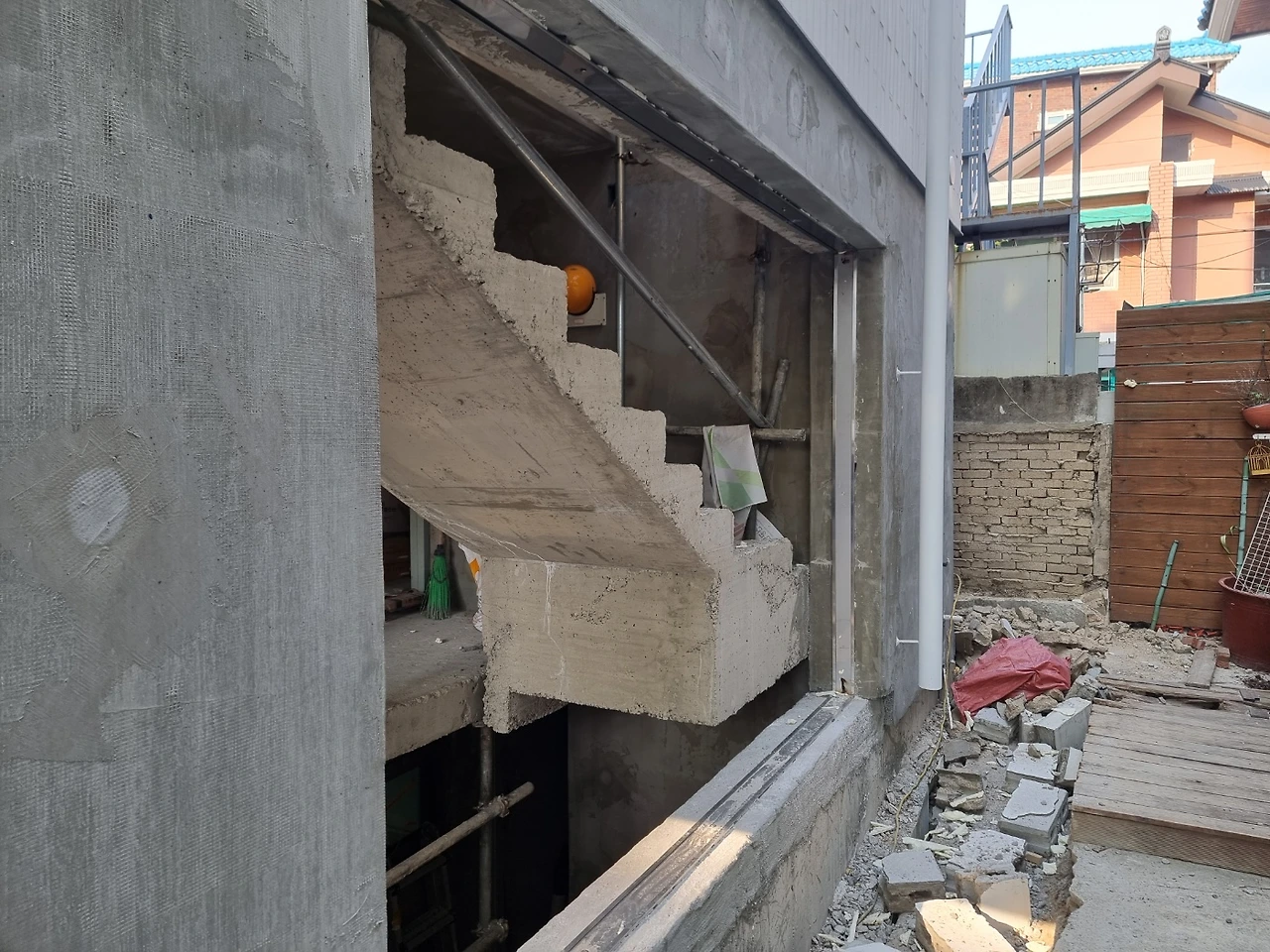 내부에는 금속난간이 추가되면서 계단실이 모습을 갖춰가고 있다. 더불어 유리블럭 설치를 위한 프레임 작업도 진행되었다. 마치 기성품을 붙인 것처럼 딱 떨어지는 형태라 보기가 참 좋다. 한번 더 에이스 인증!