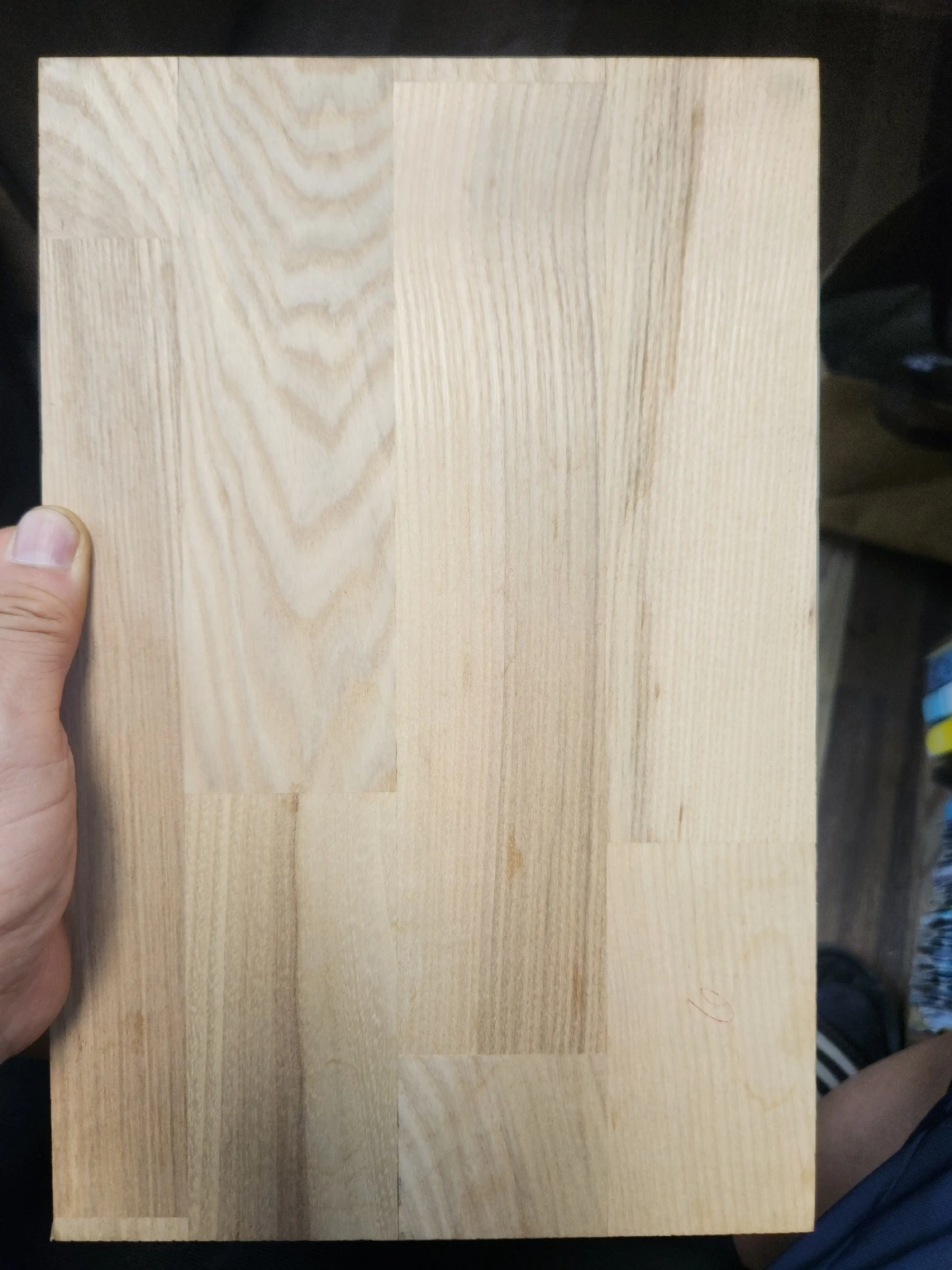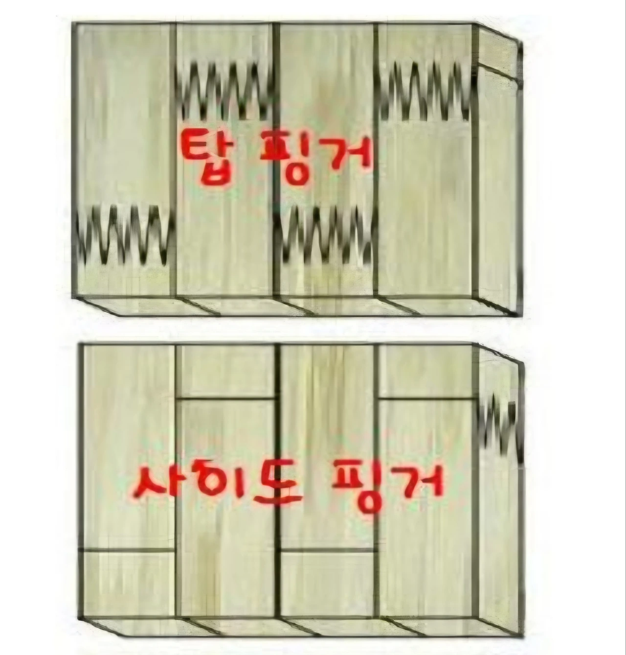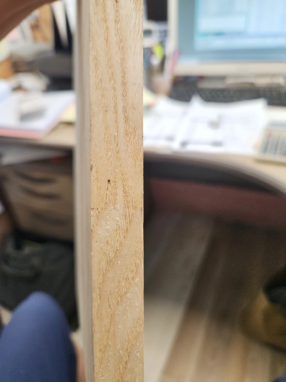 창틀 앞의 창대목과 금속 계단 위에는 25T, 30T의 목재가 올라간다. 전체적으로 오크를 쓰고 있고 가격면에서 경제적인 집성목이 자재로 정해져 있다. 집성목은 원목을 연결해서 붙인 판재라 고른 패턴이 아니지만, 뒤틀림이나 갈리짐은 더 적다고 한다. 바로 붙이는 솔리티 타입과 톱니바퀴 모양으로 양쪽에서 끼워 맞추는 핑거 조인트 방식이 있고, 탑 핑거는 상판에 조인트 부위가 보이고 사이드 핑거는 상판은 솔리드로 붙인 것처럼 보이고 옆면에 접합 부위가 보인다. 상판에서 보면 집성된 원목 패턴이 이미 복잡하게 이어지므로 접합은 사이드 핑거가 심플해 보인다 (이후 반입된 실제 자재를 보니 퀄리티가 꽤 좋다. 역시 천연자재는 일정 수준 이상은 되나 보다).