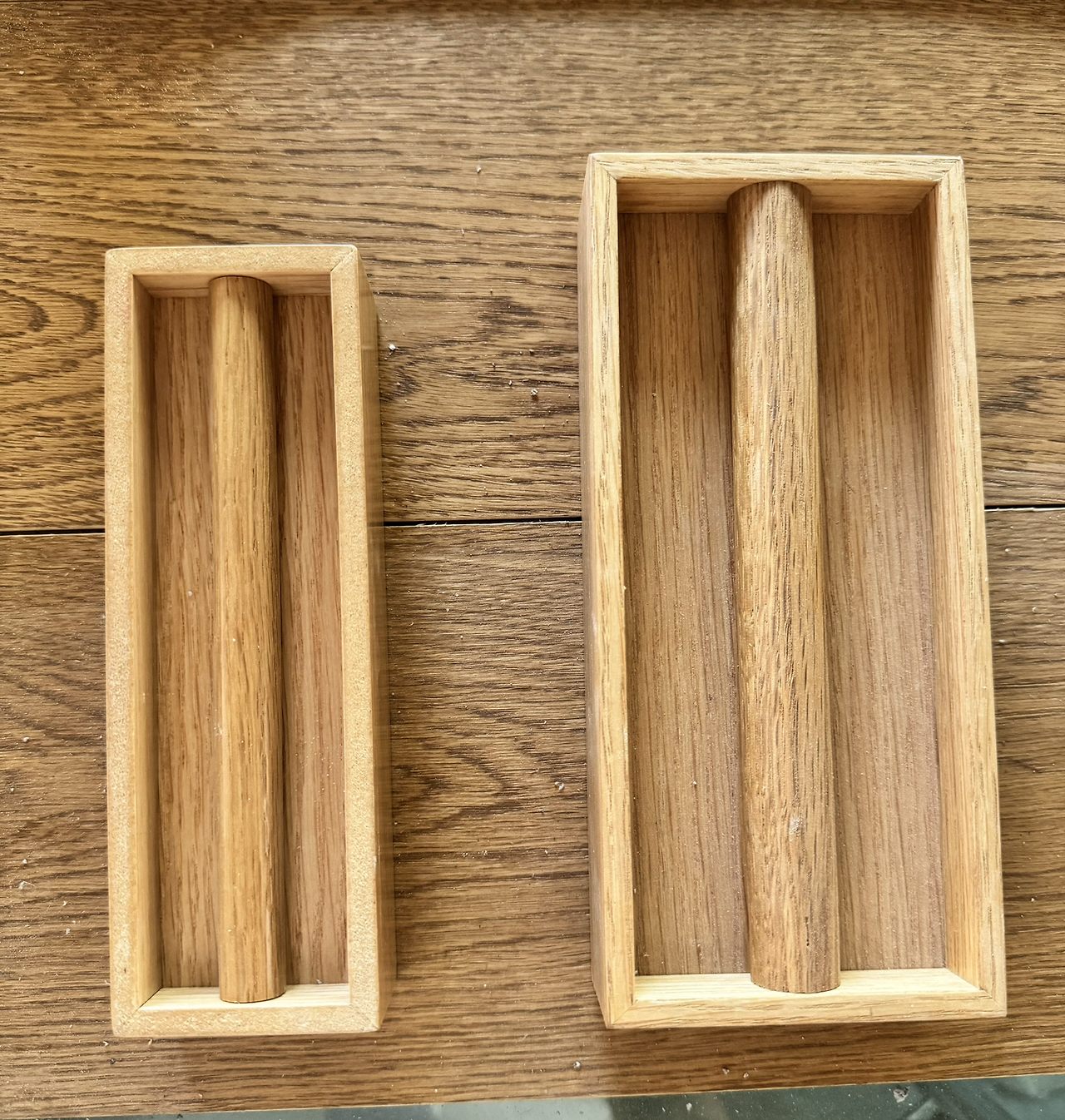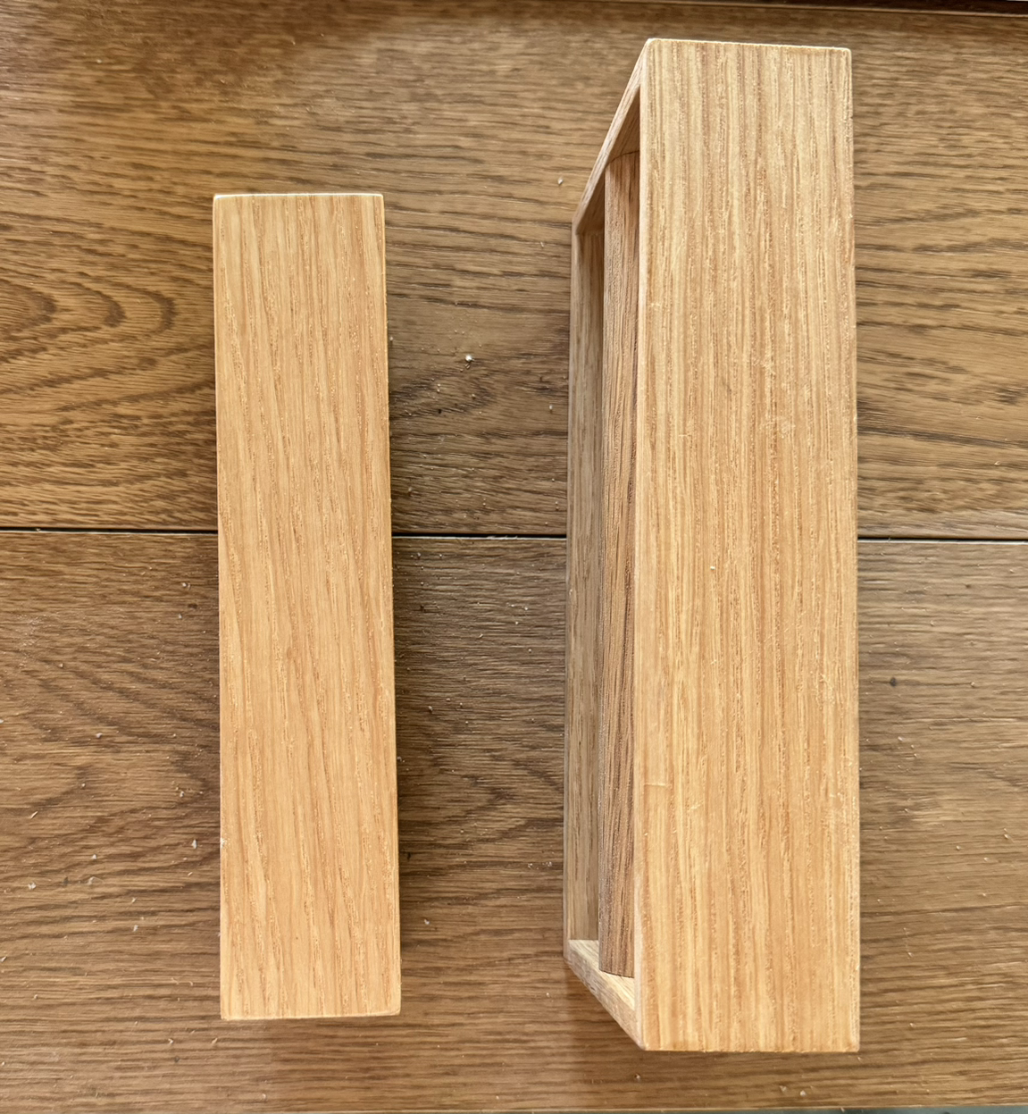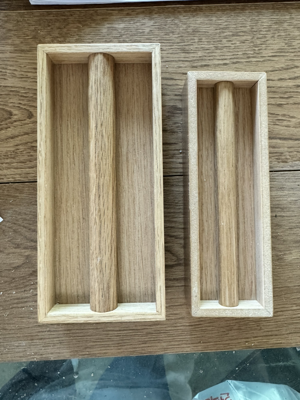 창틀 앞의 창대목과 금속 계단 위에는 25T, 30T의 목재가 올라간다. 전체적으로 오크를 쓰고 있고 가격면에서 경제적인 집성목이 자재로 정해져 있다. 집성목은 원목을 연결해서 붙인 판재라 고른 패턴이 아니지만, 뒤틀림이나 갈리짐은 더 적다고 한다. 바로 붙이는 솔리티 타입과 톱니바퀴 모양으로 양쪽에서 끼워 맞추는 핑거 조인트 방식이 있고, 탑 핑거는 상판에 조인트 부위가 보이고 사이드 핑거는 상판은 솔리드로 붙인 것처럼 보이고 옆면에 접합 부위가 보인다. 상판에서 보면 집성된 원목 패턴이 이미 복잡하게 이어지므로 접합은 사이드 핑거가 심플해 보인다 (이후 반입된 실제 자재를 보니 퀄리티가 꽤 좋다. 역시 천연자재는 일정 수준 이상은 되나 보다).