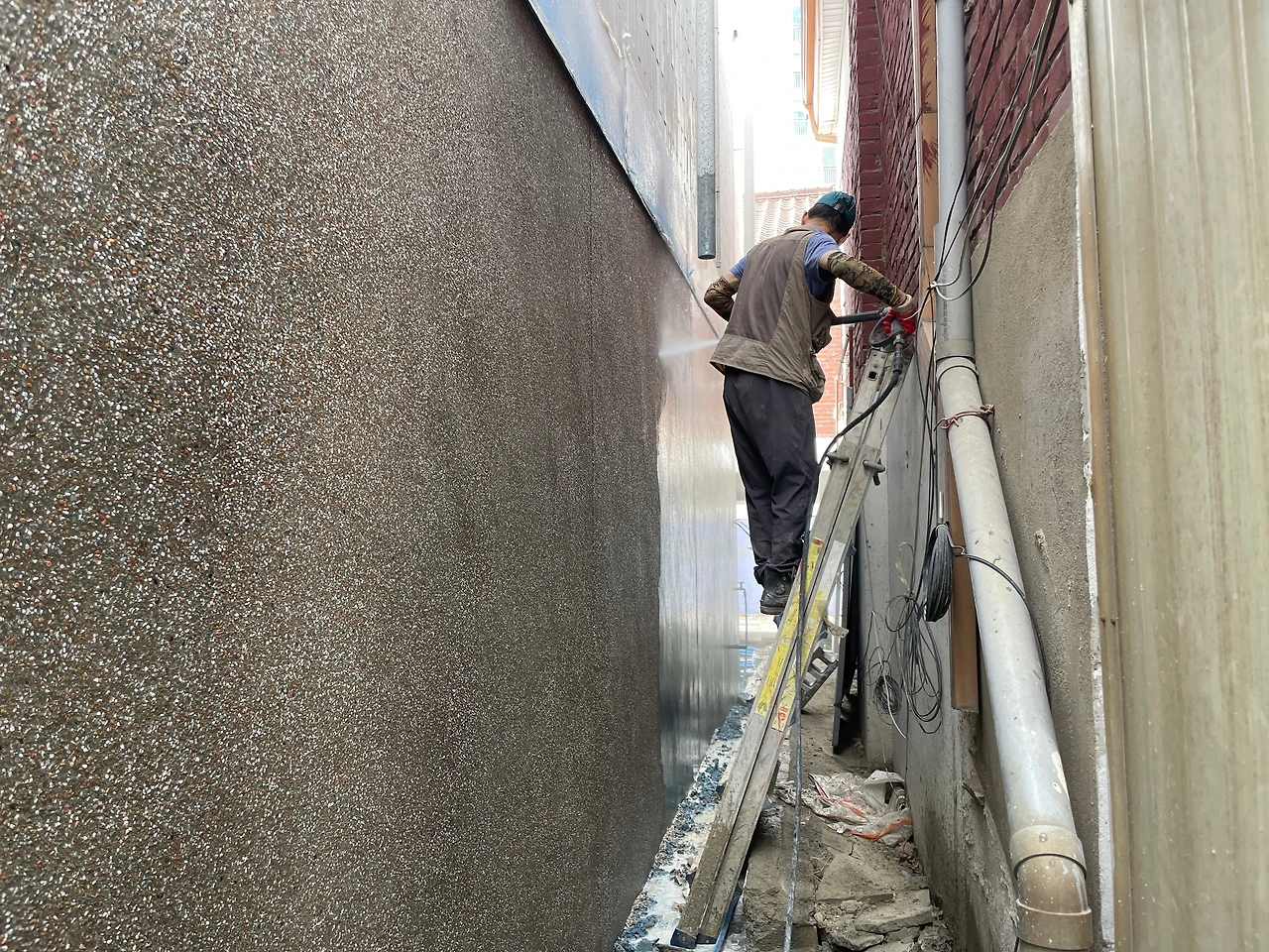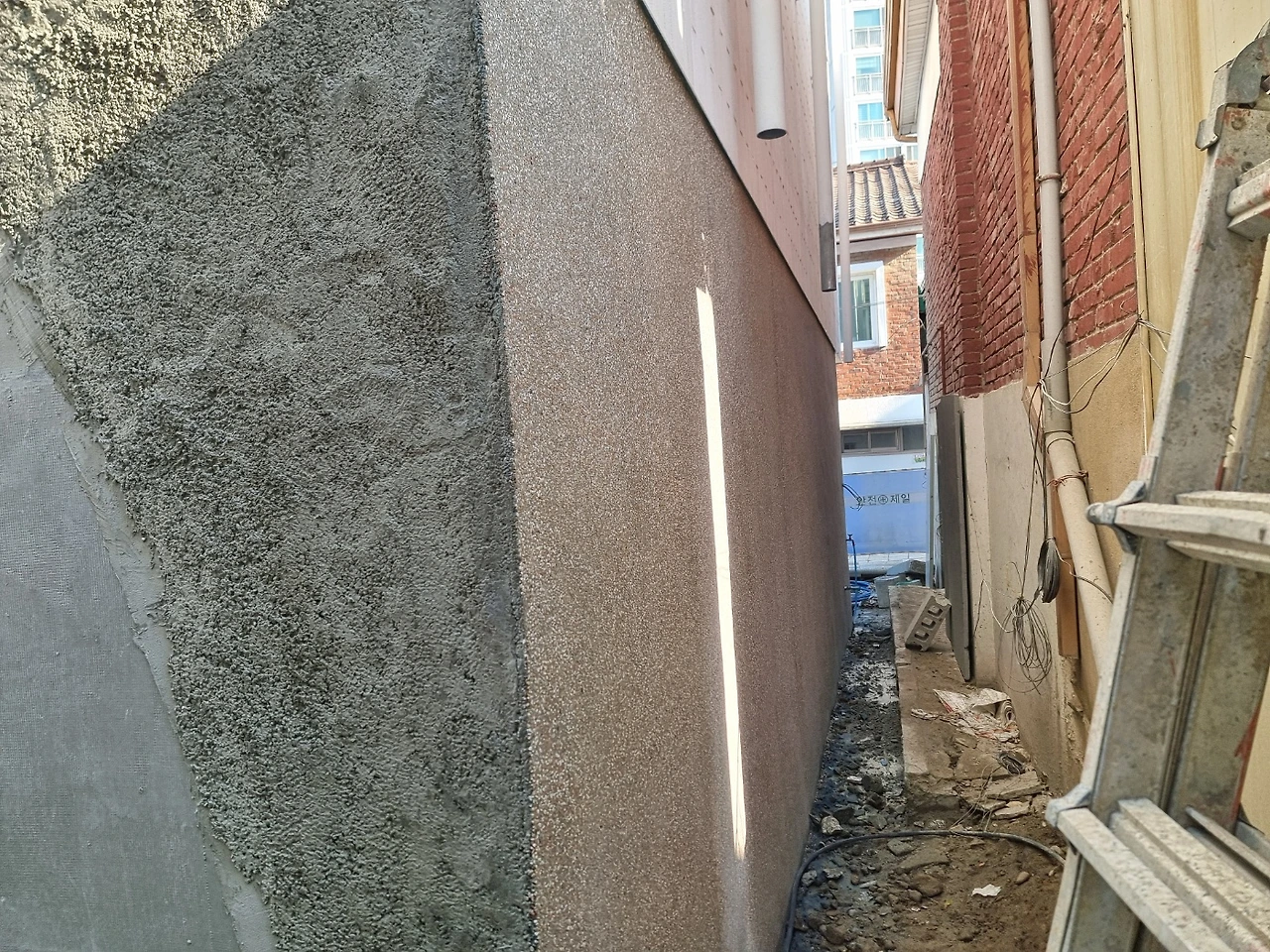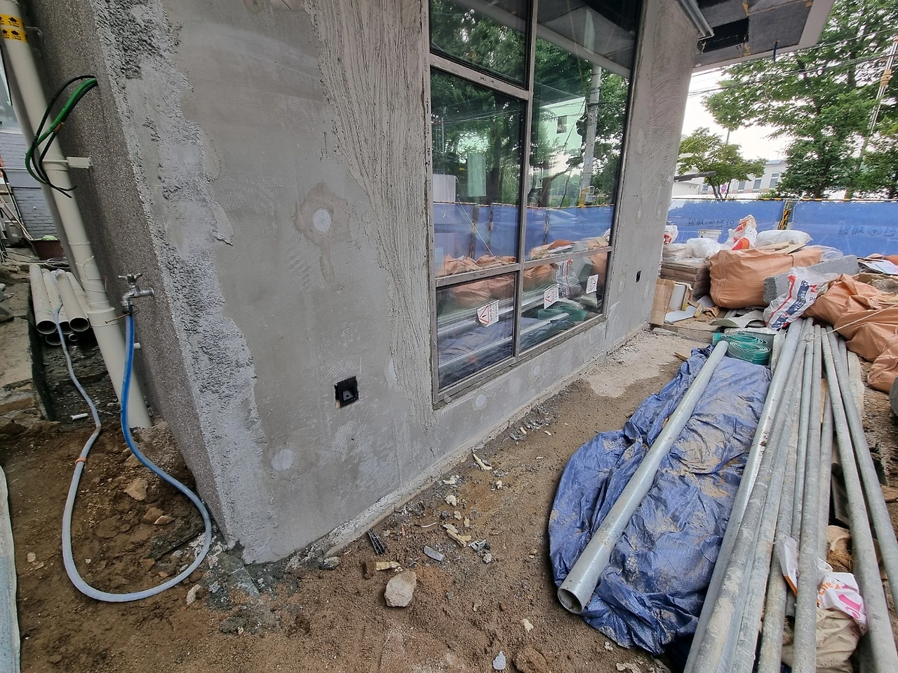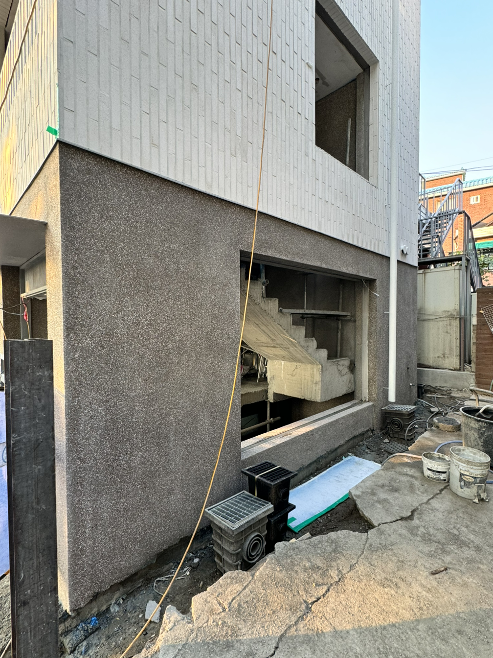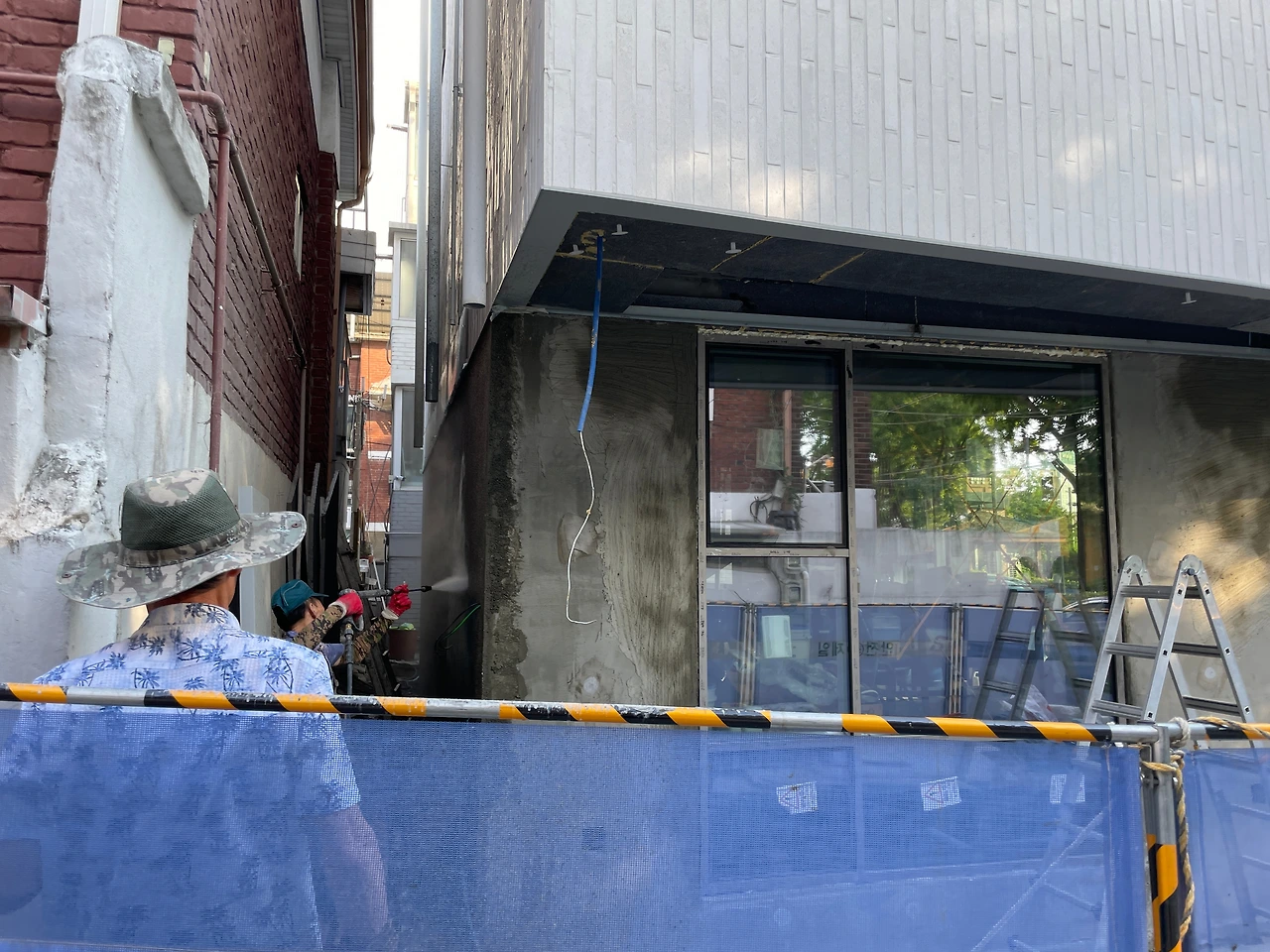 이른 아침부터 각 층이 바삐 돌아가기 시작했다. 마감되지 않은 채 콘크리트 노출로 남아있던 외벽에 콩자갈 미장 작업이 시작되었다. 다행히 날씨도 함께 돕는지 무덥지 않고 시원한 공기가 반가운 날이다. 콩자갈 미장(아라이 다시 / 미장 후 물로 표면을 씻어내어 자갈이 드러나도록 하는 마감공법)은 미장 후 '적절한 타이밍'에 맞춰 살수세척으로 표면을 씻어내야 결과물이 고르게 잘 나오기 때문에 날씨와 습도가 영향을 미친다고 한다. 오늘은 건물 후면작업이라 햇빛이 덜 들기도 하고 날씨도 쾌적한 편이라 결과가 아주 잘 나왔다. 뒷집이 바로 인접하기도 하고 상대적으로 눈에 띄지 않는 건물 뒤편인 게 아쉬울 정도이다. 1층 외벽 전체와 지하와 2층으로 이어지는 계단실 내부 벽을 모두 콩자갈 미장으로 마감할 텐데 남은 공간도 이 정도의 완성도이면 더할 나위 없을 듯하다.