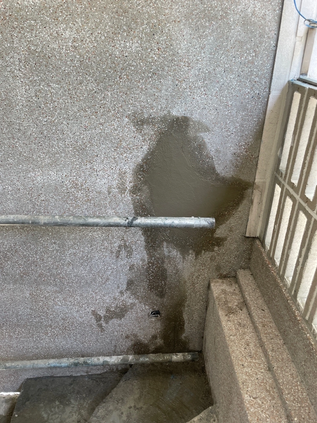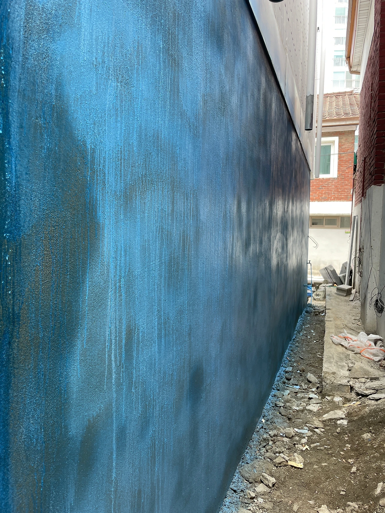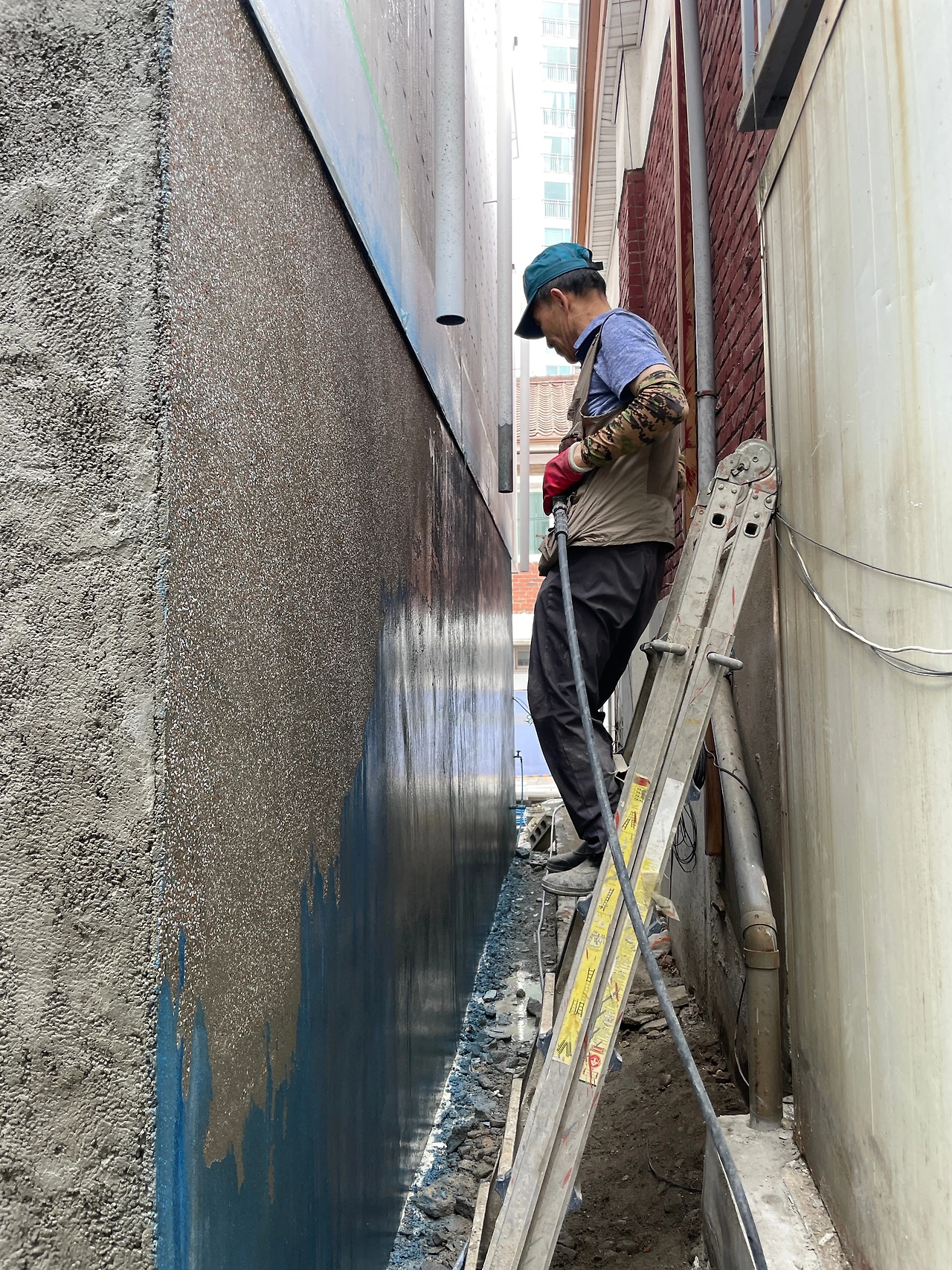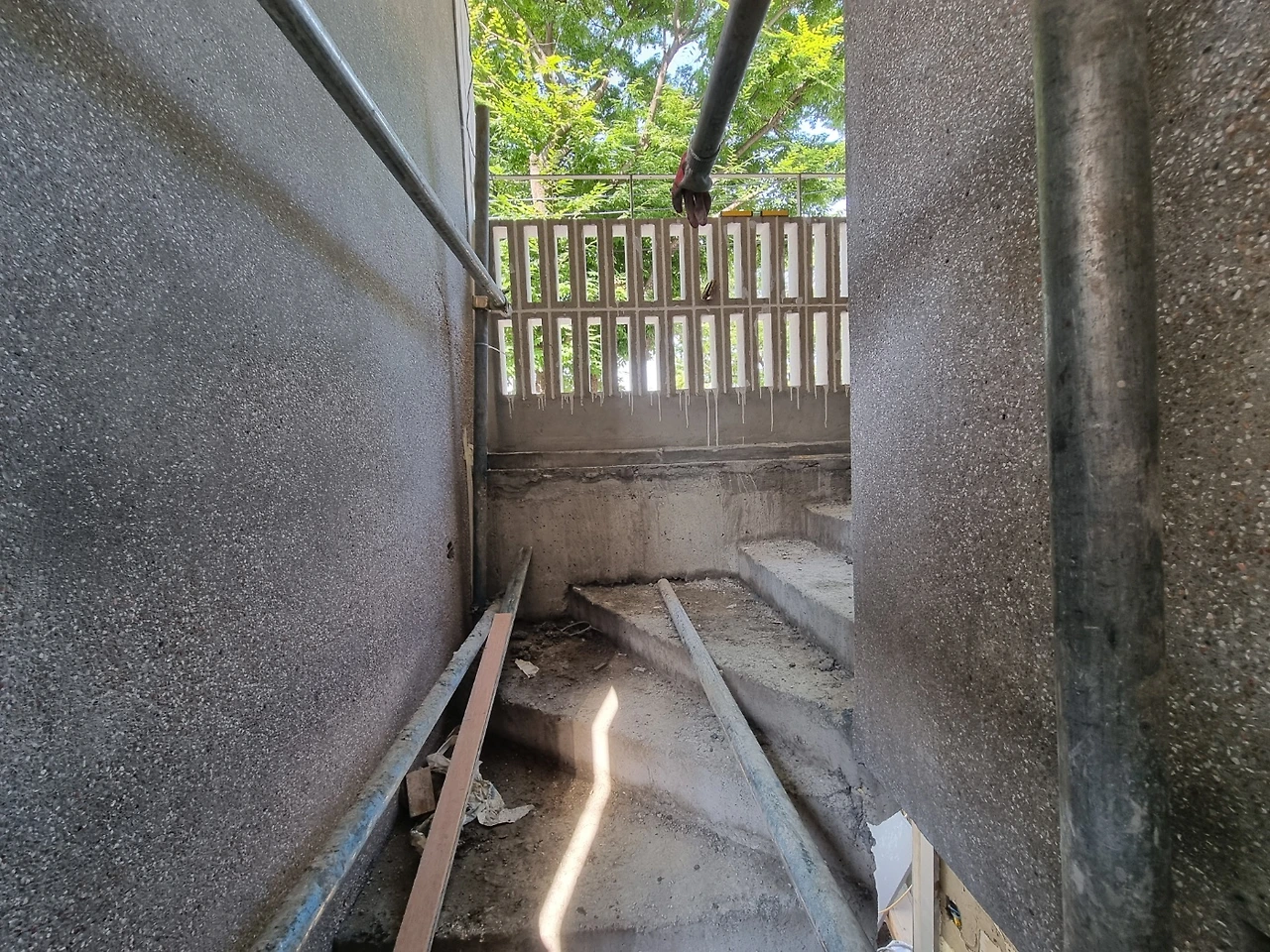 이른 아침부터 각 층이 바삐 돌아가기 시작했다. 마감되지 않은 채 콘크리트 노출로 남아있던 외벽에 콩자갈 미장 작업이 시작되었다. 다행히 날씨도 함께 돕는지 무덥지 않고 시원한 공기가 반가운 날이다. 콩자갈 미장(아라이 다시 / 미장 후 물로 표면을 씻어내어 자갈이 드러나도록 하는 마감공법)은 미장 후 '적절한 타이밍'에 맞춰 살수세척으로 표면을 씻어내야 결과물이 고르게 잘 나오기 때문에 날씨와 습도가 영향을 미친다고 한다. 오늘은 건물 후면작업이라 햇빛이 덜 들기도 하고 날씨도 쾌적한 편이라 결과가 아주 잘 나왔다. 뒷집이 바로 인접하기도 하고 상대적으로 눈에 띄지 않는 건물 뒤편인 게 아쉬울 정도이다. 1층 외벽 전체와 지하와 2층으로 이어지는 계단실 내부 벽을 모두 콩자갈 미장으로 마감할 텐데 남은 공간도 이 정도의 완성도이면 더할 나위 없을 듯하다.