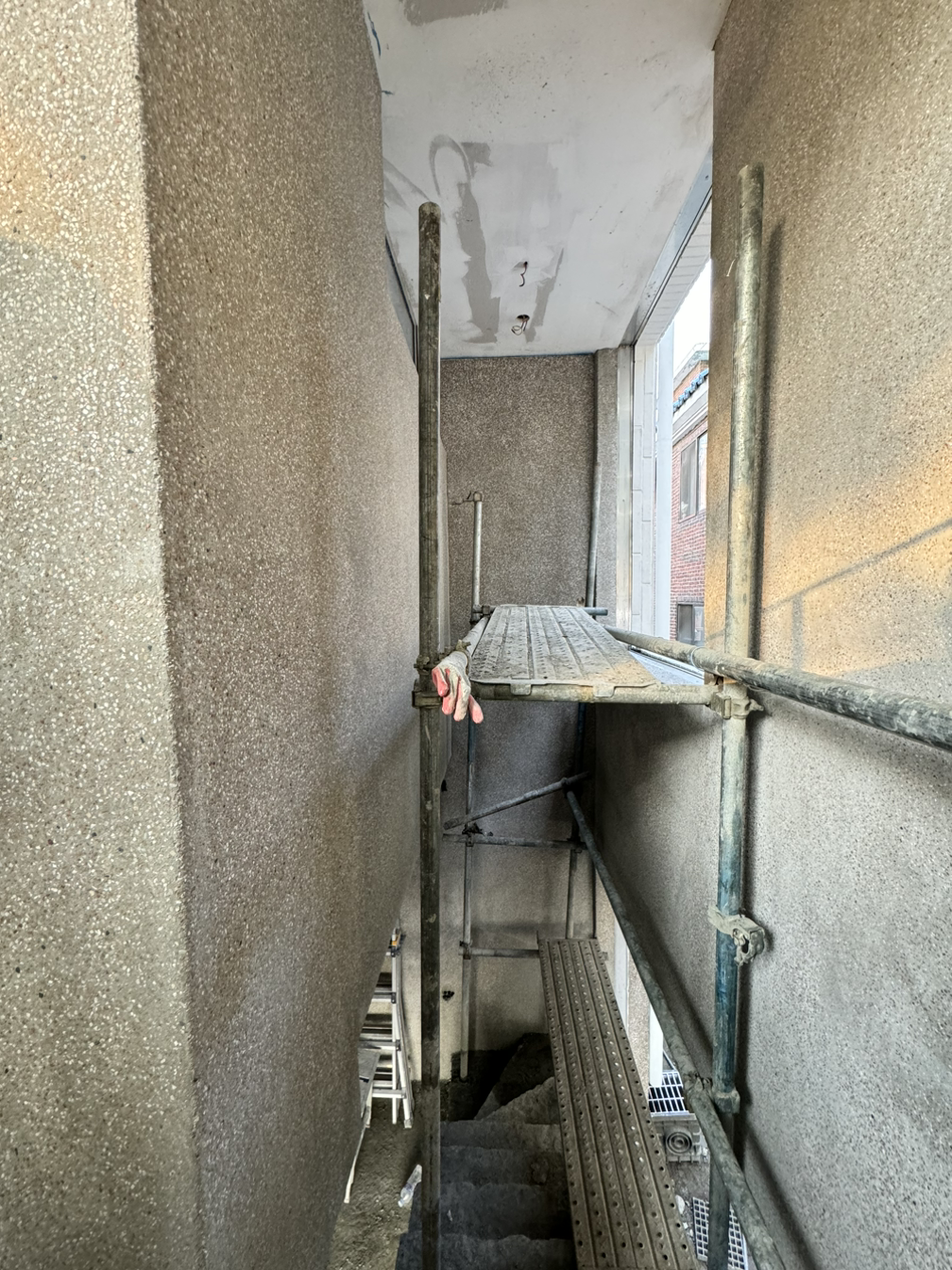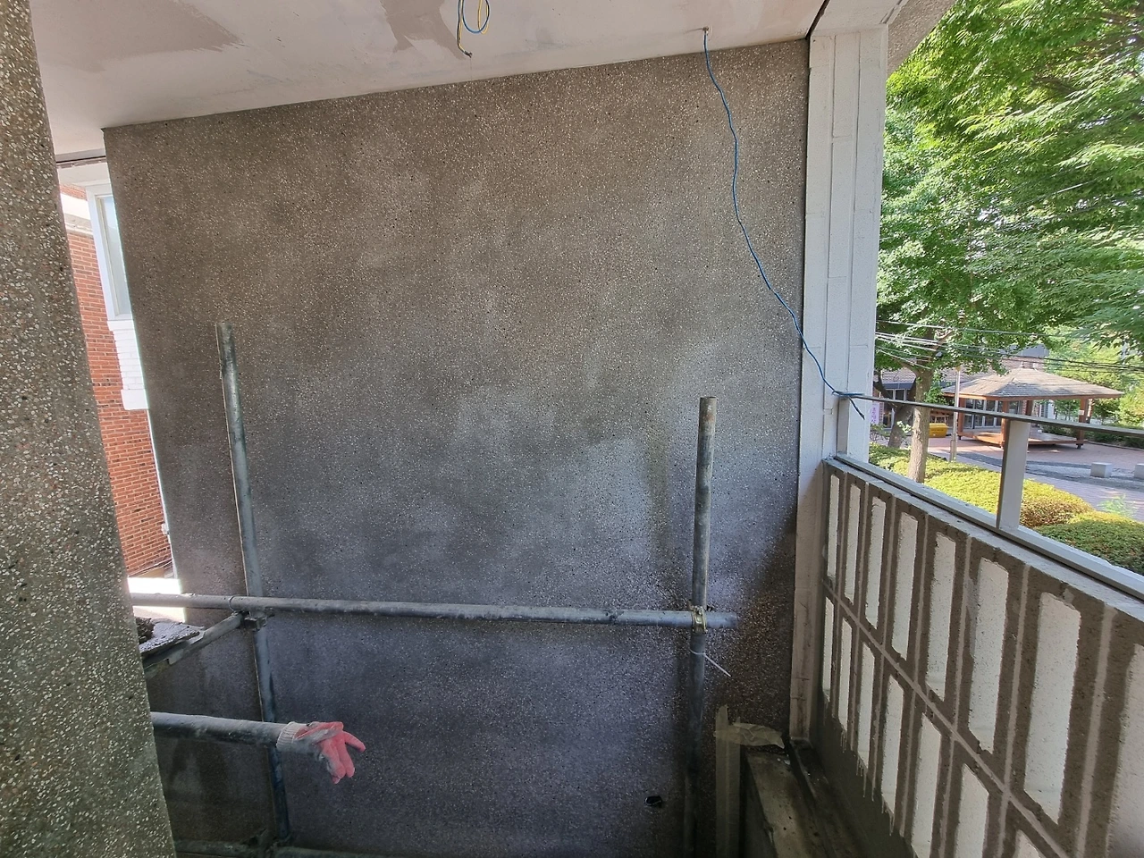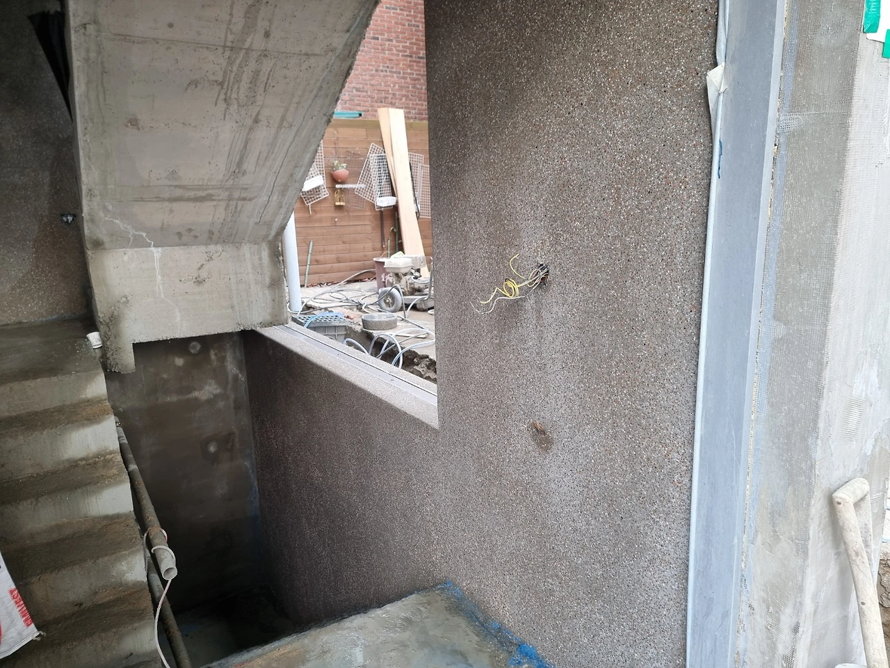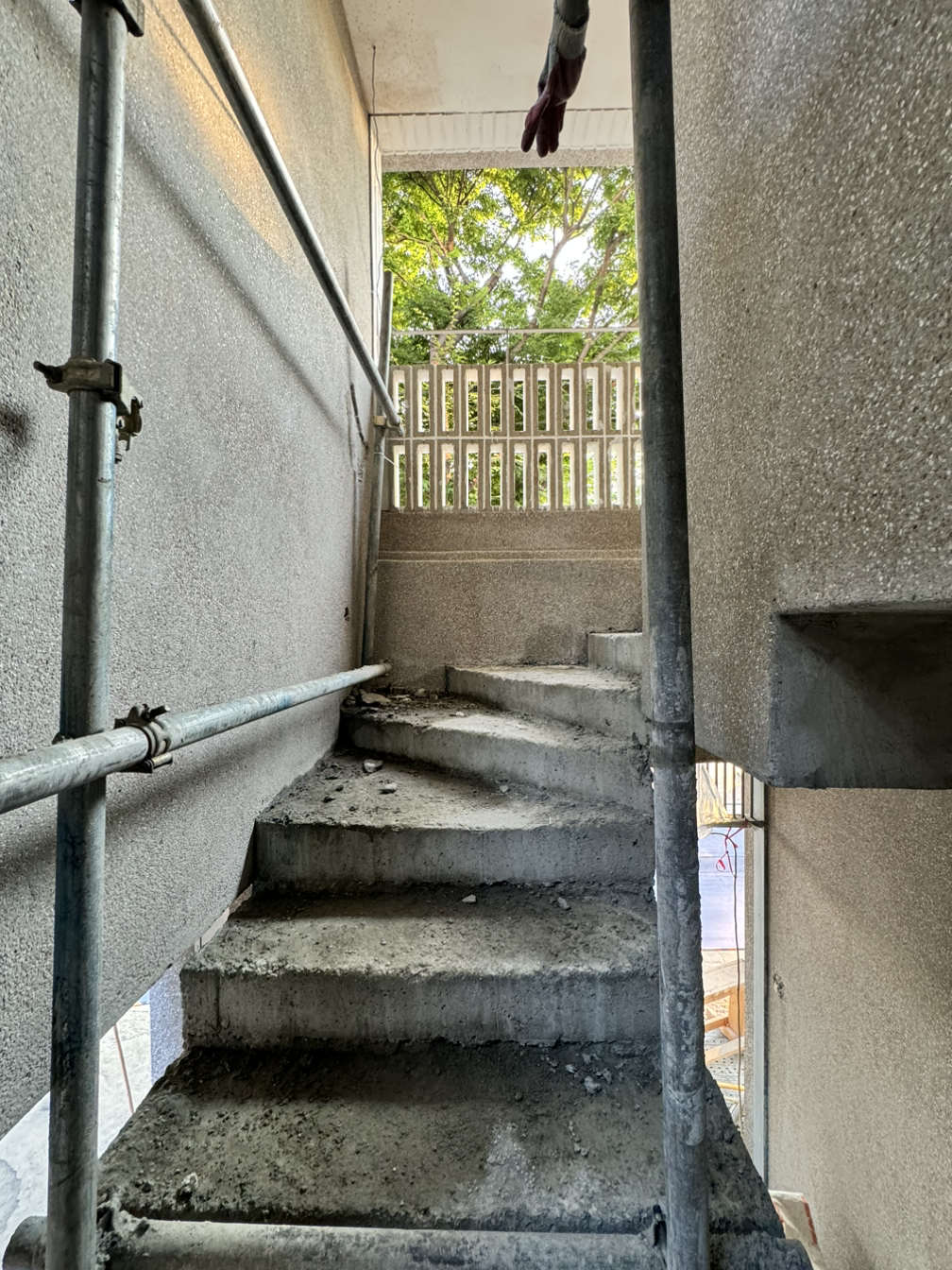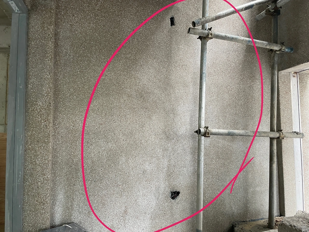 이른 아침부터 각 층이 바삐 돌아가기 시작했다. 마감되지 않은 채 콘크리트 노출로 남아있던 외벽에 콩자갈 미장 작업이 시작되었다. 다행히 날씨도 함께 돕는지 무덥지 않고 시원한 공기가 반가운 날이다. 콩자갈 미장(아라이 다시 / 미장 후 물로 표면을 씻어내어 자갈이 드러나도록 하는 마감공법)은 미장 후 '적절한 타이밍'에 맞춰 살수세척으로 표면을 씻어내야 결과물이 고르게 잘 나오기 때문에 날씨와 습도가 영향을 미친다고 한다. 오늘은 건물 후면작업이라 햇빛이 덜 들기도 하고 날씨도 쾌적한 편이라 결과가 아주 잘 나왔다. 뒷집이 바로 인접하기도 하고 상대적으로 눈에 띄지 않는 건물 뒤편인 게 아쉬울 정도이다. 1층 외벽 전체와 지하와 2층으로 이어지는 계단실 내부 벽을 모두 콩자갈 미장으로 마감할 텐데 남은 공간도 이 정도의 완성도이면 더할 나위 없을 듯하다.