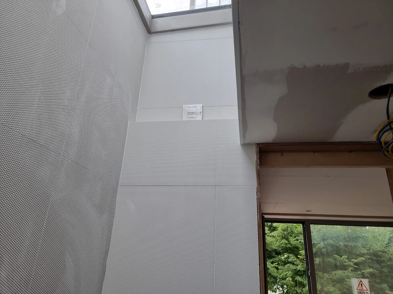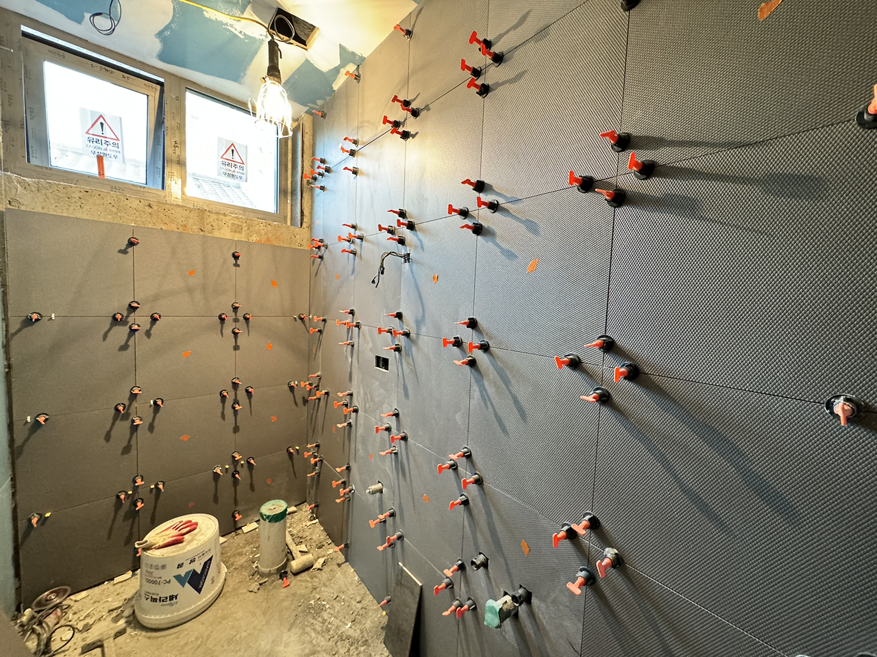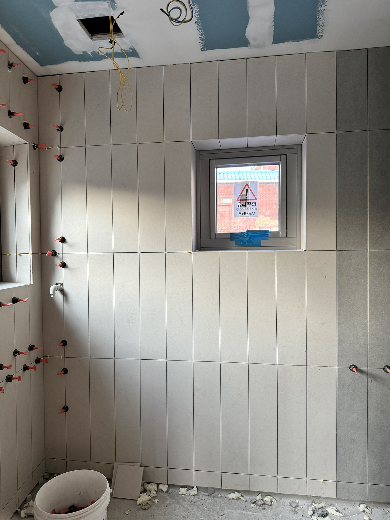 타일 공정 내내 두꺼운 타일(11mm) 때문에 작업이 어렵다는 얘기를 자주 들었는데, 전화위복을 여기에 써도 되려나?… 정말이지 다행이다. 뜯긴 벽체 면에 안심하는 오늘이다.