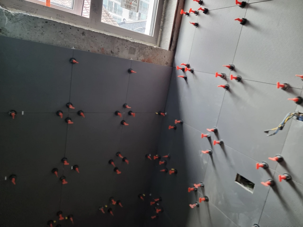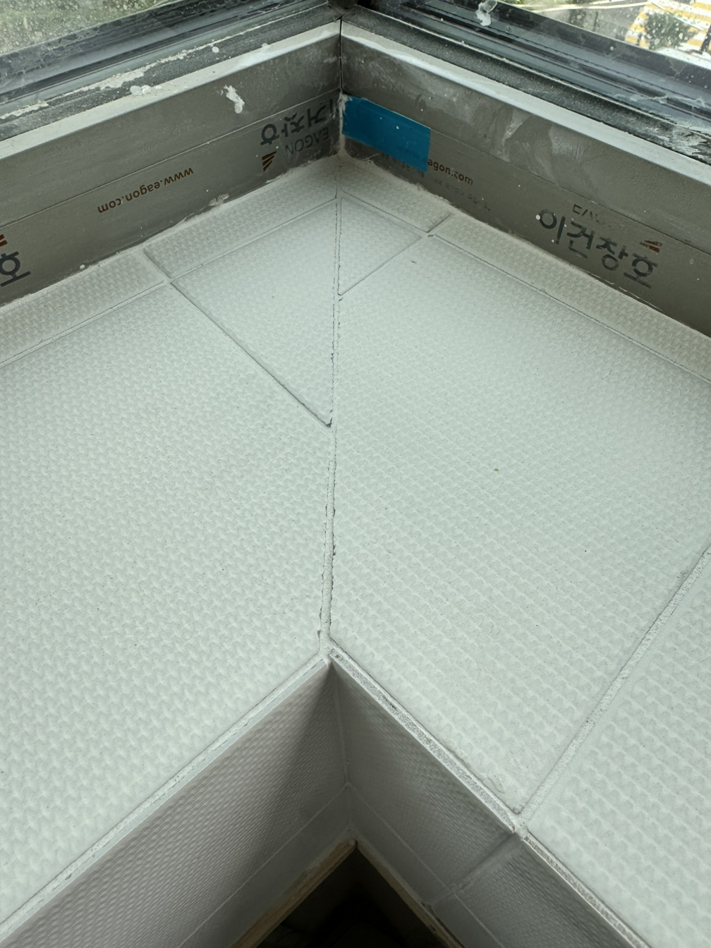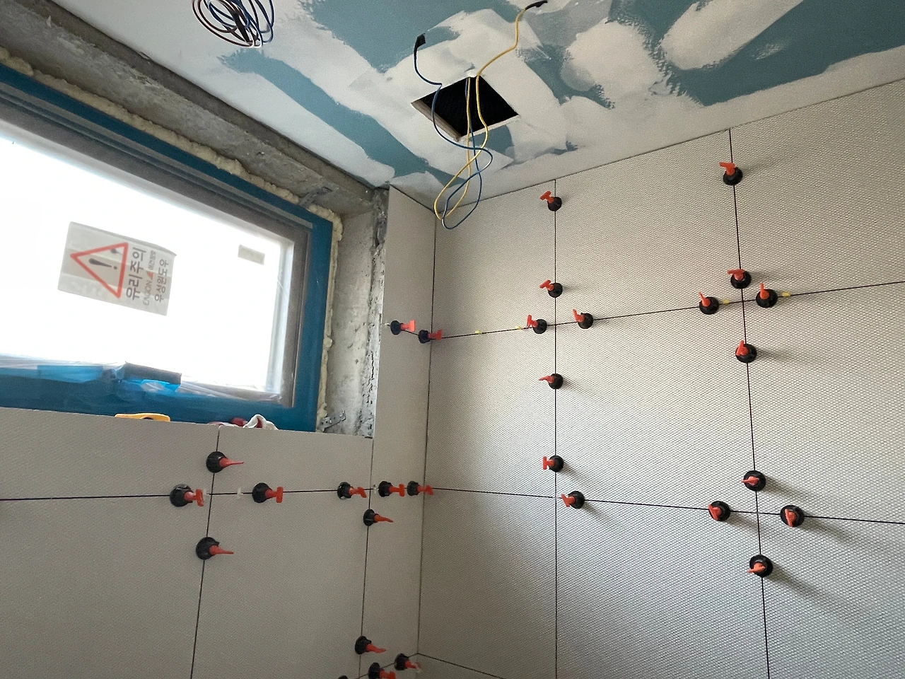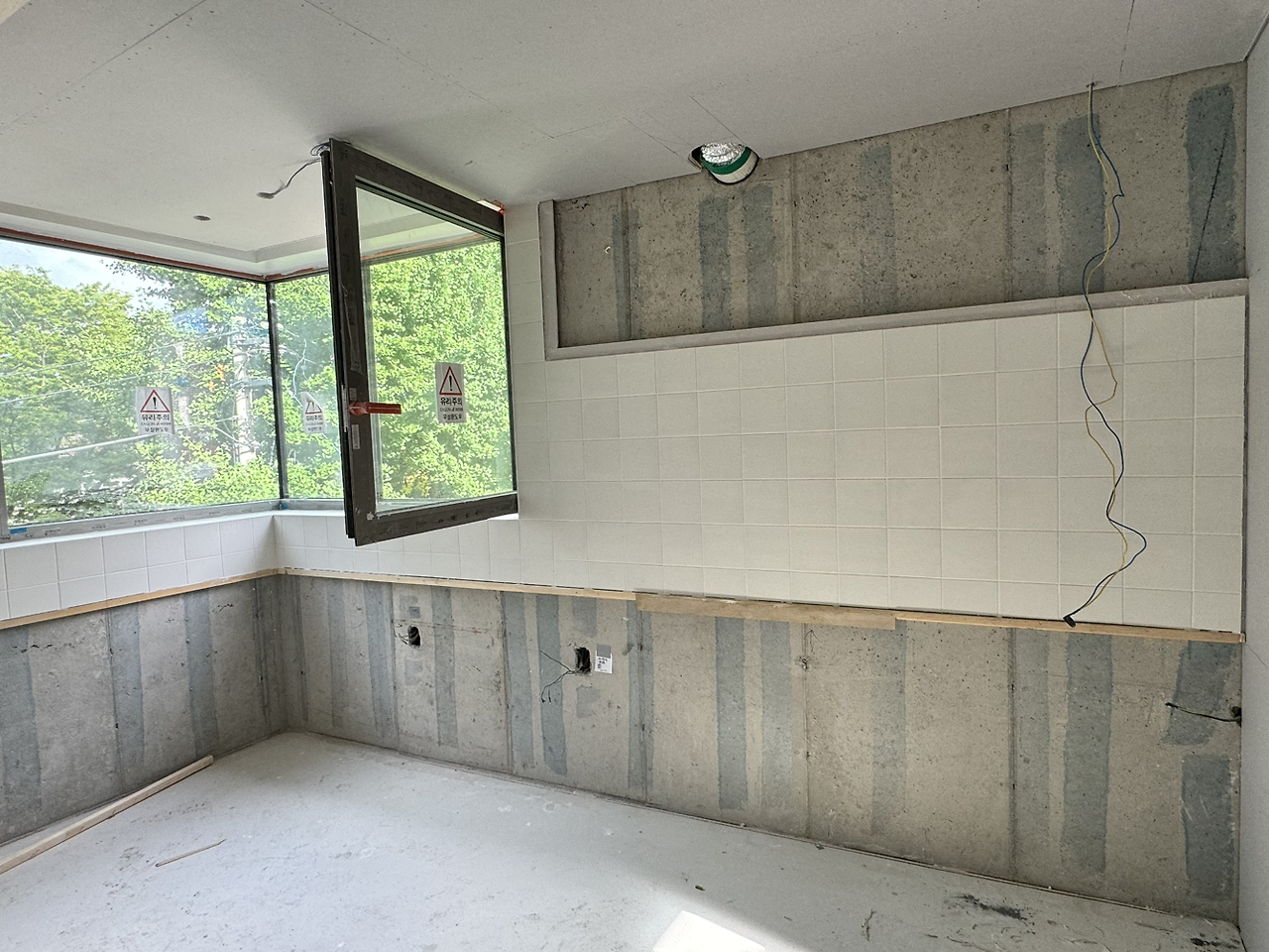 타일 공정 내내 두꺼운 타일(11mm) 때문에 작업이 어렵다는 얘기를 자주 들었는데, 전화위복을 여기에 써도 되려나?… 정말이지 다행이다. 뜯긴 벽체 면에 안심하는 오늘이다.