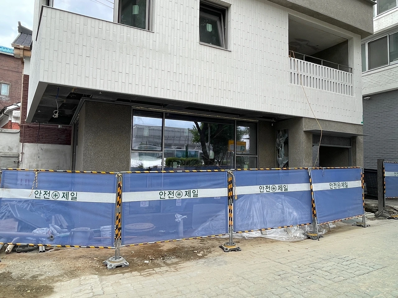 외벽과 계단실 콩자갈 마감을 하고 나니 공정이 쑤욱 진행된 듯 보인다. 퇴근하고 오니 건물 전면의 가림막도 일부 걷혀있고 동네분들로부터 멋있다는 덕담이 현장에서 꽤 오갔던 모양이다.