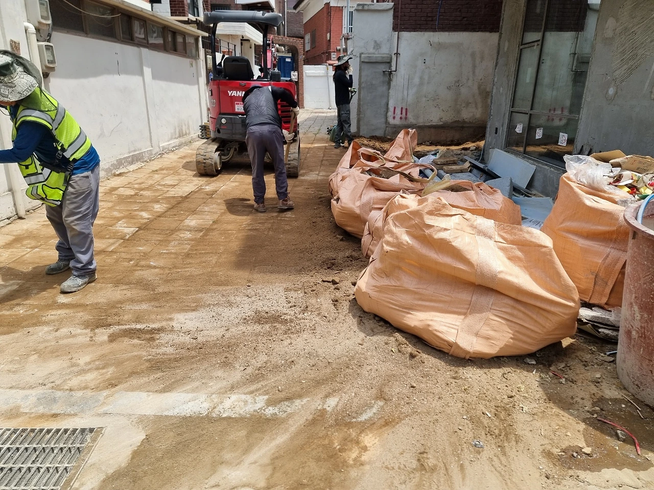 토. 주변 경계석 설치 및 보도블록 설치, 현관 타일, 지하층 타일 설치