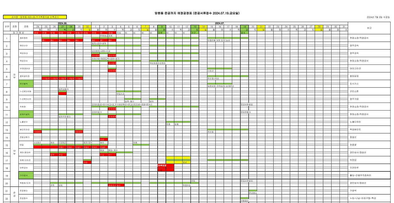 7월 안에 대부분의 공정이 진행되어야 사용승인을 받고 이사 일정도 잡을 수 있으므로, 남은 기간이 매우 중요하다. 특히 건물 외부의 마감 진척이 더딘 편이라 빠르게 협의하고 일을 진행할 필요가 있어 보이는데, 계속해서 장마가 잡혀있어 일정에 영향을 미칠 듯하다. 조소장님의 주재로 매주 토요일 오전 누림 박대표까지 포함하여 함께 현장에서 공정회의를 진행하기로 했다. 마음이 조금 부산스러워지는 게 왠지 걱정스러운 기분이 든다.