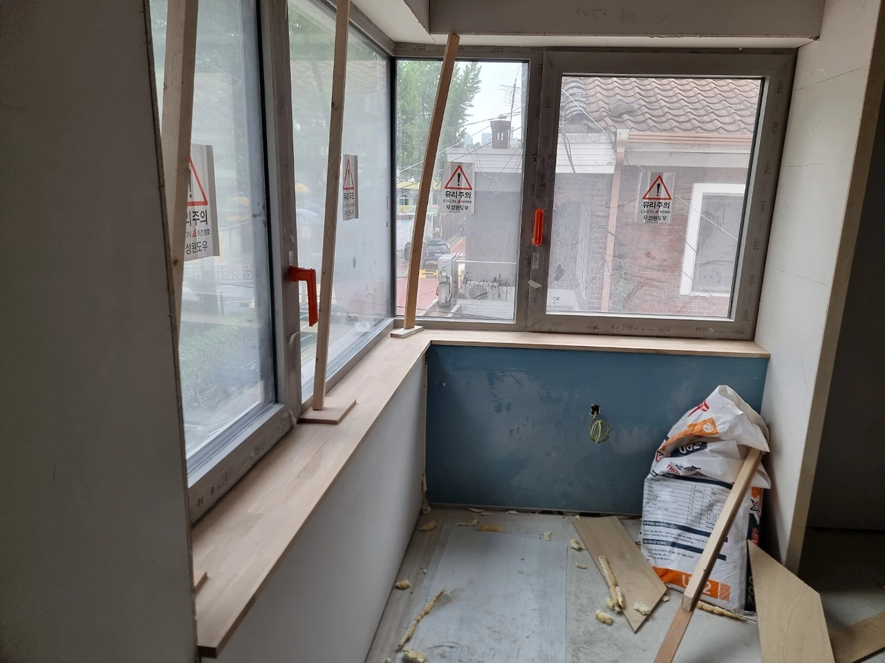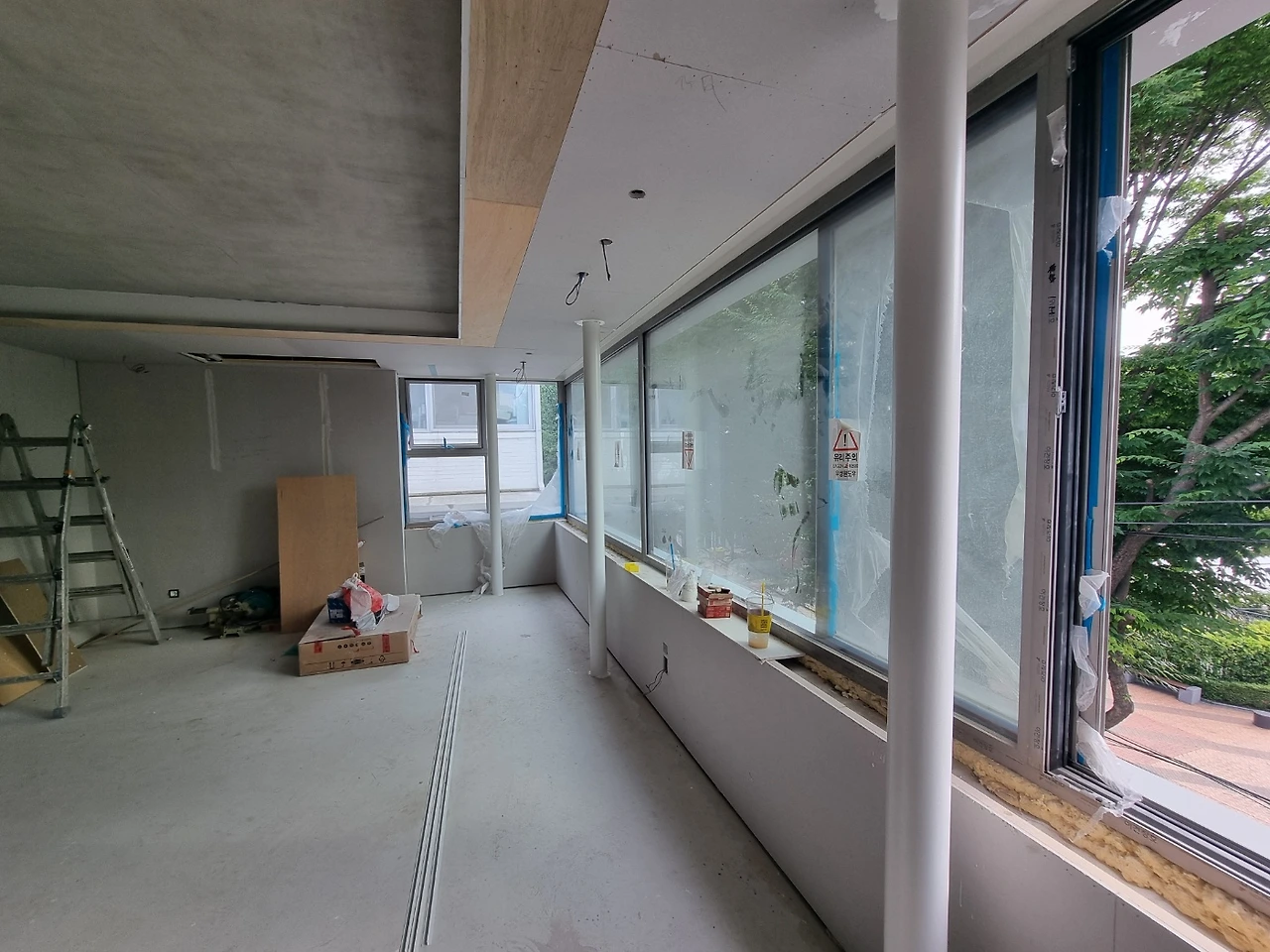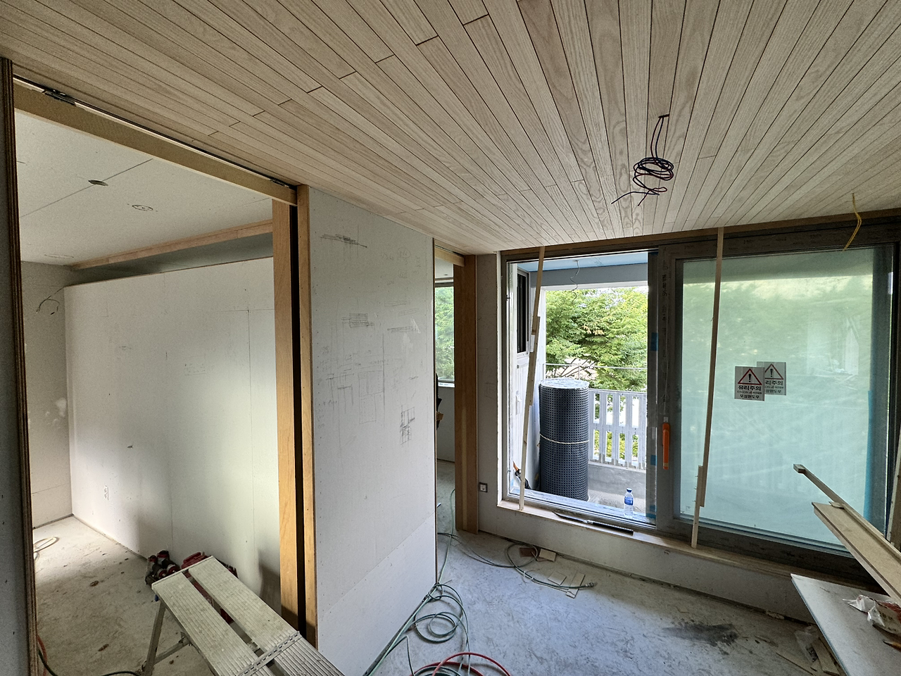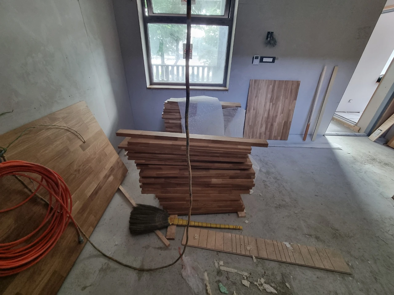 내부 작업에서 실내와 연결된 외부로 작업이 확장되고 있다. 원목마루 시공을 위해 업체에서 오전에 현장을