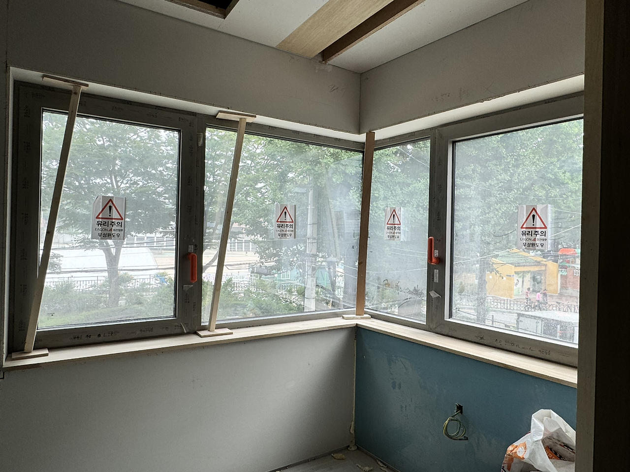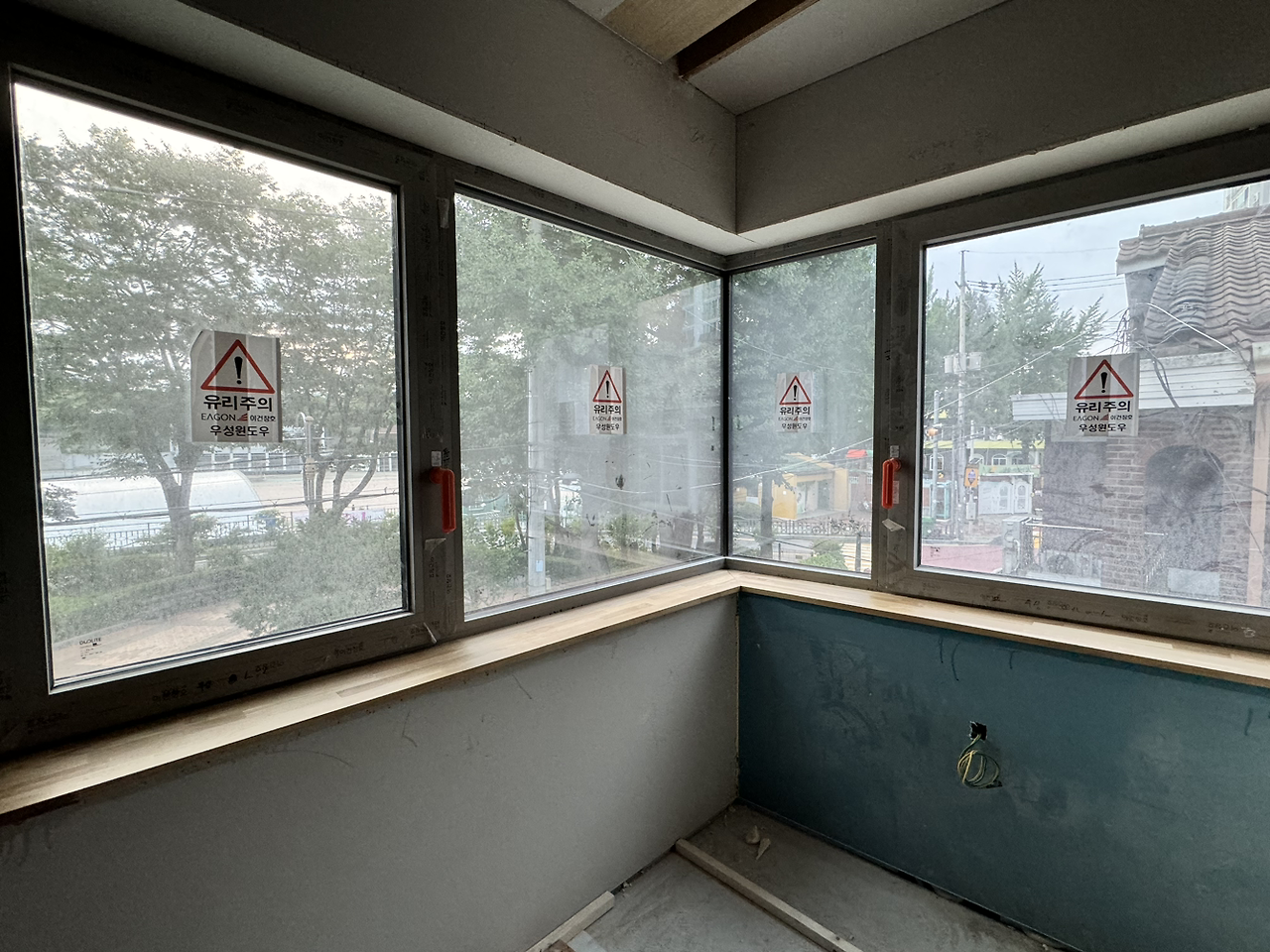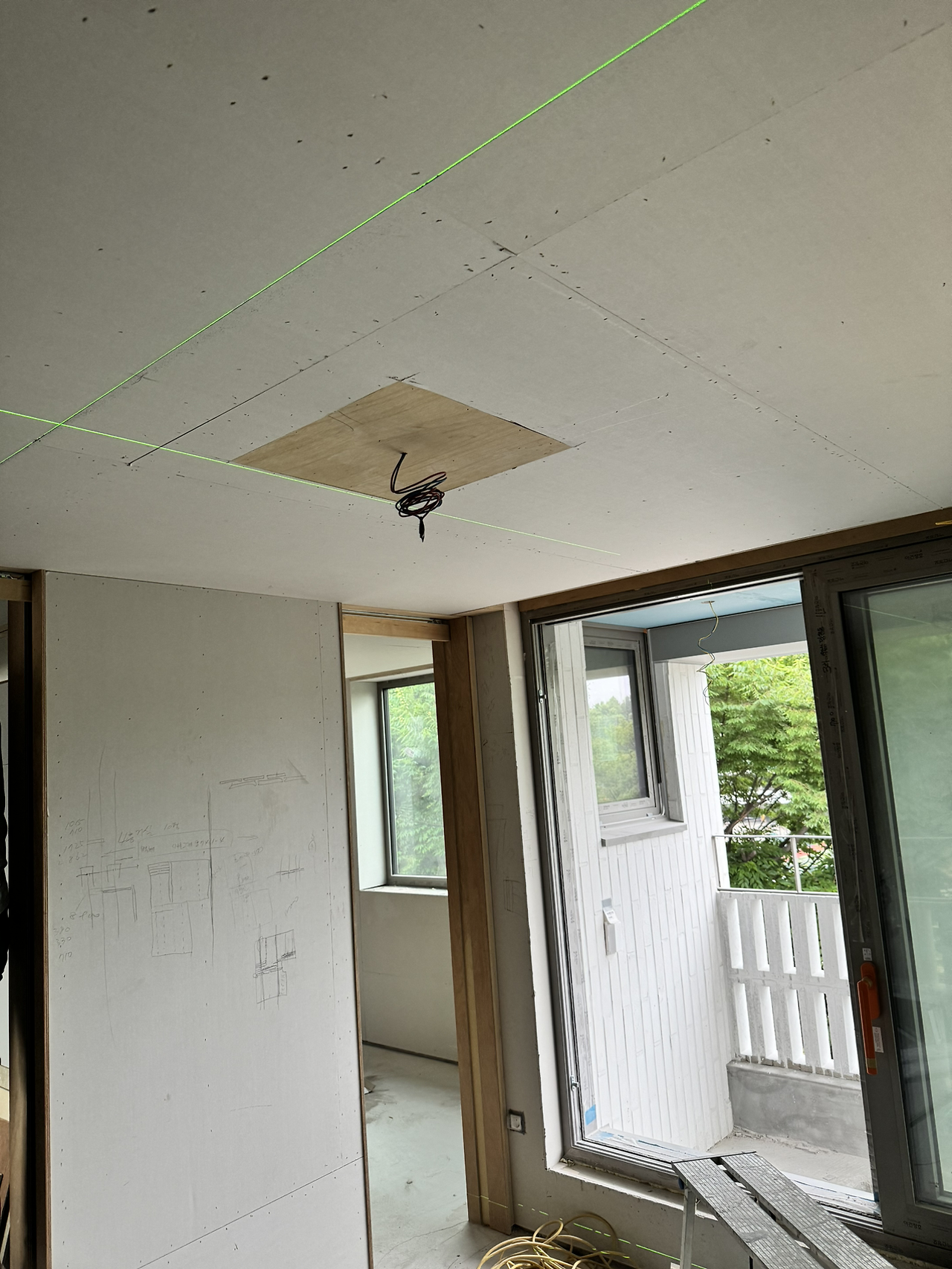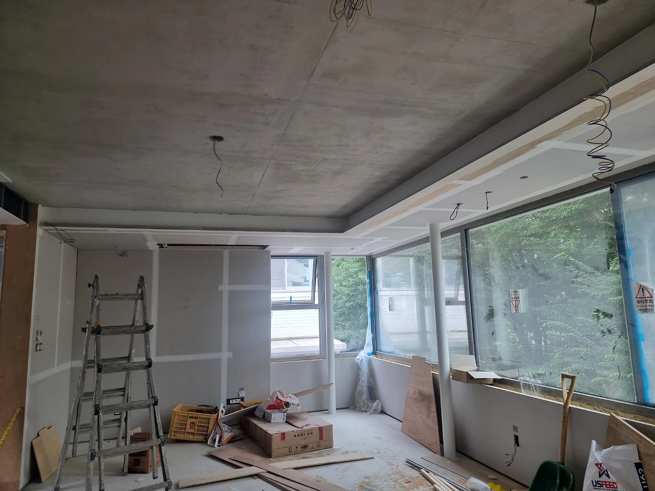 내부 작업에서 실내와 연결된 외부로 작업이 확장되고 있다. 원목마루 시공을 위해 업체에서 오전에 현장을
