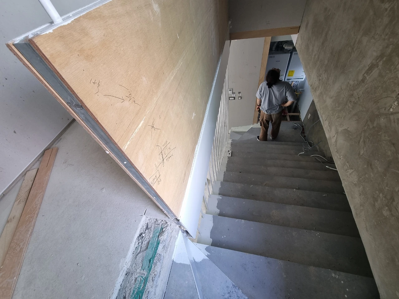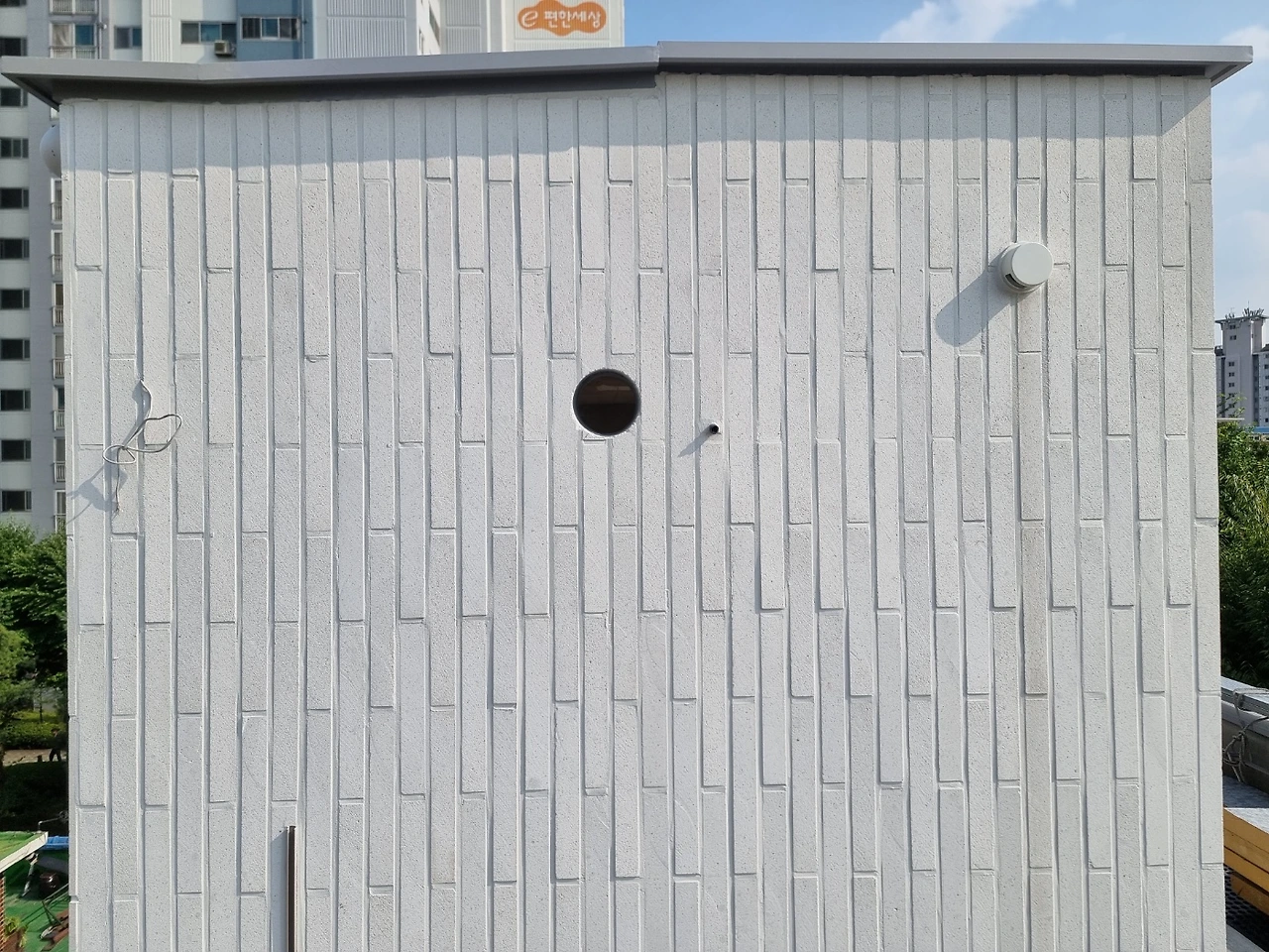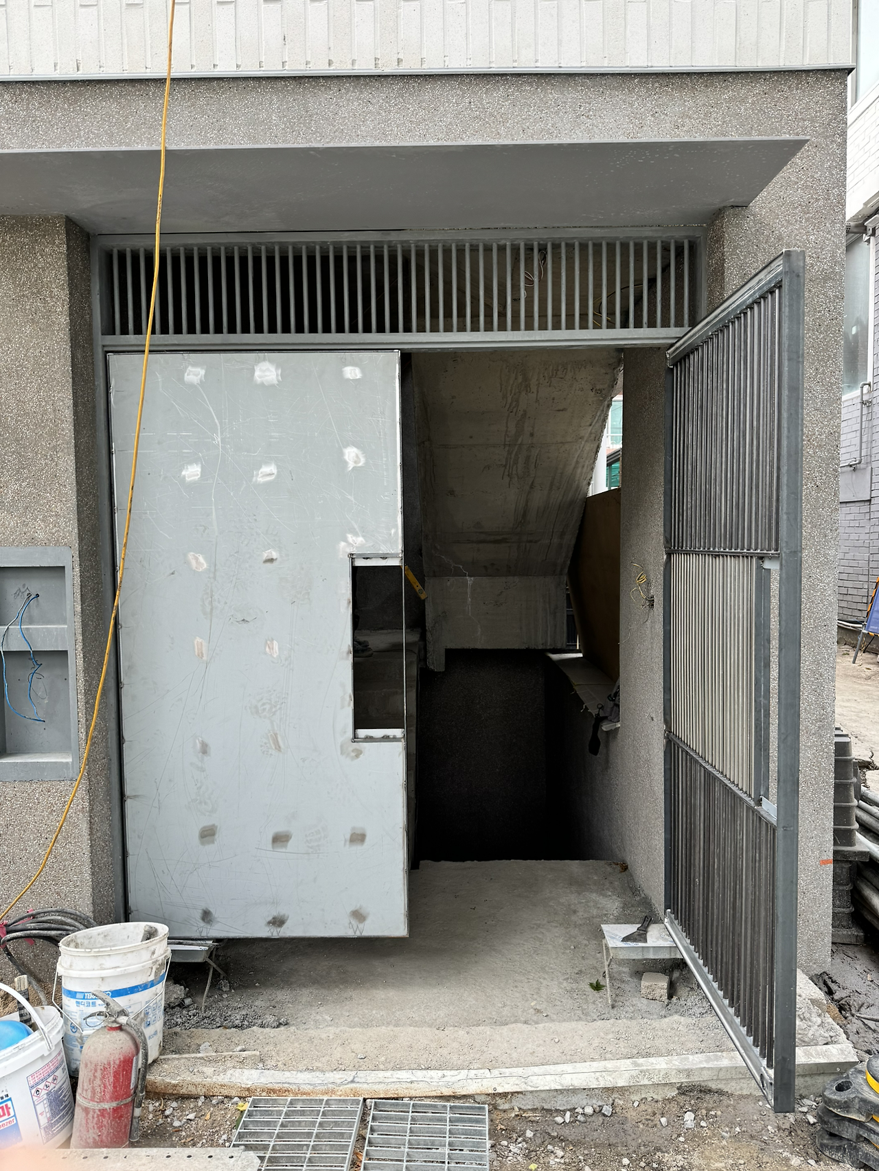 오랫동안 거친 콘크리트 면이던 입구와 계단 마감이 되고 나니 전체 마감이 훌쩍 진행된 느낌이 든다. 섬세함이 필요하나 완성이라 부를 수 있기까지 여러 번의 공정을 거치는 내부 마감과 달리 외부 마감은 한방이 있네.