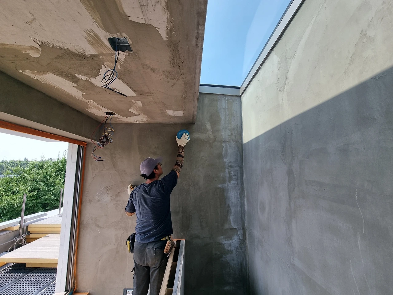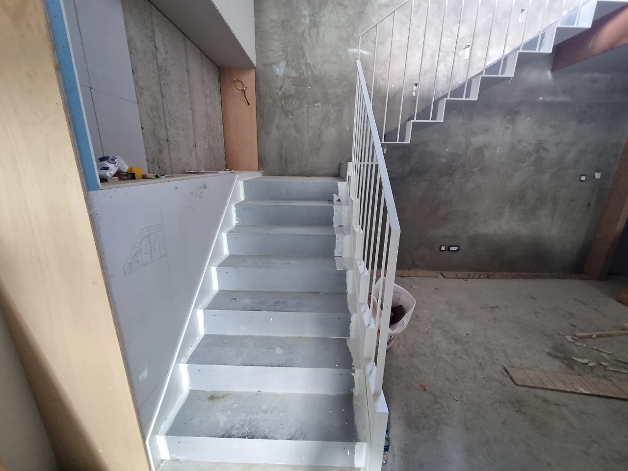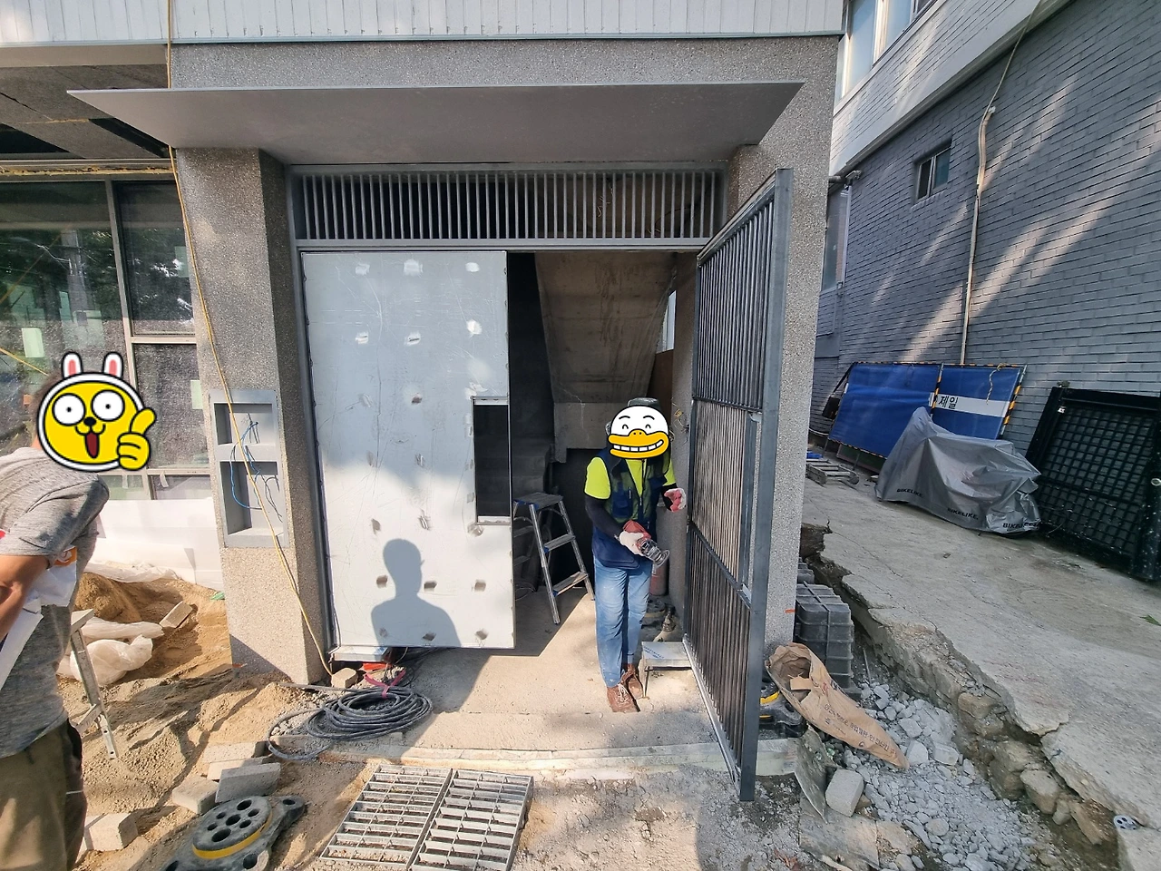 오랫동안 거친 콘크리트 면이던 입구와 계단 마감이 되고 나니 전체 마감이 훌쩍 진행된 느낌이 든다. 섬세함이 필요하나 완성이라 부를 수 있기까지 여러 번의 공정을 거치는 내부 마감과 달리 외부 마감은 한방이 있네.
