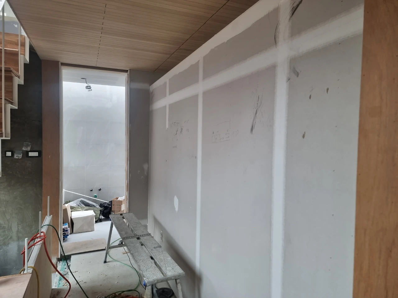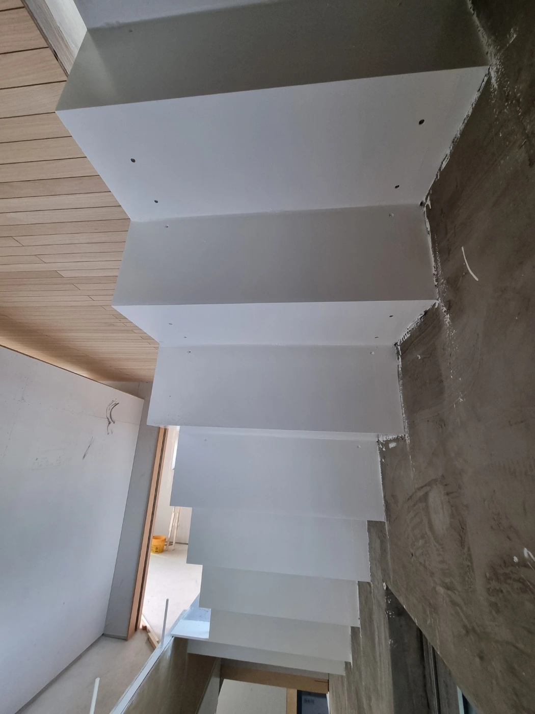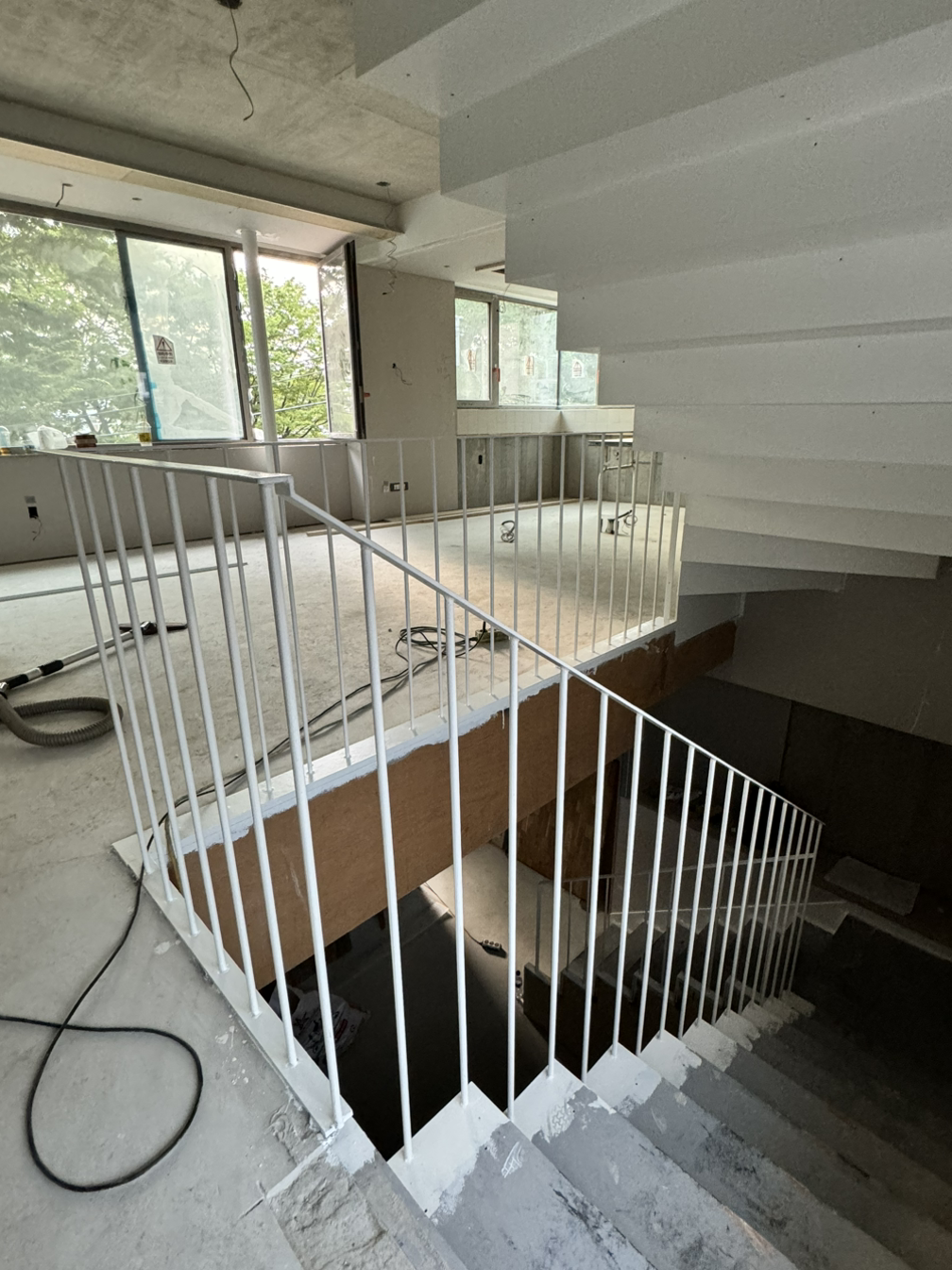 내부 계단에 목재판이 올려지니 실내의 인상이 따뜻하고 고풍스럽게 달라졌다. 창대목과 천장루버까지 목재들은 그라인딩 작업을 거쳐 표면을 매끈하게 만들고 투명락카 도장을 하고, 다시 그라인딩과 락카 도장을 반복하며 마감이 된다고 한다. 표면을 다듬으면서 매끈하게 만들어질 것이고 투명락카 도장을 거치며 나무의 결이 훨씬 더 드러나게 될 것이다. 당연한 거지만, 손이 가면 갈수록 점점 좋아진다. 제대로 했을 때 얘기이고 손이 가면 갈수록 나빠지는 경우도 있다. 잘못한 걸 수정할 때이다. 겪고 싶지 않은 결과이지만 피할 수 없는 듯.
