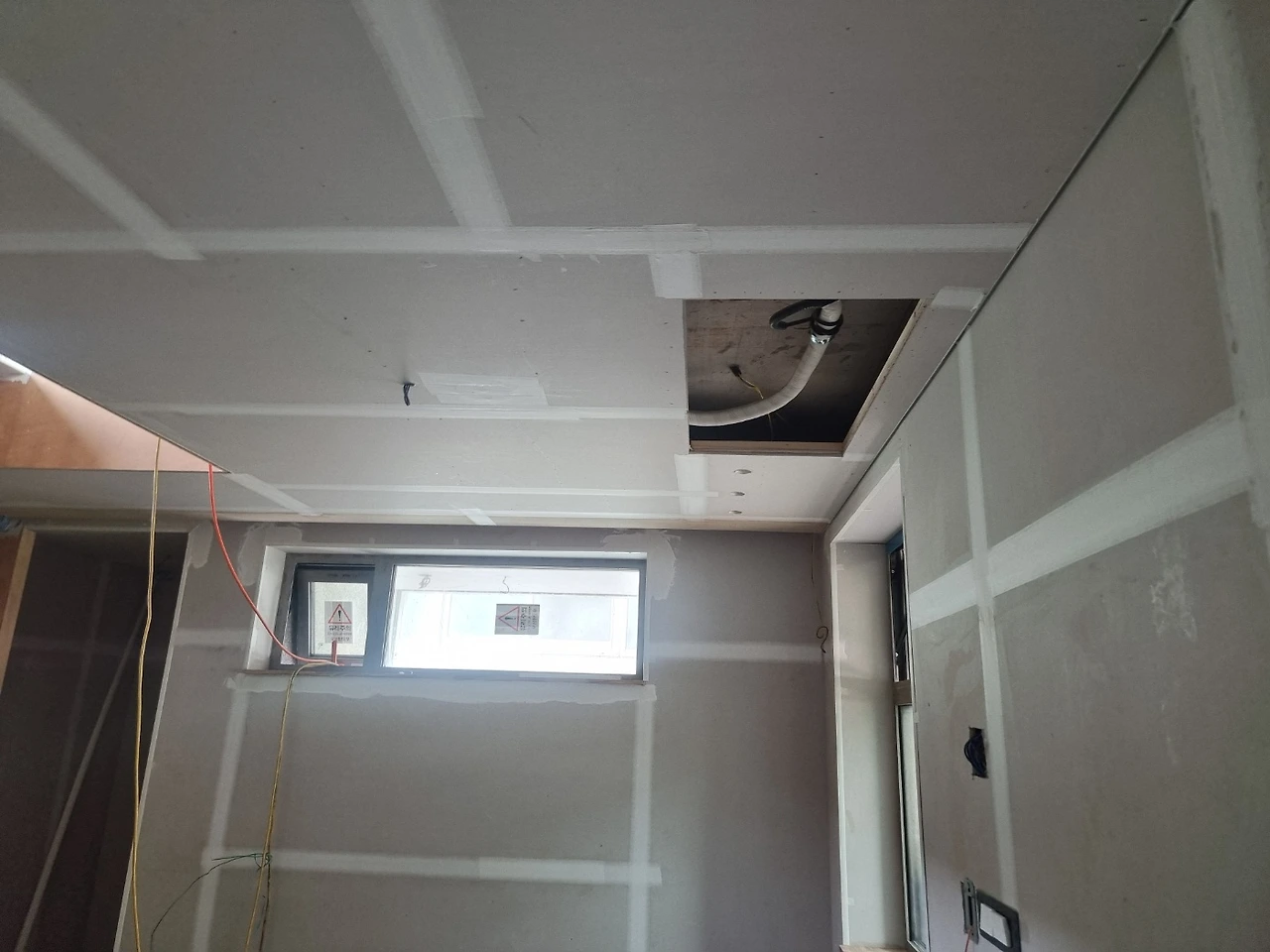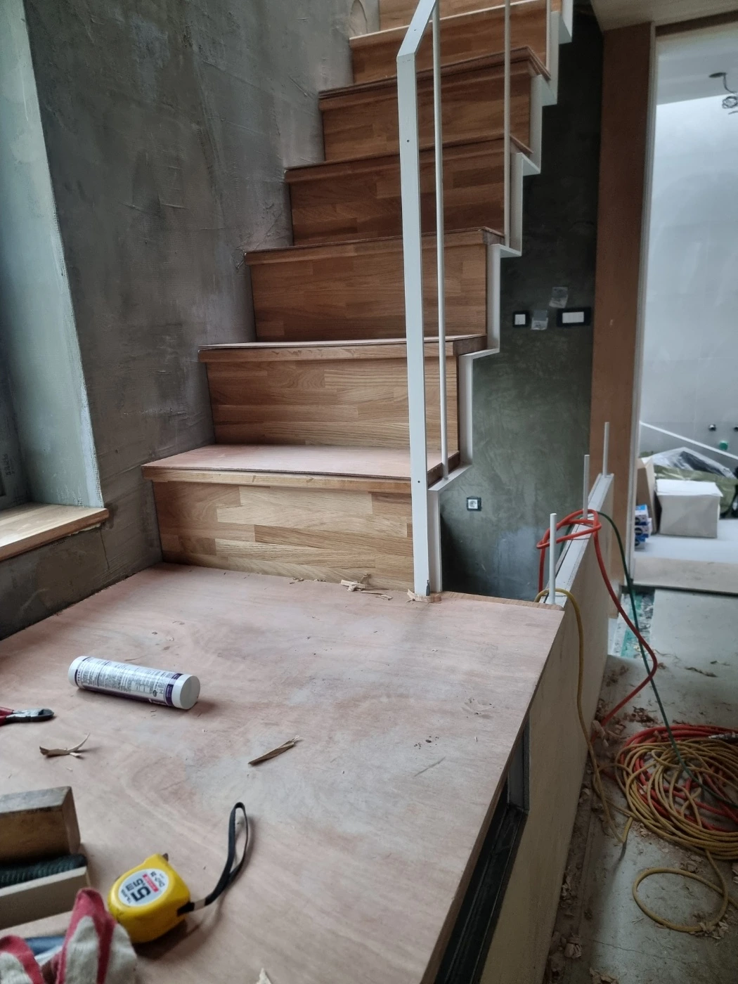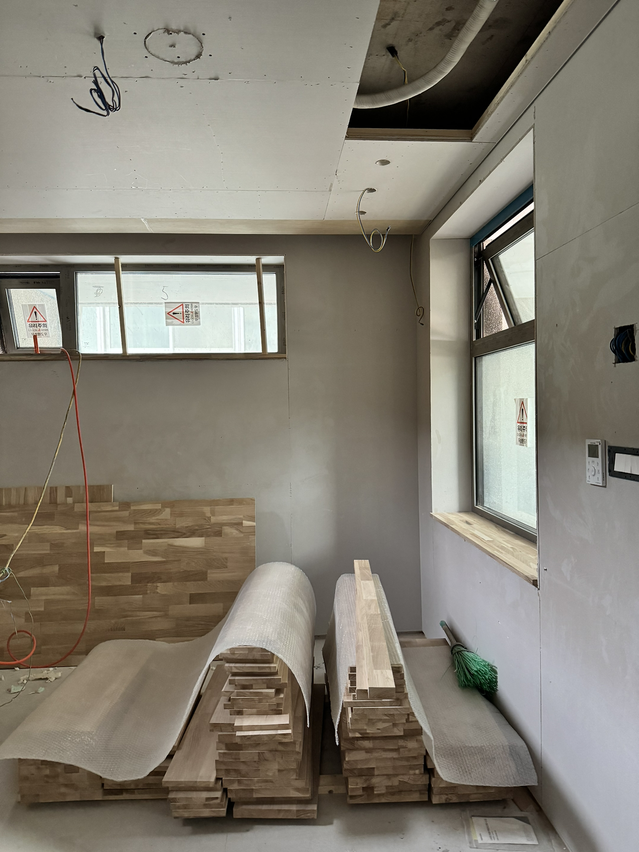명일 : 내장목공 4층 천장 루버, 창대목, 계단디딤판 시공 / 보일러 각방 온도기 설치 시험가동 / 내부청소 정리