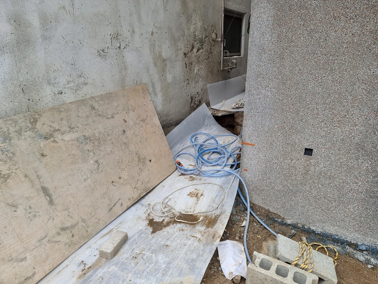 건물 외부는 이제 경계석을 놓을 준비를 해야 한다. 이를 위해서 대지 경계점을 확인하고 있는데 측량해 놓은 경계점들이 공사하면서 유실되어 명확하지 않은 부분들이 발생했다. 서울과 같은 도심의 대지 경계선은 매우 민감한 부분이고 건물까지 두 번의 측량을 거쳤음에도 명확히 남겨지지 않은 것은 아쉽다. 그렇다고 재측량 얘기도 나왔는데, 일단은 최초 측량 보고서를 열어서 주변 사물의 상대적인 위치로 잃어버린 경계점을 복원시켜 보고 있다.