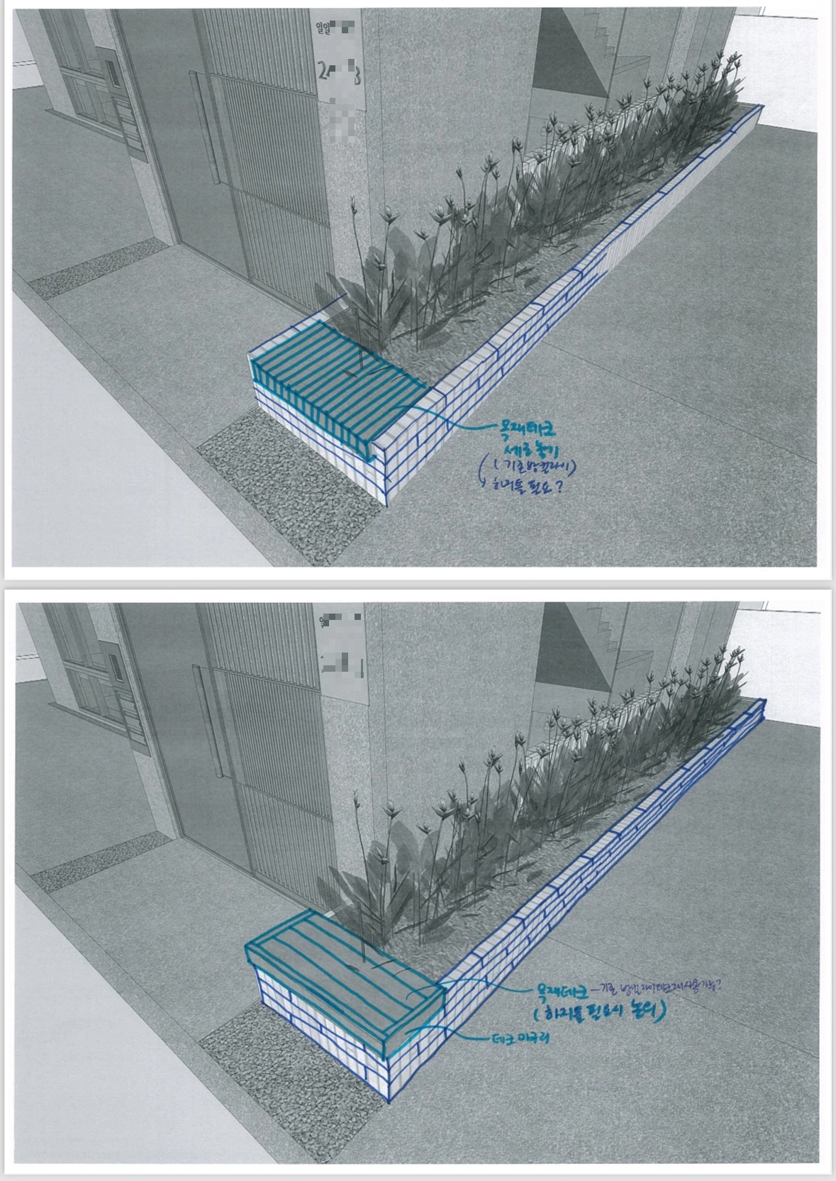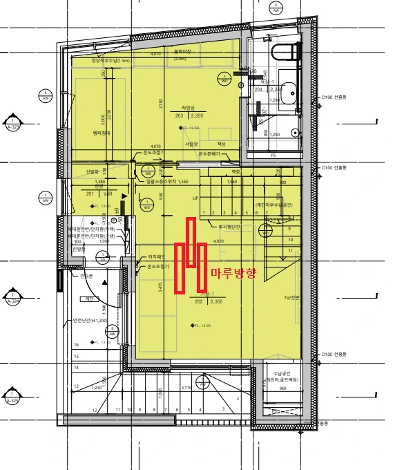 보일러실 바닥은 점검 시 편의를 위해 데크로 마감하고, 잦은 점검이 있지 않은 하부는 데크를 들어서 점검하게 만들 계획이었다. 그런데 보일러실이 계단실 가구 옆에 위치하고 가구 문을 같이 쓰다 보니 바닥을 드러내기가 쉽지 않을 거 같다고 한다. 다시 고민을 해야 한다. 마감이 될수록 상상했던 것과 다른 점이 발견되고 그에 따라 결정사항이 바뀌는 경우가 생긴다. 치밀하게 고민했다 하더라도 실제 공간으로 구성해 놓고 보면 놓쳤던 부분이 보이거나 상황이 달라지곤 해서다. 계획대로 되지 않는 것에 스트레스를 받으면 힘들어지고, 달라진 상황 하에서 너무 빠른 결정을 내리면 두고두고 후회하는 경우가 생긴다. 그러므로, 변동이 있을 때는, 무엇 때문에 생긴 이슈이고 당초 무엇을 추구하고자 했는지 상기하고 결정을 내릴 필요가 있다.
