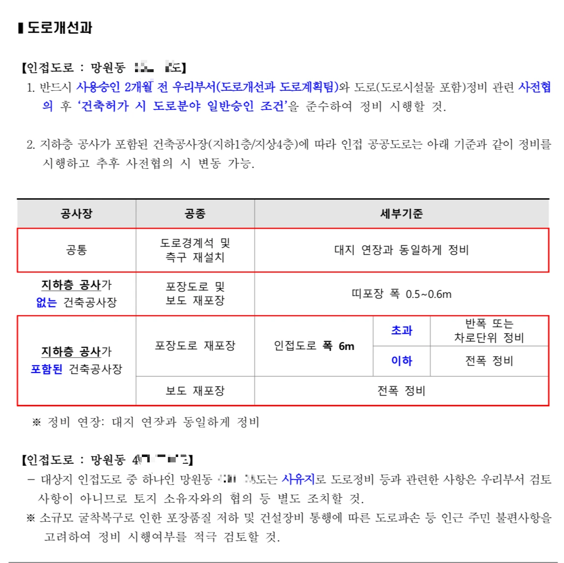 멀쩡한 보도블럭을 걷어내고 새로 까는 건 세금낭비의 대표적인 사례로 익숙한데, 공사비에 세금까지 비용부담이 큰 건축주에게 그걸 요구하는 건 불합리해 보인다. 게다가, 상하수도 공사를 위해 도로복구 원인자부담금을 세금으로 징수해 놓고 그 도로를 다시 또 새로 깔으라니 이게 상식적인 얘기인지 의문이 생긴다.