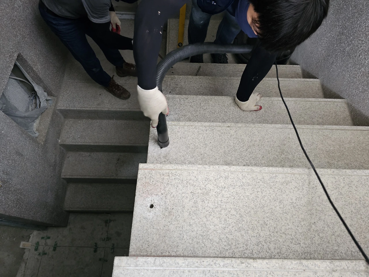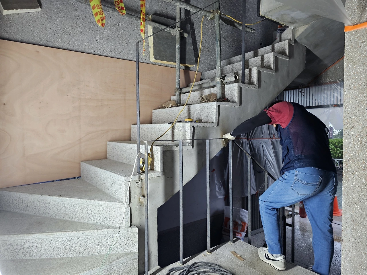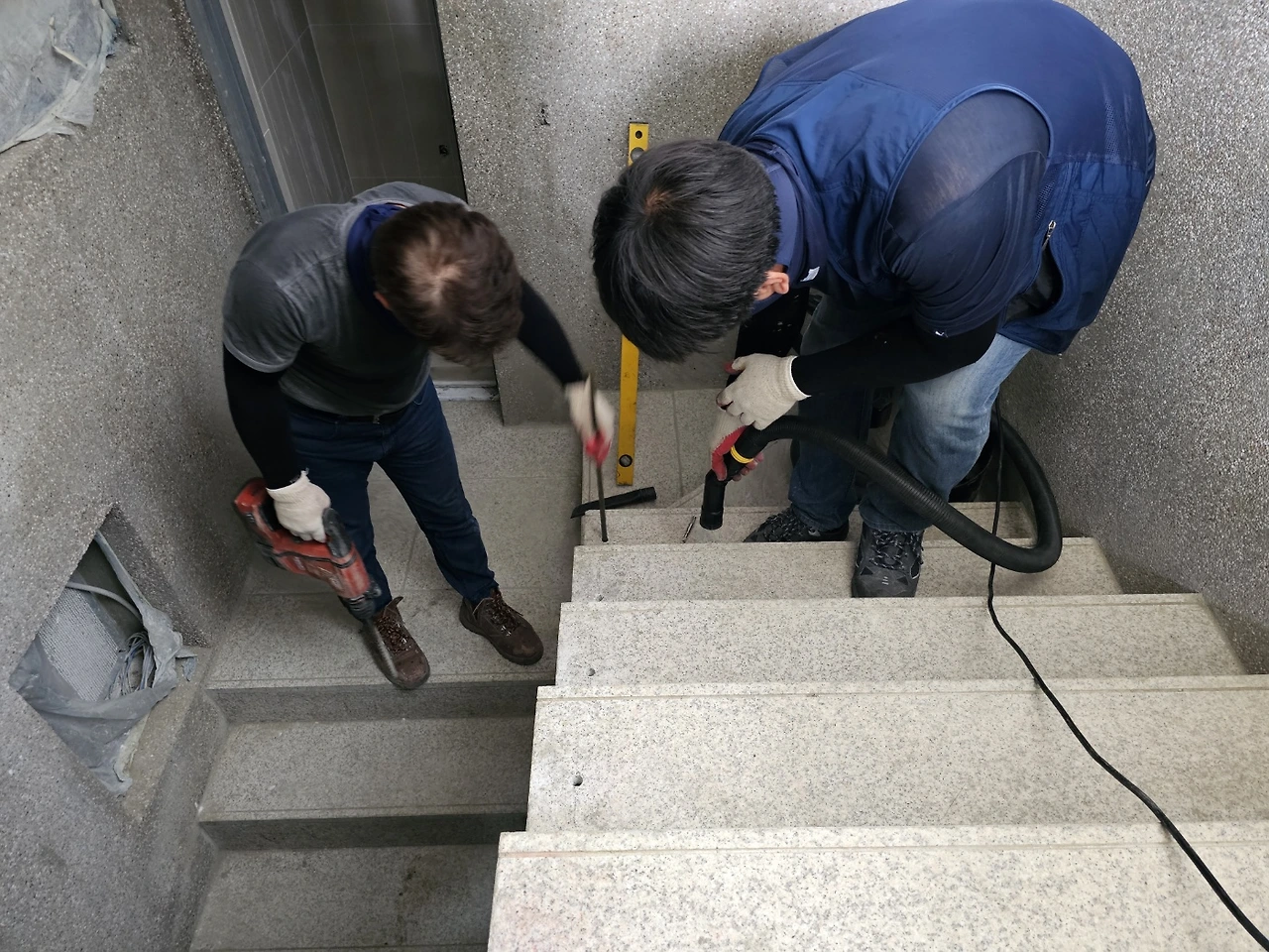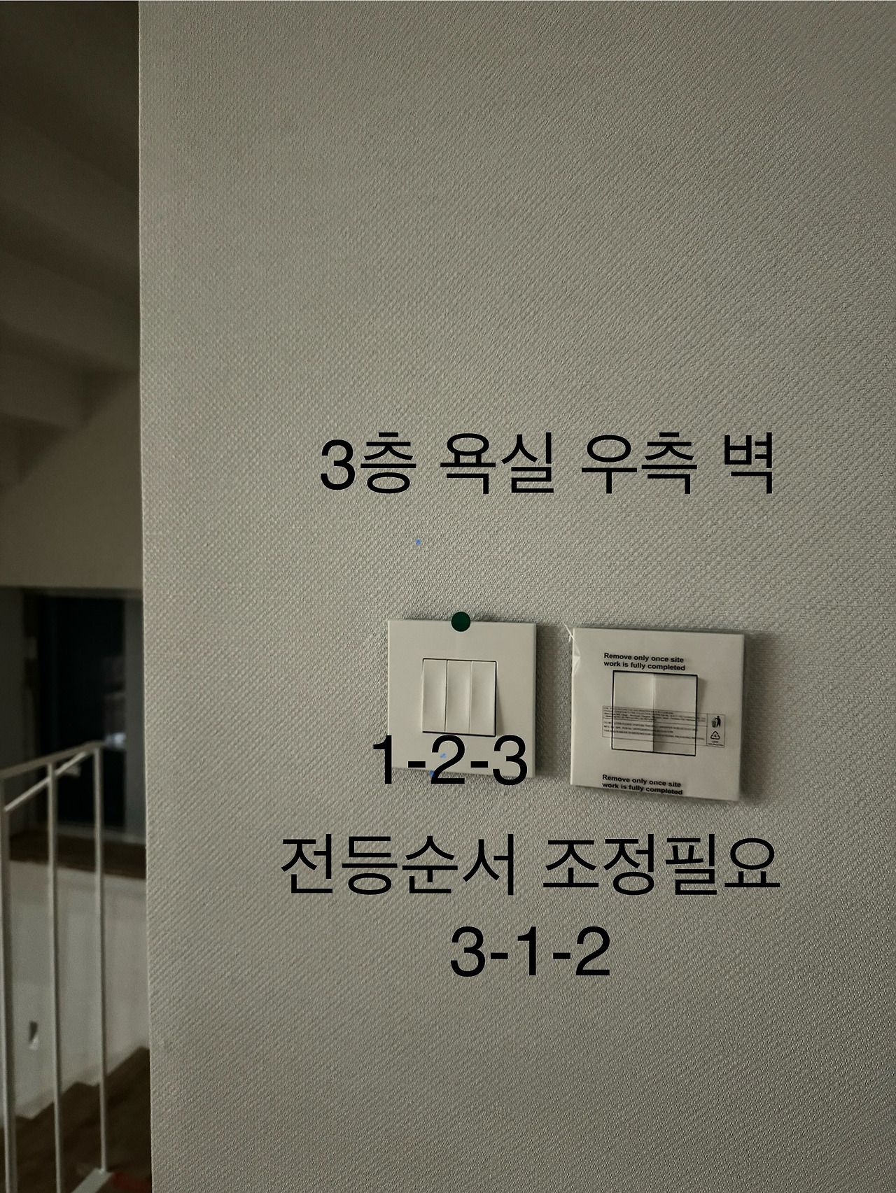 타일수정 작업이 있었다. 마감이 예쁘게 떨어지지 않아 속상했던 3층 욕실의 벽 매립수전이 아주 깔끔하게 정리되었다. 타일 수정작업 전 각 실마다 작업상태를 확인하고 스티커로 표시해 두었다. 조금씩 이가 나간 부분이나 이염된 부위 또는 메지가 고르게 채워지지 않은 지점 등인데 모두 작업이 되진 못하였다. 타일 작업하면서 지하 출입구도 같이 진행되었다. 석재로 죽 내려가도 좋았을 듯한데 두께 때문인지 타일로 마감되었다.