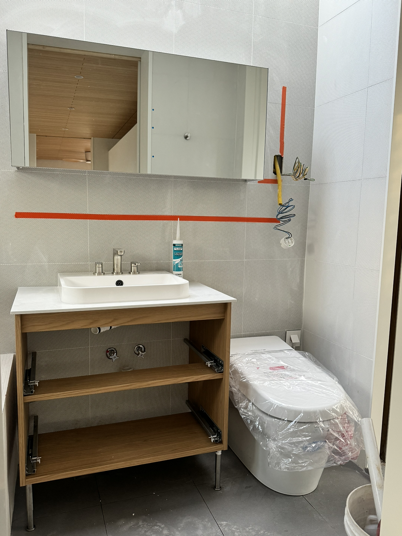 종일 어제에 이어 위생도기와 욕실 제품 설치가 진행되었다. 작업 진행이 늦은 공간이기도 한데 마감이나 가구 등이 매끄럽게 마무리되지 않아 계속 걱정이 되고 신경이 쓰인다. 욕실가구와 제품을 직접 선정하며 관여도가 높다 보니 더 그런 듯하다. 거울장과 전선을 가리려니 세면장과 너무 어긋나 버리고, 구매한 수전들은 테스트가 안되었는데 잘 동작할 지도 걱정이다. 일단 거울장은 세면대와 라인을 맞추는 쪽을 선택하고 노출된 전선은 다른 방안을 고민해 봐야겠다. 혹시나 거울장 교환이 가능할지 문의도 해봤으나 간접등과 콘센트 추가작업이 포함되어 있어 불가능하단다. 그렇다고 멀쩡한 거울장을 두고 전선을 가리자고 새 제품을 다시 주문하는 것도 좋은 선택 같지는 않다. 옆에 작은 여닫이장이라도 붙여보려니 그 또한 보기에 깔끔하지 않을 거라는 제작업체의 답변을 듣고, 선반을 달던 아예 다른 방법을 고민하는 편이 낫겠다 싶다.