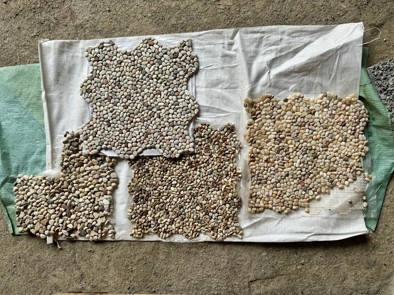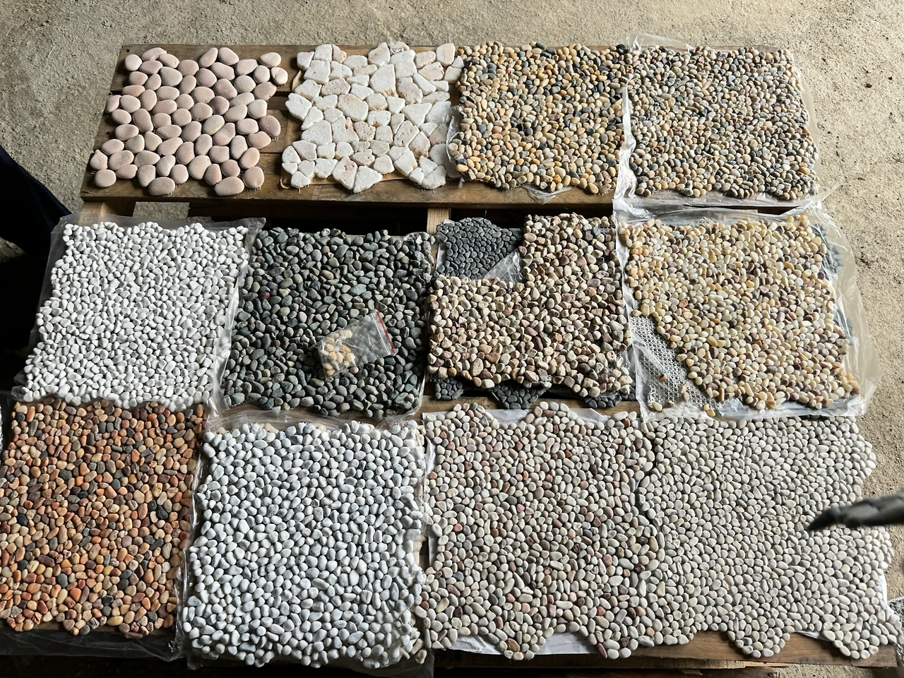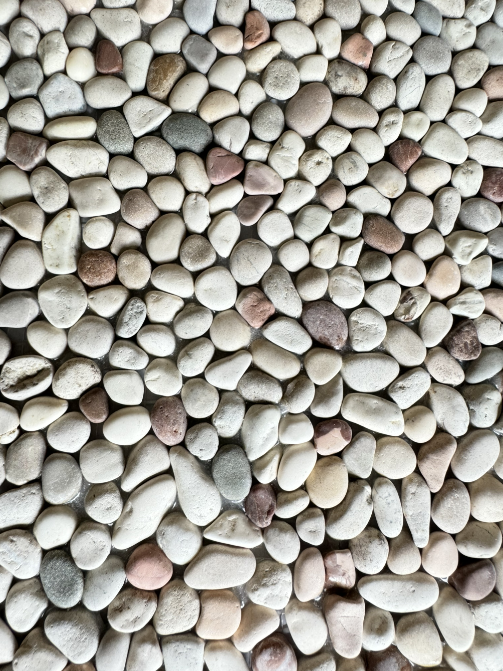 옥상이라 햇빛을 반사시키기 위해 화이트 톤이 많은 콩자갈과 화이트 메지(그라우트 시멘트, Mapei가 좋다고 한다)를 쓸 생각에 작고 아기자기한 콩자갈 타일에서 시작했는데, 최종적으로 고른 것은 자갈이 비교적 크고 톤이 단순한 것이었다. 기분 좋은 바닥이 상상되어 벌써부터 기대가 된다.