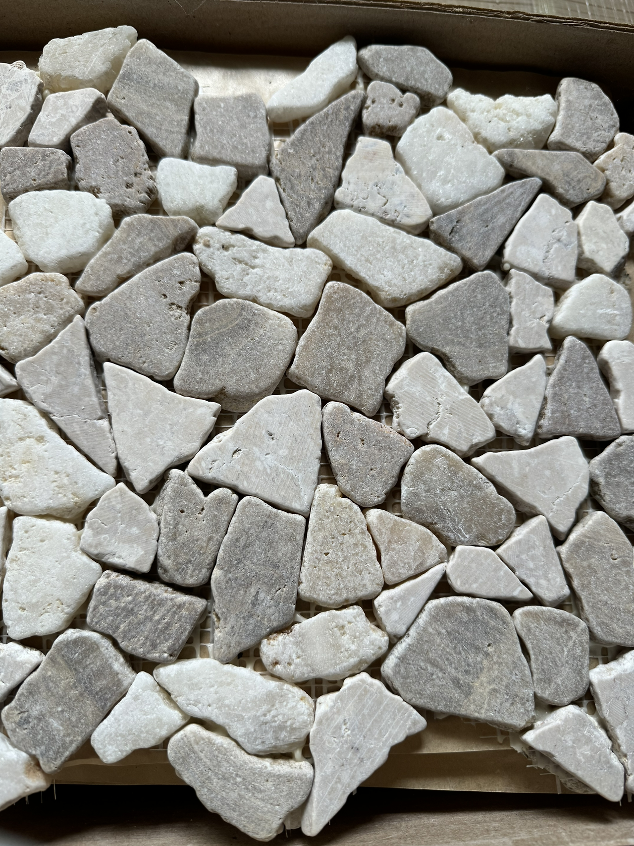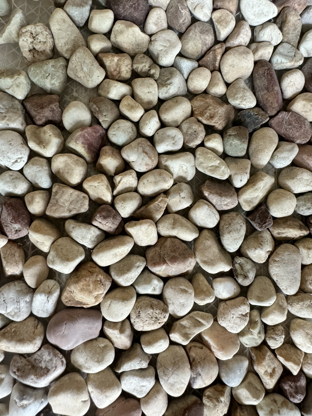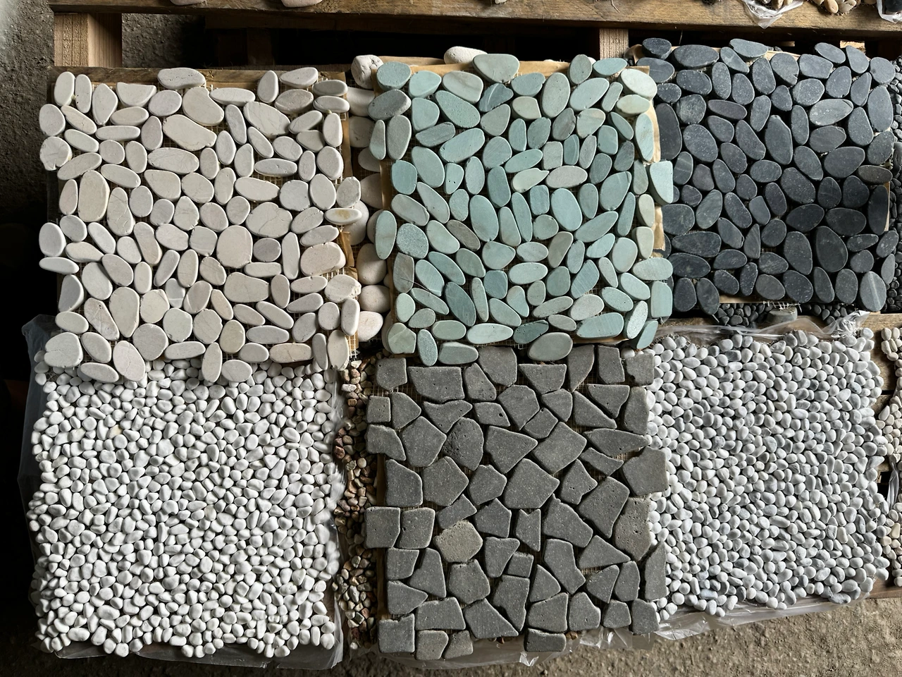 옥상이라 햇빛을 반사시키기 위해 화이트 톤이 많은 콩자갈과 화이트 메지(그라우트 시멘트, Mapei가 좋다고 한다)를 쓸 생각에 작고 아기자기한 콩자갈 타일에서 시작했는데, 최종적으로 고른 것은 자갈이 비교적 크고 톤이 단순한 것이었다. 기분 좋은 바닥이 상상되어 벌써부터 기대가 된다.