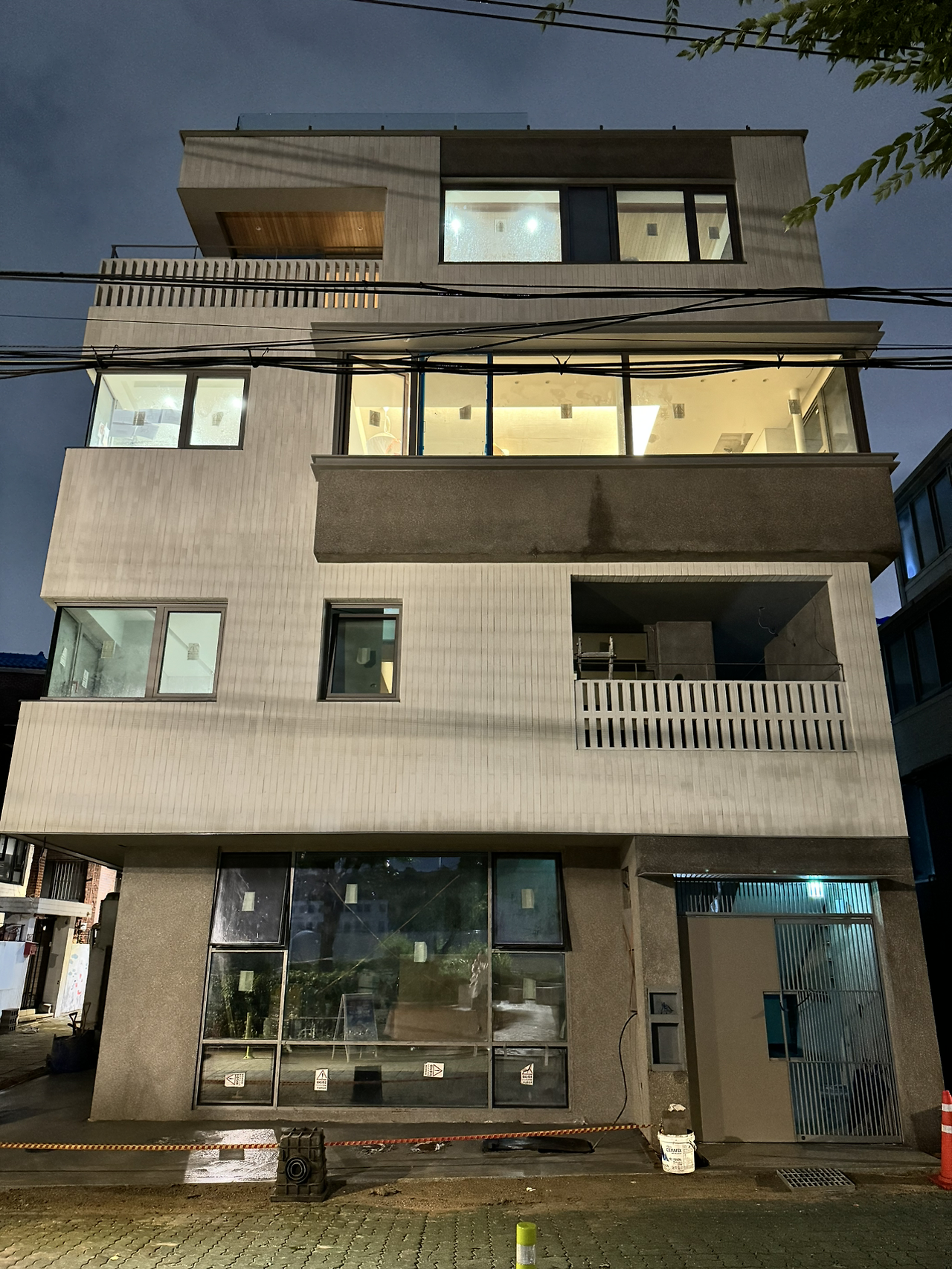 등기구 설치가 옥외 벽부등을 제외하고 대부분 설치되었고, 전기안전검사와 전기작업도 종료되었다. 처음으로 제대로 된 조명이 건물에 켜졌다. 외부 센서등들도 다 잘 동작하고 한결 공간이 아늑해 보인다.