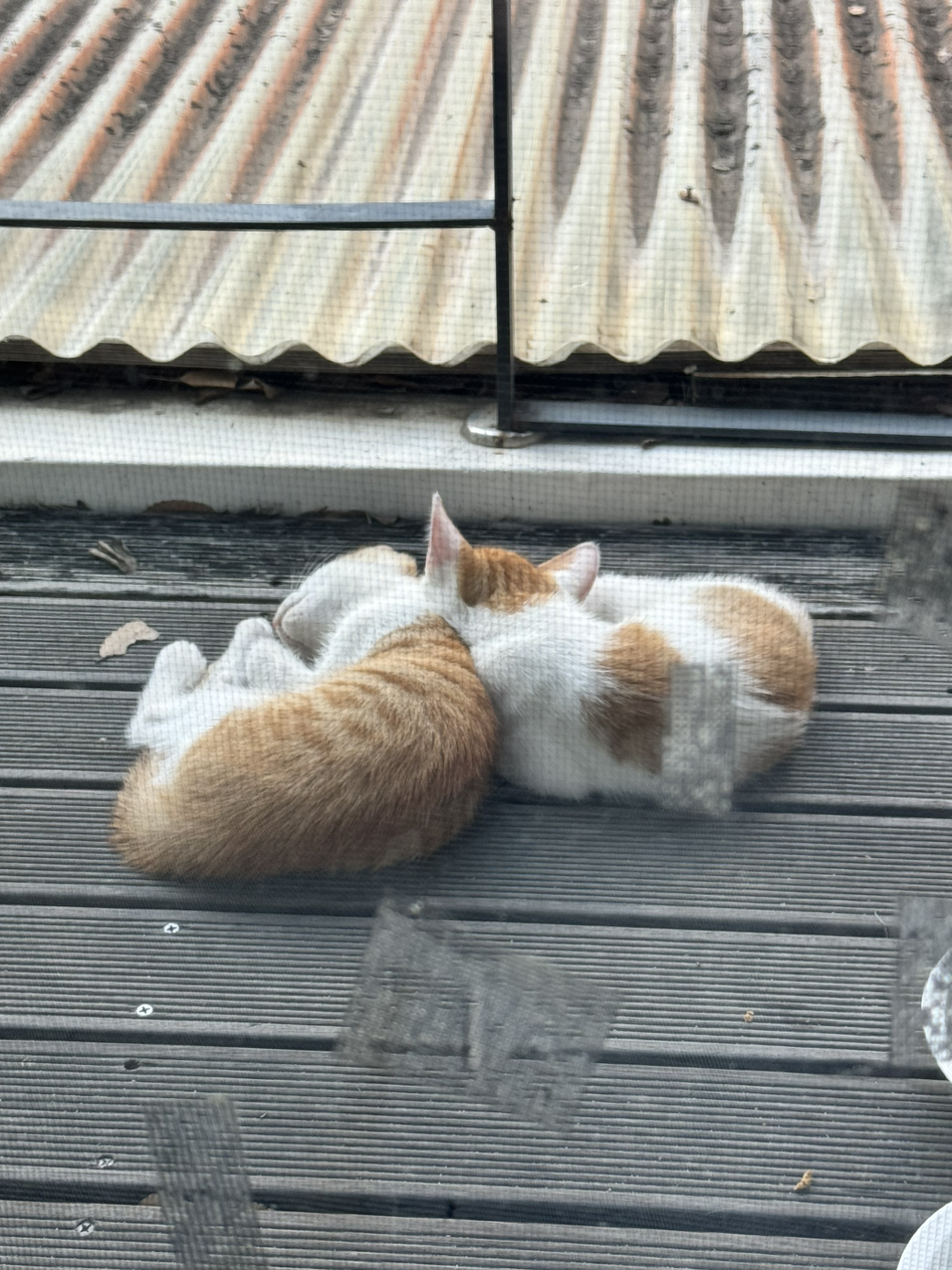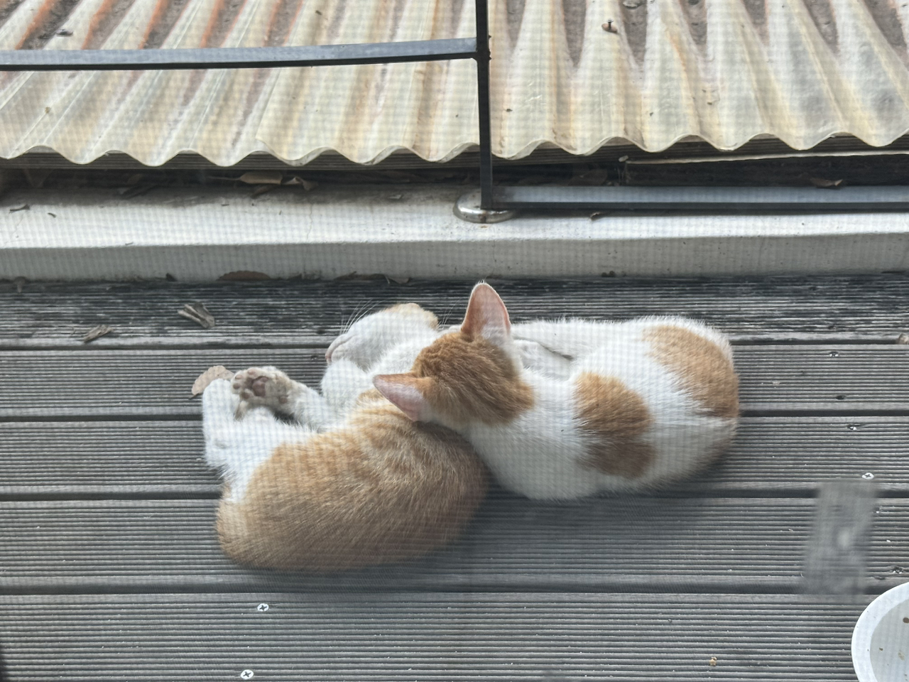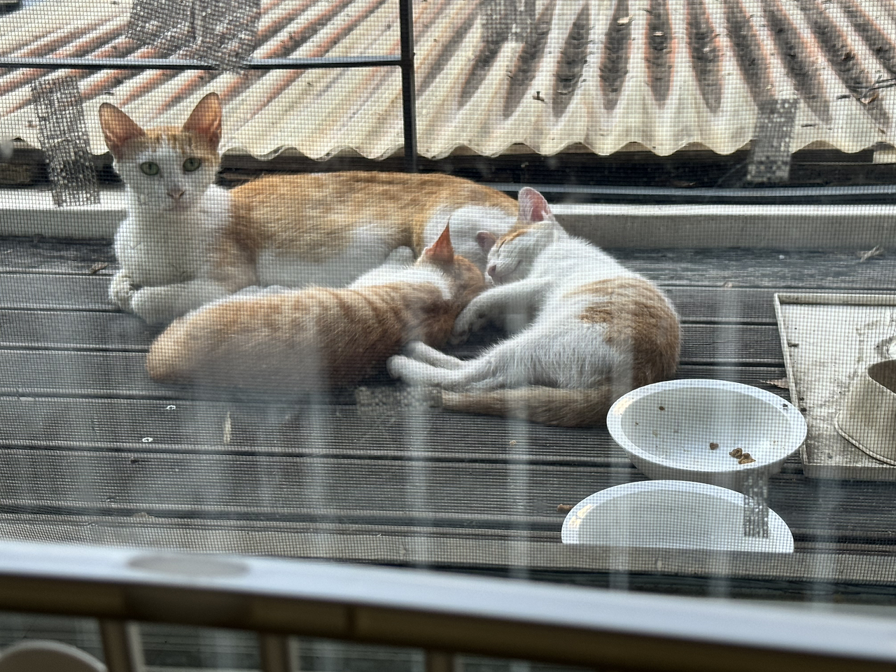 건물이 다 만들어질 때쯤 태어난 아기 고양이들이 제법 컸다. 아직 어린 티가 벗지 않은 엄마 고양이는 아가들을 해코지 할까 봐 밥을 줄 때마다 매일 하악거리며 일단은 거리 두기부터 한다. 그래놓고는 오늘은 아가들만 둔 채 혼자 어디론가 외출인 모양이다. 세상모르고 잠든 아가들의 등이 한없이 평온해 보여 나까지 나른해진다. 저 친구들의 집은 어디이려나? 엄마 고양이에게 이곳은 안전한 '집'이려나? 생존경쟁이 불가피한 골목과 떨어진 2층 테라스를 거처 삼아 아가들과 오래 지냈으면 싶어 매일 아침 물과 사료를 준비해 두고 있는데, 자꾸만 창가로 등장해 존재감을 드러내는 우리 디디가 길냥이들 마음을 편하게 하진 않을 거 같다.
