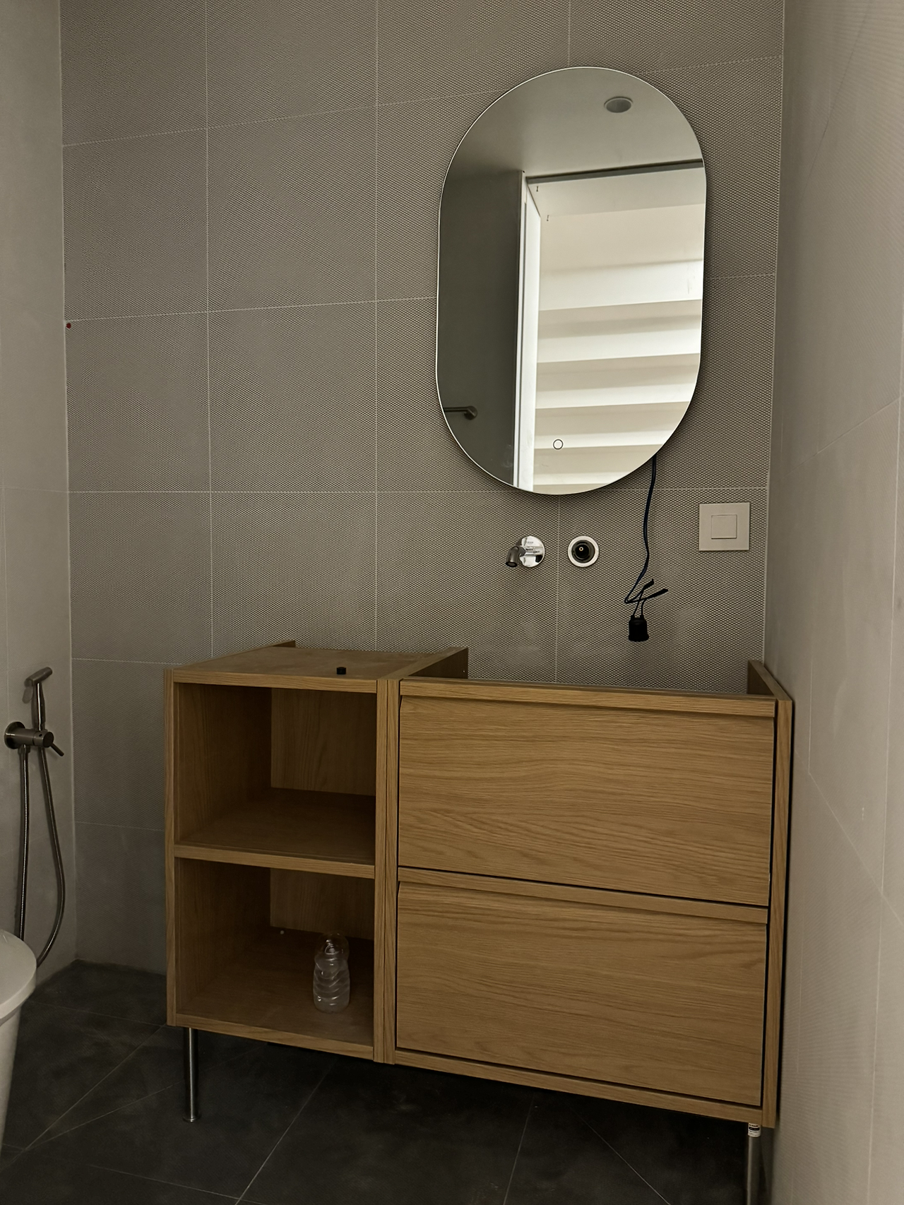 처음 욕실 가구를 배치할 때는 수납을 고려해서 거울장과 세면장 외에도 선반이나 장을 둘 생각이었는데, 막상 공간을 보니 자그맣기도 하고 타일이 시원하게 드러나는 편이 좋을 것 같아 가구나 액세서리를 최소화하고 공간감이 느껴지는 방향으로 결정했다. 타일 방향이 중구난방으로 작업되어 교체를 했던 2층은 타일면이 고르지 않은 부위도 있고 메지가 잘 안 들어간 곳도 있어 조명을 켜니 음영이 도드라지면서 벽이 울룰불룩 해 보인다. 그레이색으로 매끈한 벽에 타일의 패턴이 양감을 만들어낼 거라 기대했는데... 하... 정말 어렵다.