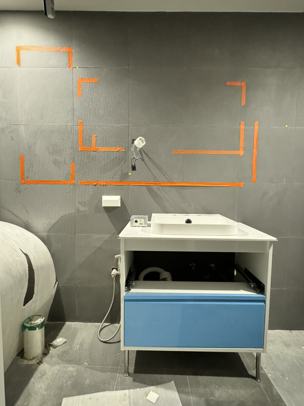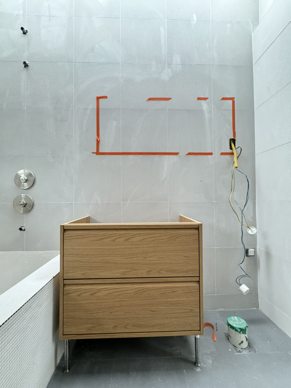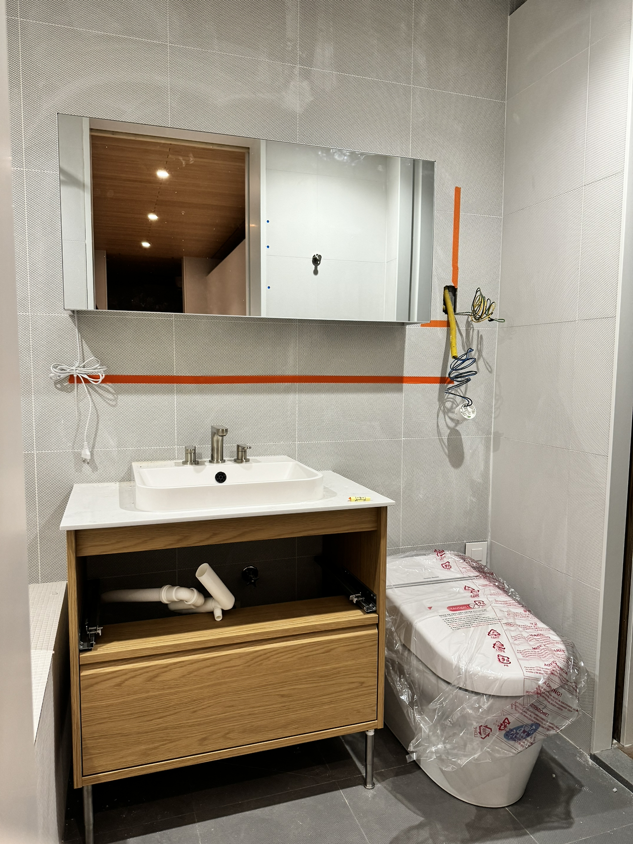 욕실의 특성상 도기, 세면장, 거울장, 수전 등 벽에 배치되는 제품이 대부분이고 각각이 다른 제품의 위치에 영향을 미치는 걸 감안하면, 전기 배선은 가구의 중간쯤에 배치하는 것이 유연성이 있었을 듯하다. 타이트한 공간인 데다 아슬아슬한 위치에 선이 노출되다 보니 말끔하게 정리가 어렵고 타일 타공도 너무 크게 되어 있어 거울이나 거울장으로 가려지지 않는 문제가 3층, 4층 욕실 모두에서 발생하고 있다. 작아서 그런 걸 수도 있지만, 여러 기능을 가진 공간이라 그런지 욕실이 정말 작업하기 어려운 공간인 듯하다.
