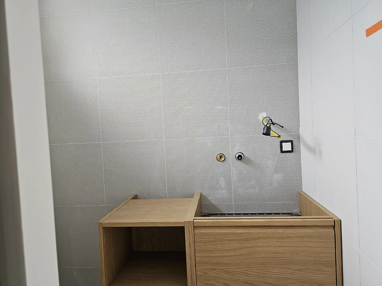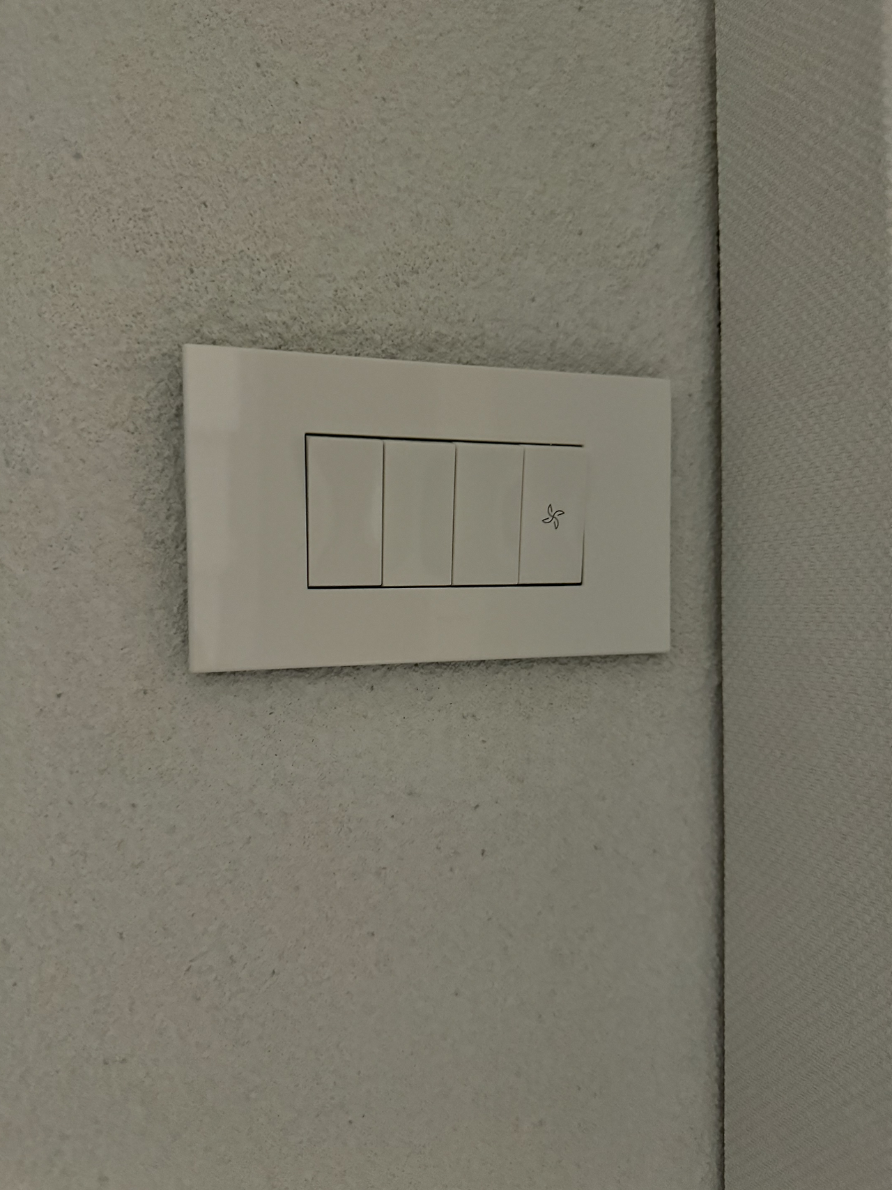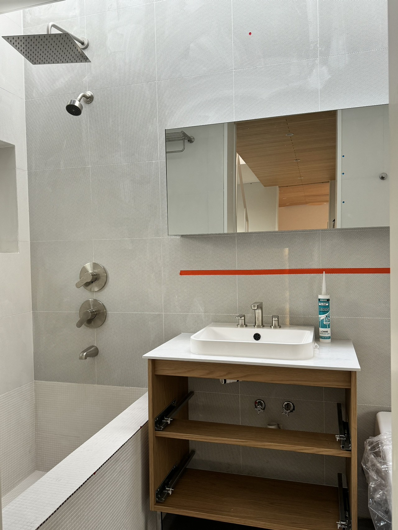 욕실의 특성상 도기, 세면장, 거울장, 수전 등 벽에 배치되는 제품이 대부분이고 각각이 다른 제품의 위치에 영향을 미치는 걸 감안하면, 전기 배선은 가구의 중간쯤에 배치하는 것이 유연성이 있었을 듯하다. 타이트한 공간인 데다 아슬아슬한 위치에 선이 노출되다 보니 말끔하게 정리가 어렵고 타일 타공도 너무 크게 되어 있어 거울이나 거울장으로 가려지지 않는 문제가 3층, 4층 욕실 모두에서 발생하고 있다. 작아서 그런 걸 수도 있지만, 여러 기능을 가진 공간이라 그런지 욕실이 정말 작업하기 어려운 공간인 듯하다.
