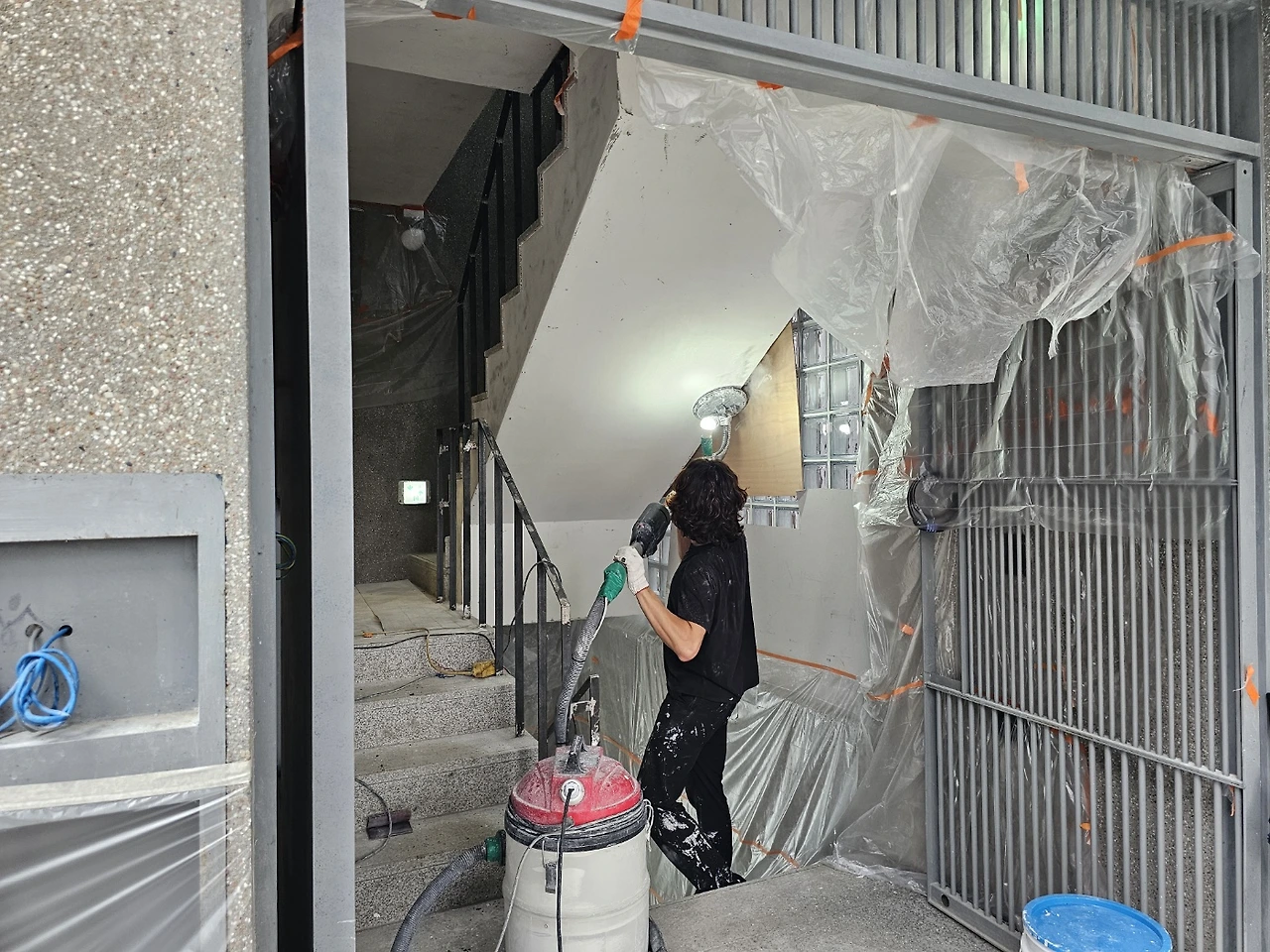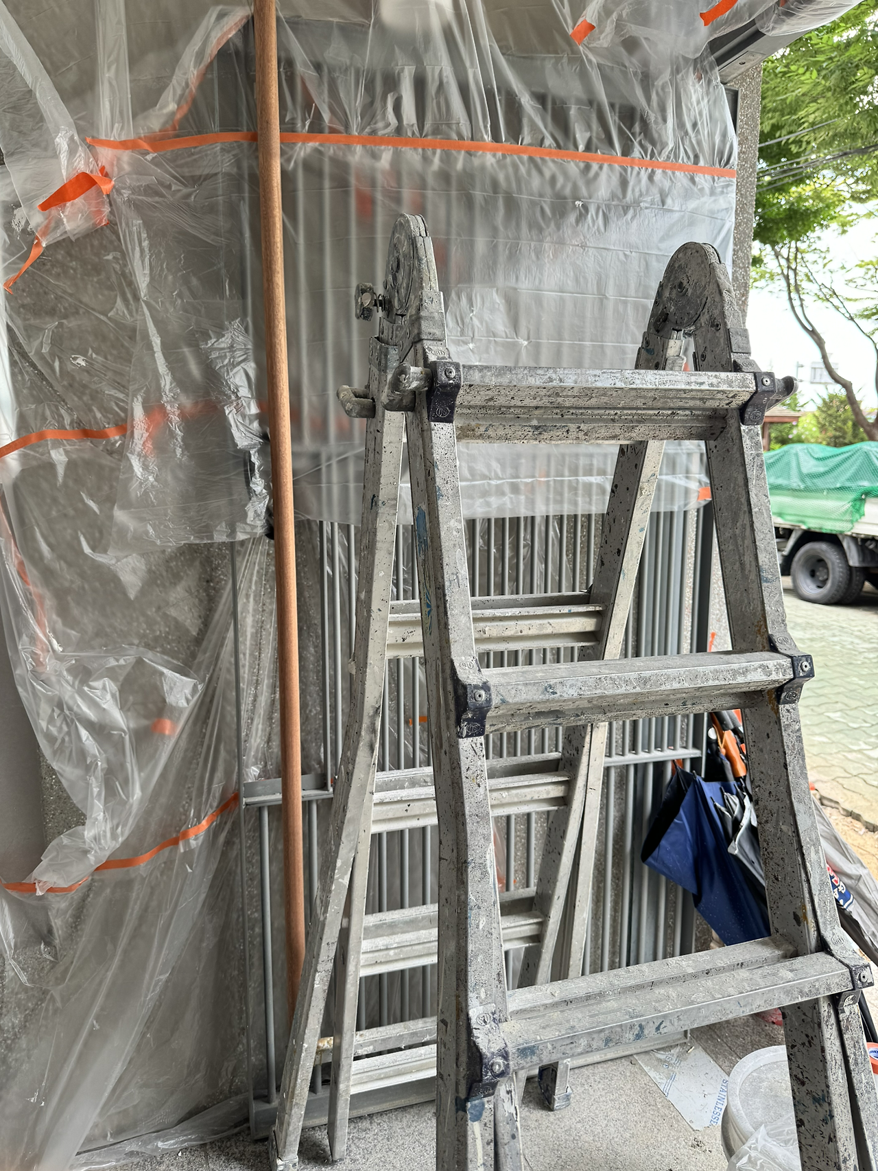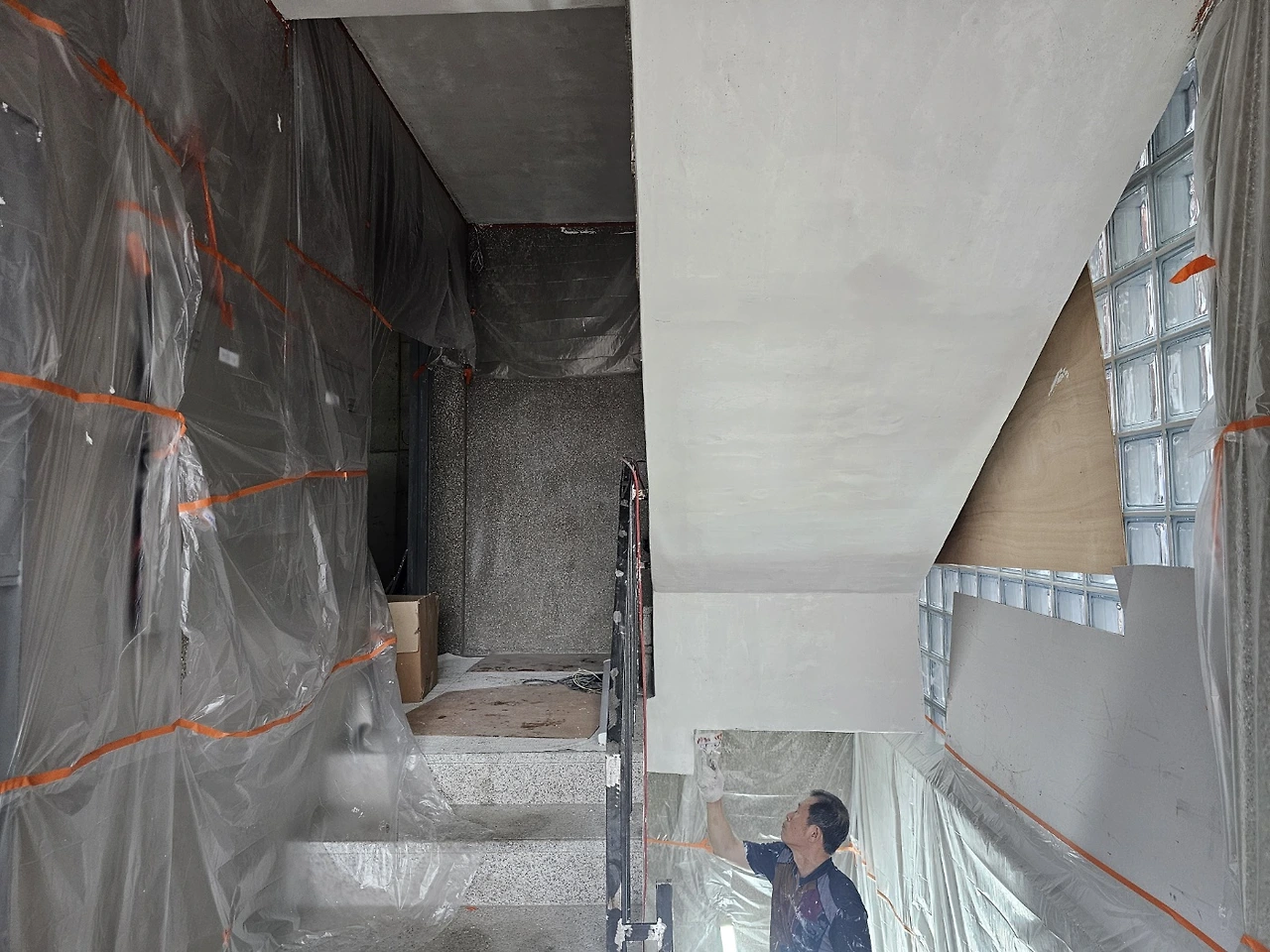 내부 계단과 천장 등 도장작업이 종일 진행되었다. 도장은 한 번에 끝나는 일이 아니라 여러 번 바르는 과정을 반복하고 중간에 갈아내고 다시 칠하기도 하면서 점점 매끈해진다. 집중력과 끈기가 필요한 작업이다. 게다가 주변에서 먼지를 일으키거나 하면 문제가 되기 때문에 다른 작업과 겹치지 않게 단독으로 진행하는 게 낫다.