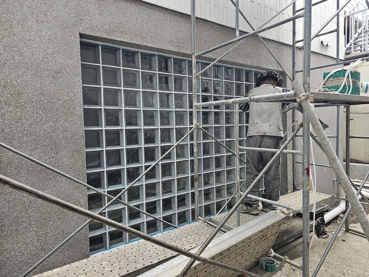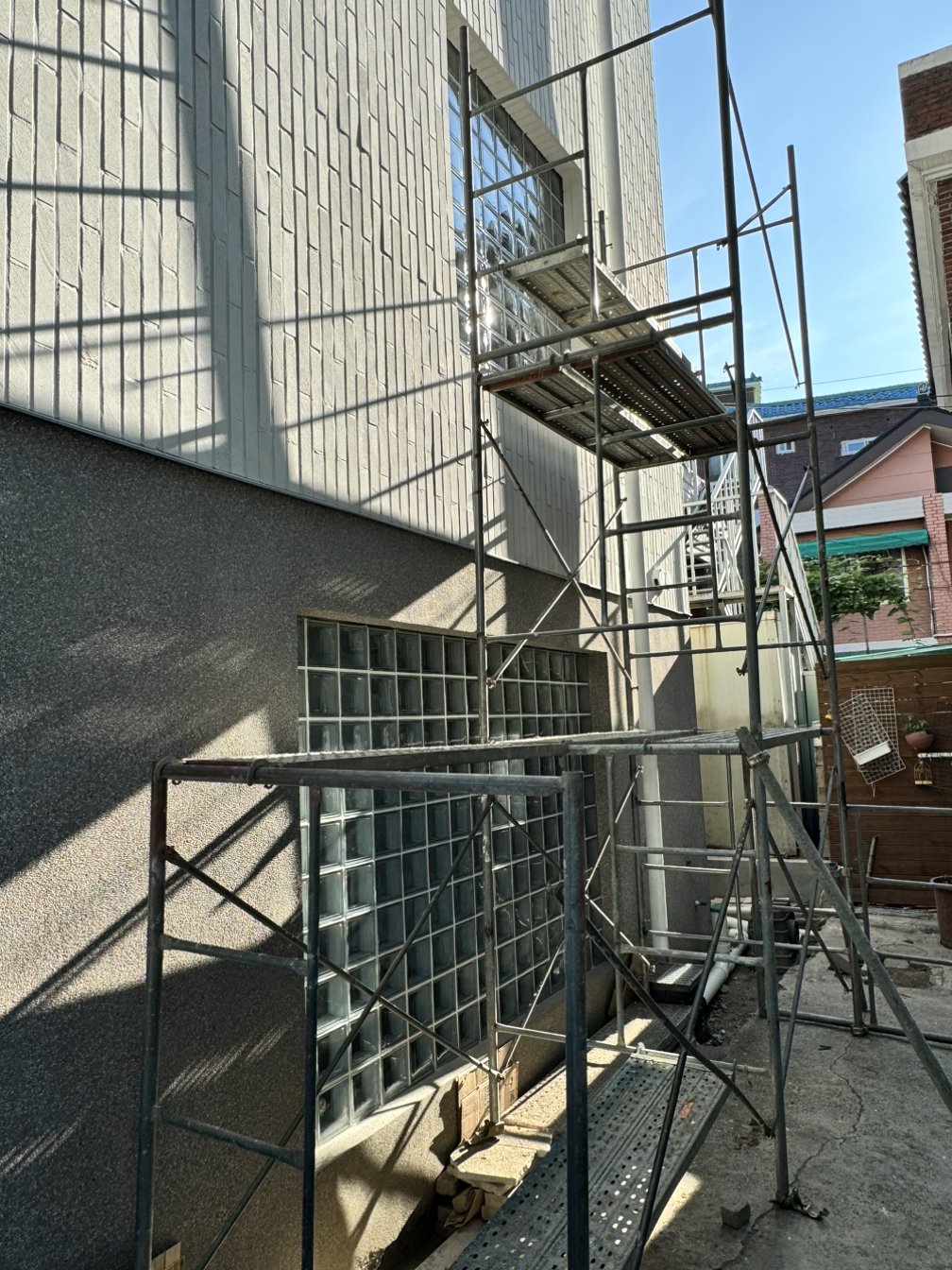 주말에 작업을 마친 유리블럭은 금주에 잡힌 비소식 때문에 벽과 만나는 테두리의 실리콘 마감이 빨리 진행되어야 한다는 시공업체의 의견을 현장에 전달하였다. 비가 많이 오면 물이 메지를 타고 흘러 유리블럭으로 녹아내리면 닦아내기 어렵기 때문이라 한다. 콩자갈과 만나는 부위는 이질감을 줄이기 위해 그레이로 해야 하나 싶기도 했으나, 한 가지 색으로 통일(화이트)하여 내일부터 작업하기로 하였다.