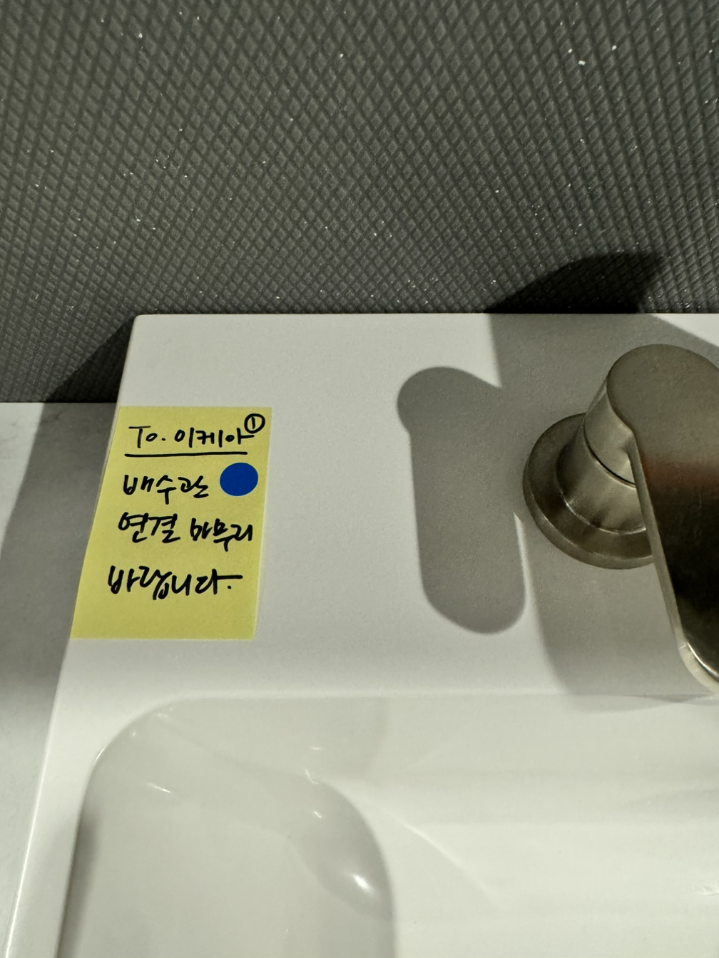 이케아에서는 인조대리석 상판과 세면대 설치를 하러 방문했는데, 배수관이 벽에 있어 설치할 수 없고 수전은 앵글밸브를 연결할 자바라가 없어서 연결하지 못한다고 한다.(이게 사전 안내 메시지에서 얘기한 설명이었나 보다. 연락해서 미리 확인했어야 했다) 어쨌든 상판을 설치하고 세면대를 올리는 거 말고는 별로 할 수 있는 일이 없게 되었다. 주문한 사이즈의 상판을 현장에서 커팅하면서 3층은 상판 설치를 못하게 되었고, 게다가 3홀로 타공 하려고 선택한 분쇄대리석 소재의 세면기인 '박셴'은 수전을 넣어서 확인하는 과정에서 세면기에 이가 나가버렸다. 결론적으로 3곳 모두 마무리를 못하게 된 것이다. 한 번에 일이 되는 게 이렇게 어려운 일이란 걸 새삼 깨닫게 된다. 더불어 이케아의 욕실 설치 서비스는 한 번에 일이 끝나기 어려운 구조로 보이기도 하고 아직 안정적으로 동작하는 것 같지는 않다.