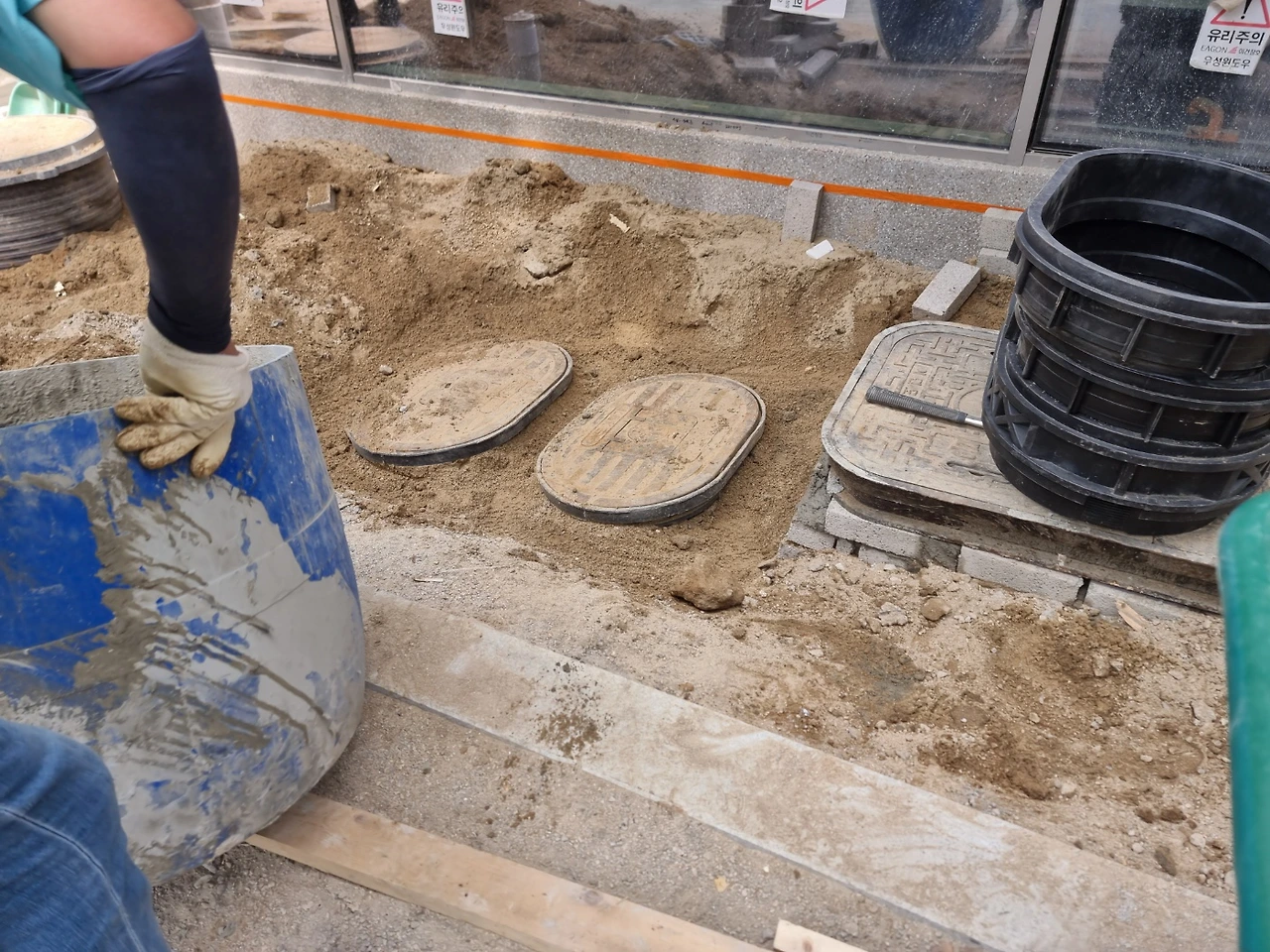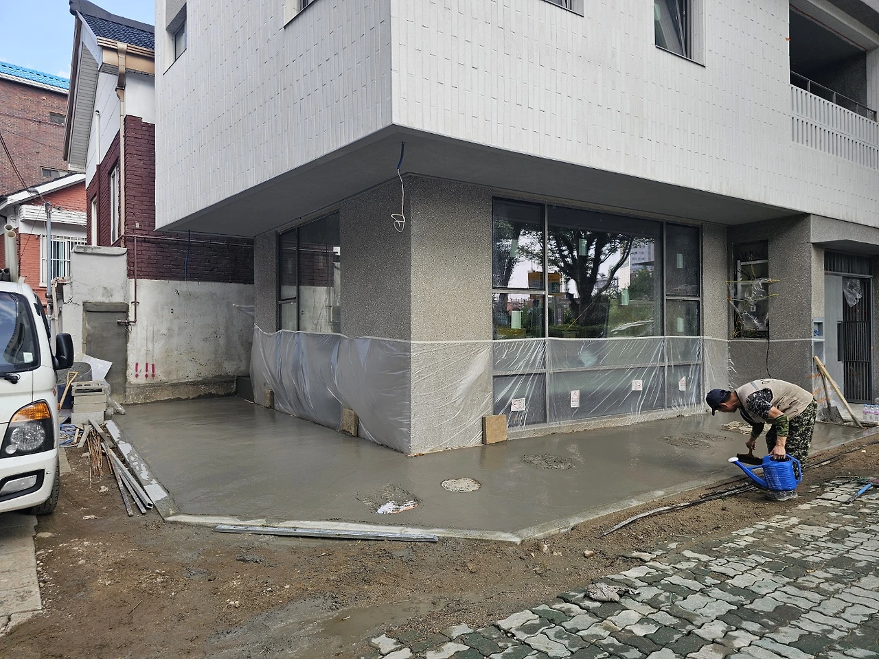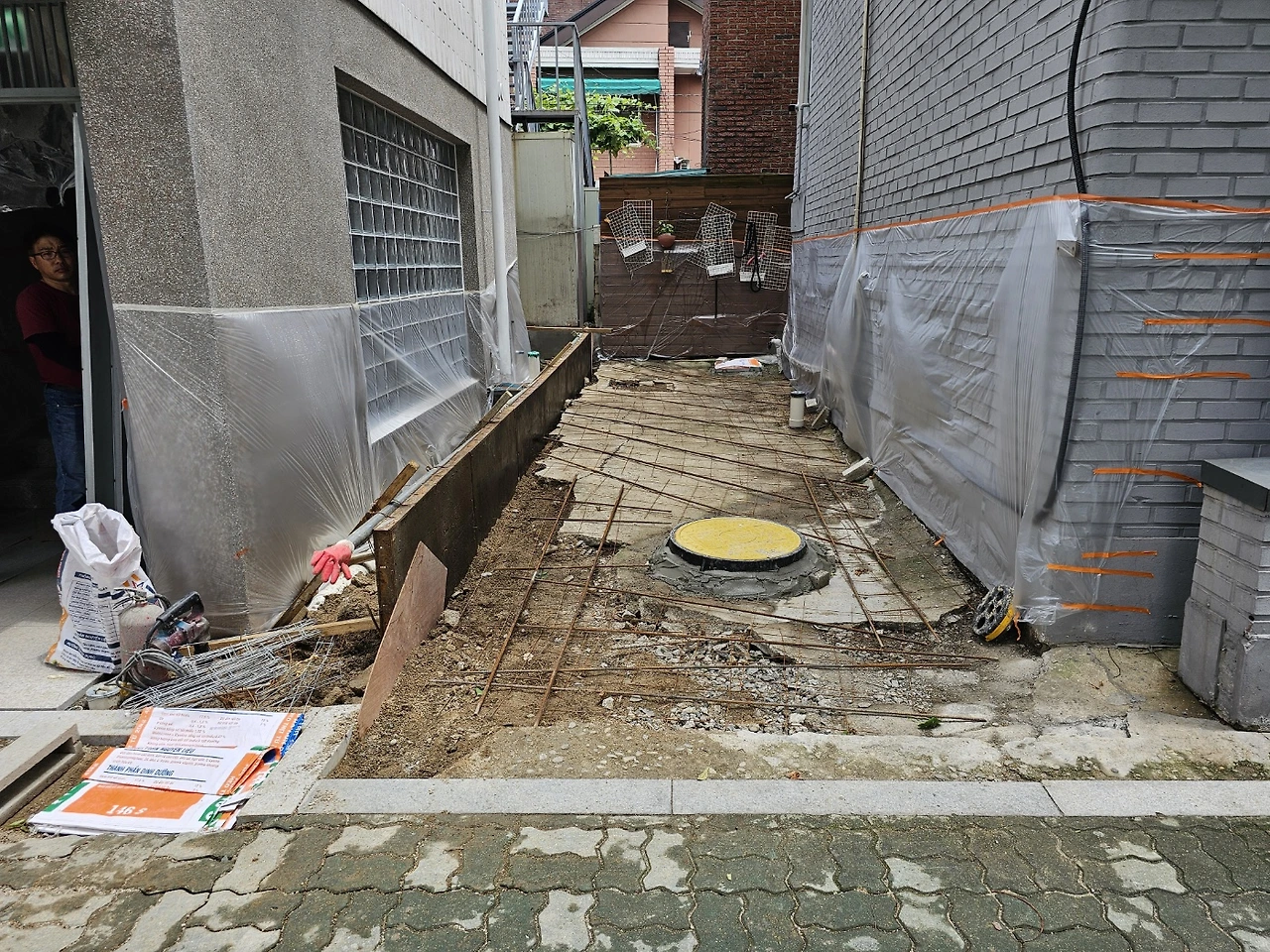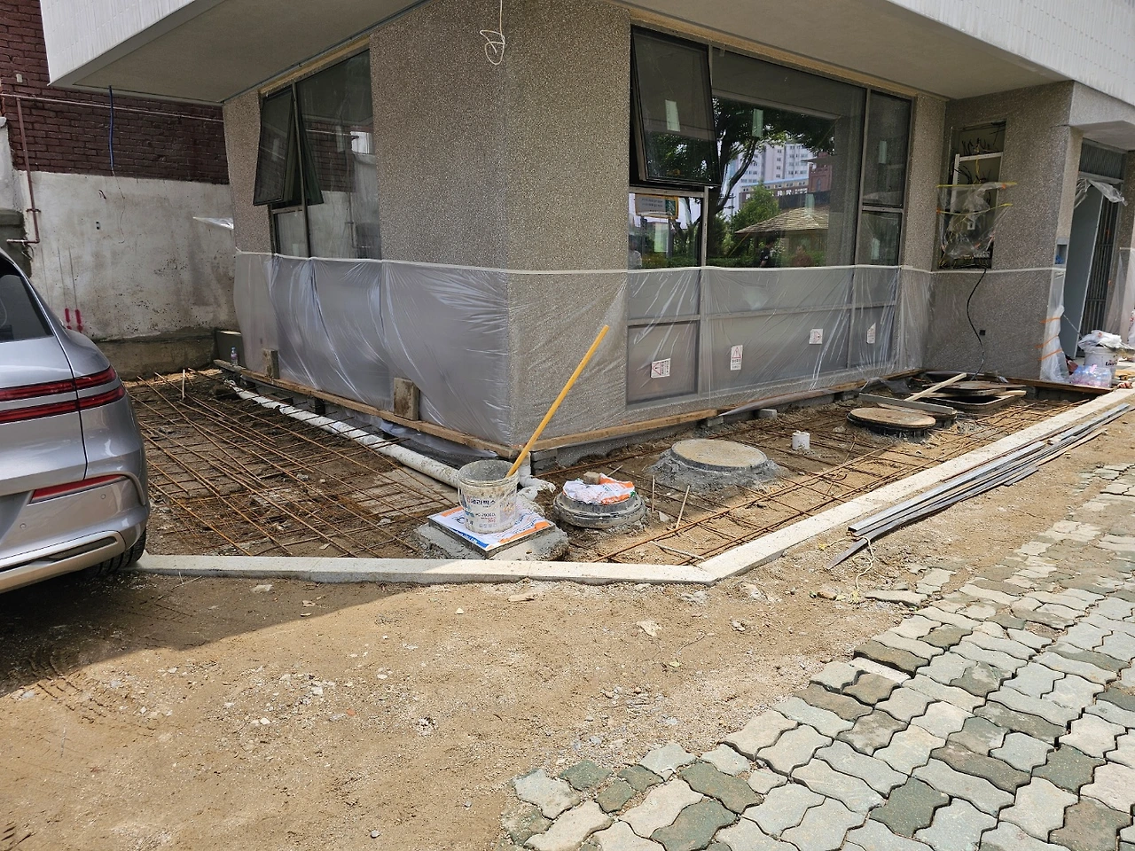 건물 외부에서는 주차장 레미콘 타설 전 바닥을 정리하는 작업이 진행되고 있다. 바닥 면보다 내려가 있는 수도계량기함을 높이는 인상작업이 있었다. 설계 당시에는 바닥을 콩자갈로하고 맨홀 뚜껑을 콩자갈로 채워 바닥이 하나처럼 마감하는 방향이었는데, 레미콘 타설 후 면을 갈아내고 철제 맨홀 도장으로 처리되는 듯하다. 거기에 오수 맨홀은 눈에 잘 띄어야 하는 이유에선 지 시에서 정한 노란색 뚜껑으로 지정된 모양이다. 건물 전면에 5개가량의 맨홀들이 자리하게 되어 다소 어지러워 보일 수 있겠다.