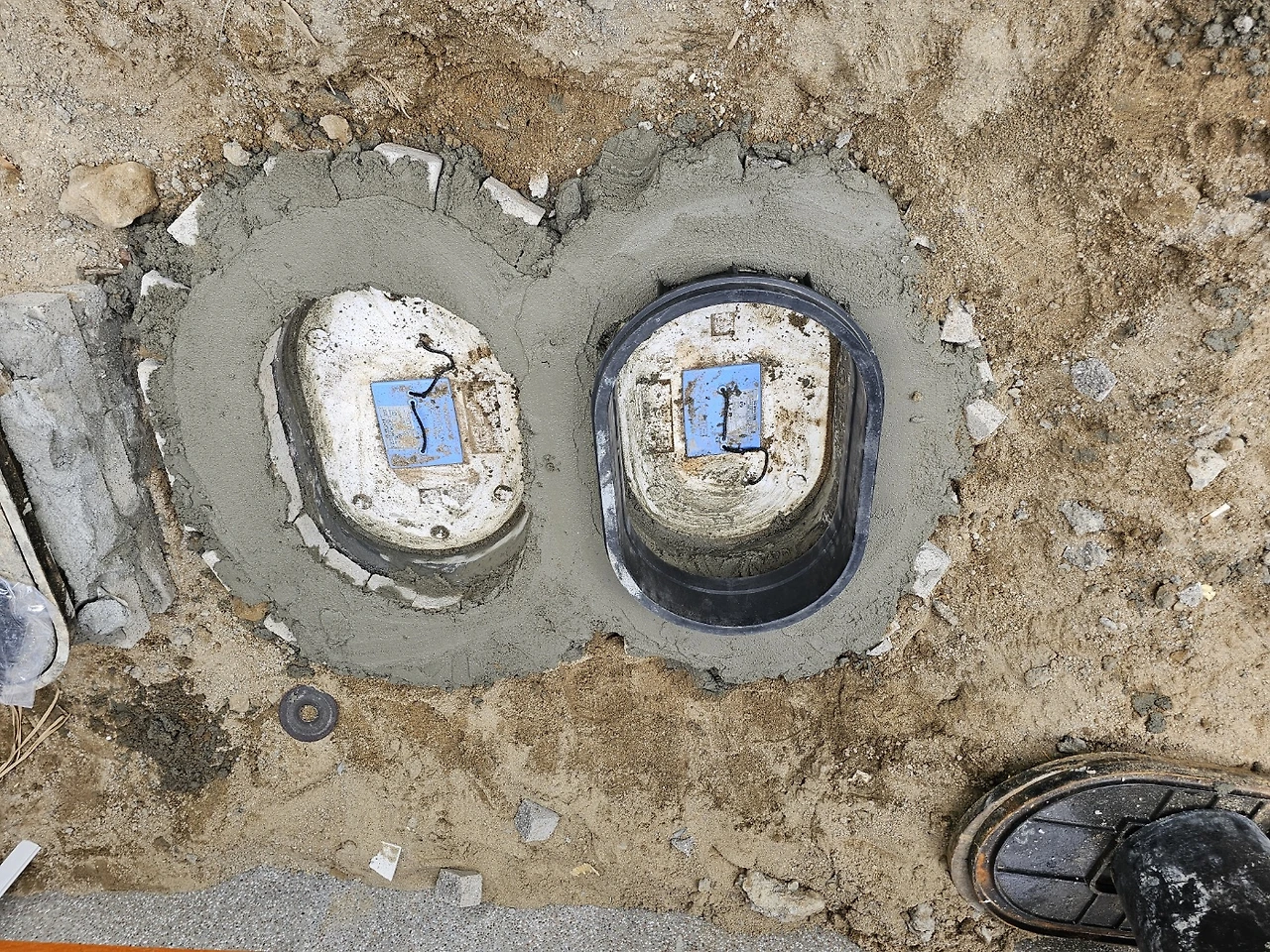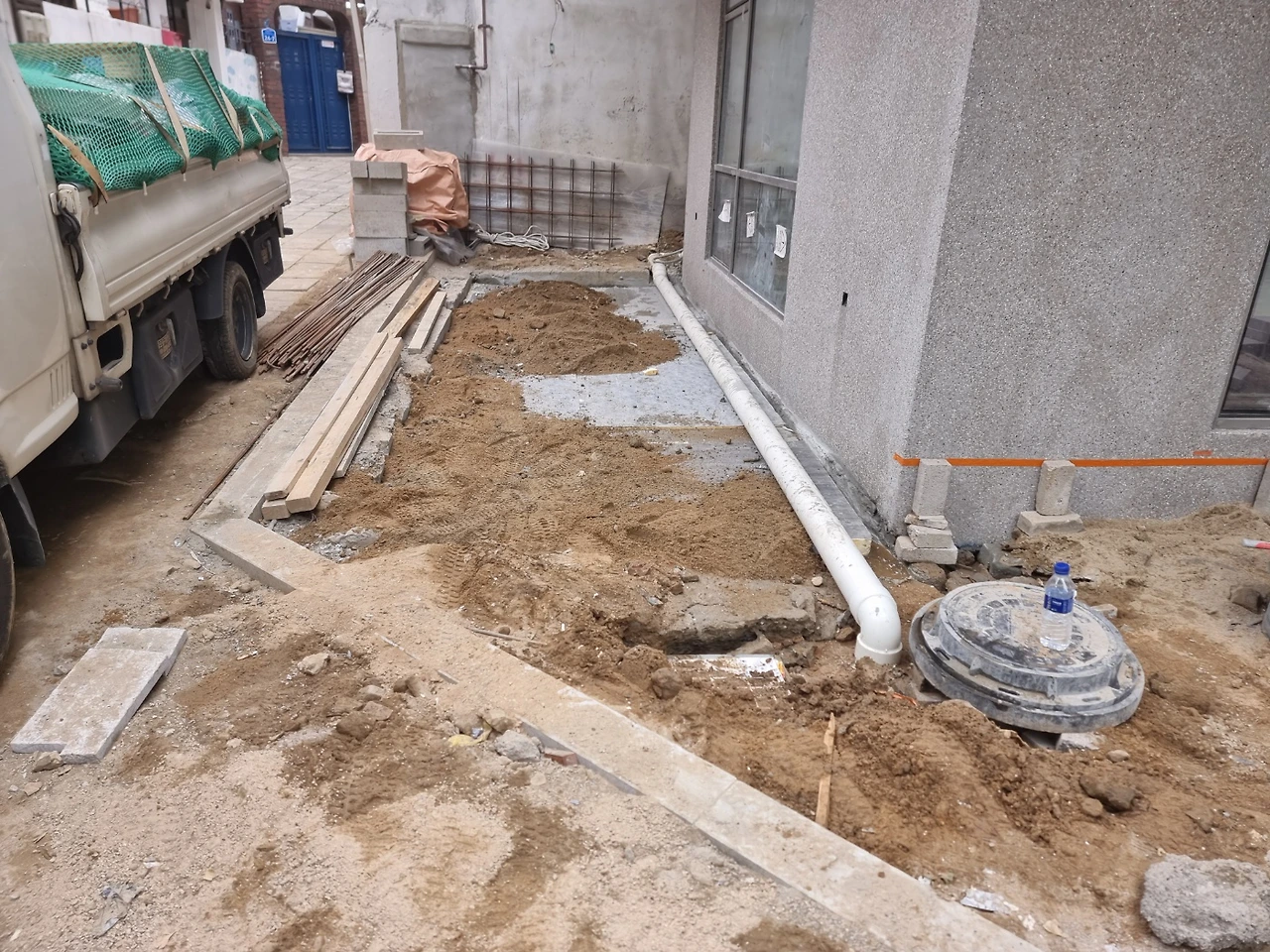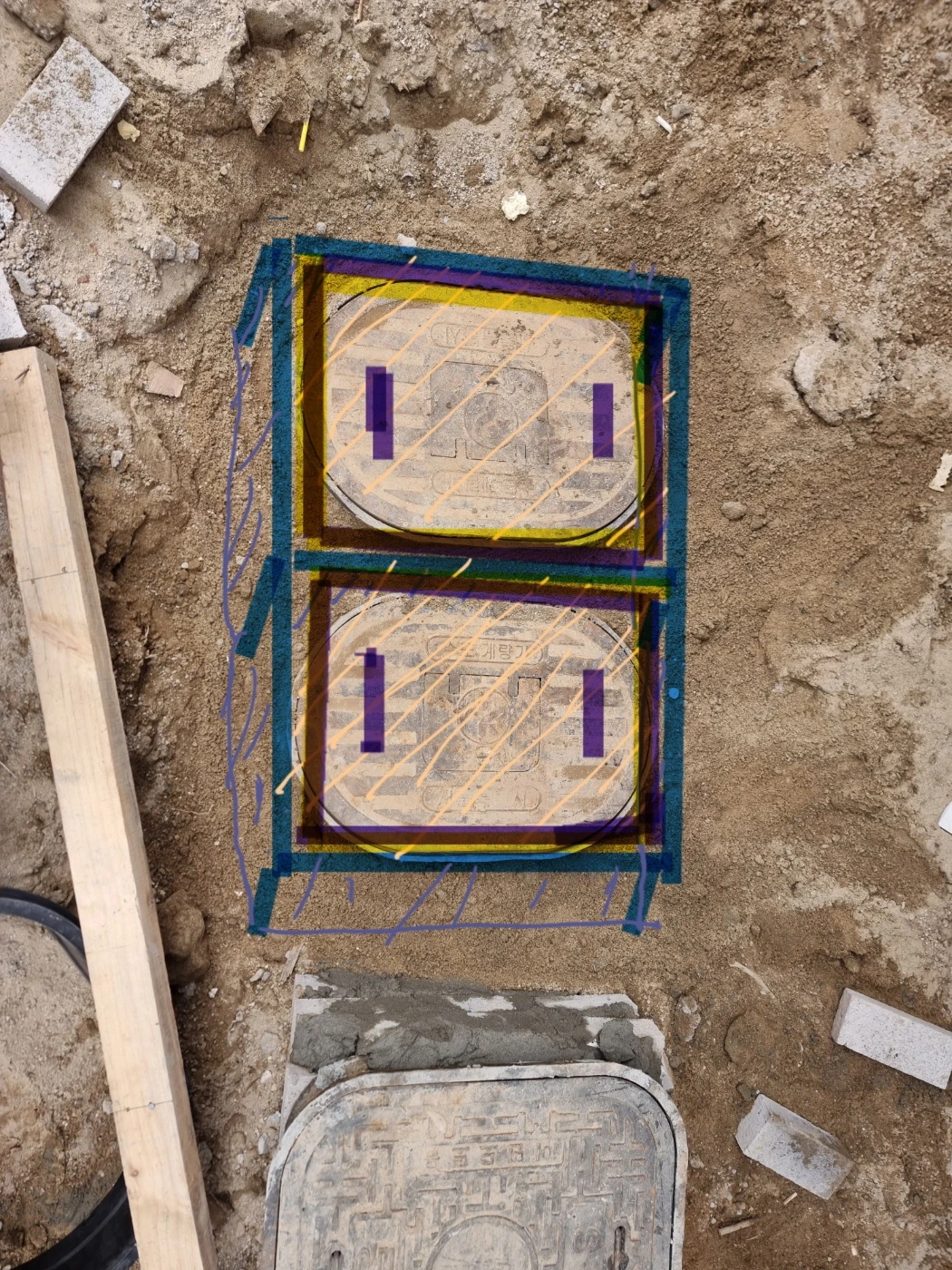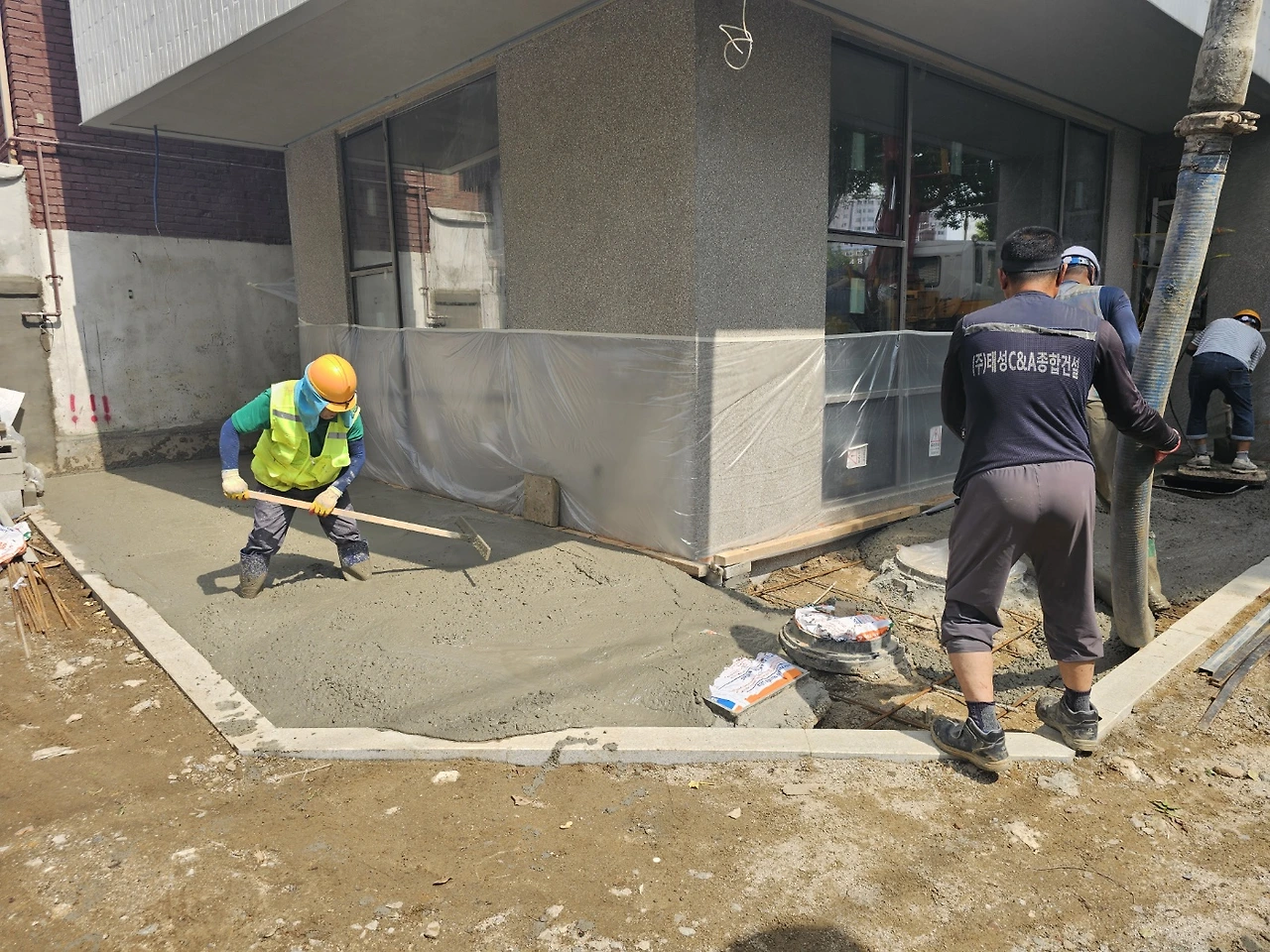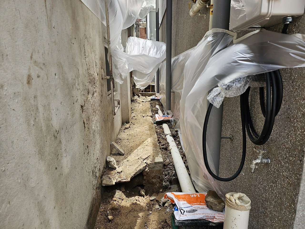 건물 외부에서는 주차장 레미콘 타설 전 바닥을 정리하는 작업이 진행되고 있다. 바닥 면보다 내려가 있는 수도계량기함을 높이는 인상작업이 있었다. 설계 당시에는 바닥을 콩자갈로하고 맨홀 뚜껑을 콩자갈로 채워 바닥이 하나처럼 마감하는 방향이었는데, 레미콘 타설 후 면을 갈아내고 철제 맨홀 도장으로 처리되는 듯하다. 거기에 오수 맨홀은 눈에 잘 띄어야 하는 이유에선 지 시에서 정한 노란색 뚜껑으로 지정된 모양이다. 건물 전면에 5개가량의 맨홀들이 자리하게 되어 다소 어지러워 보일 수 있겠다.