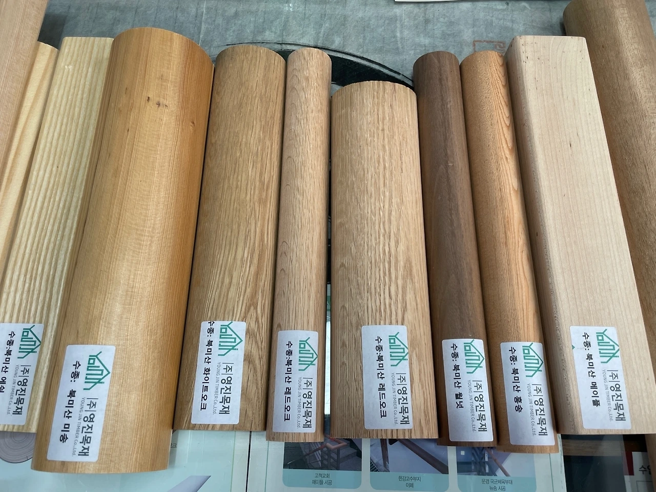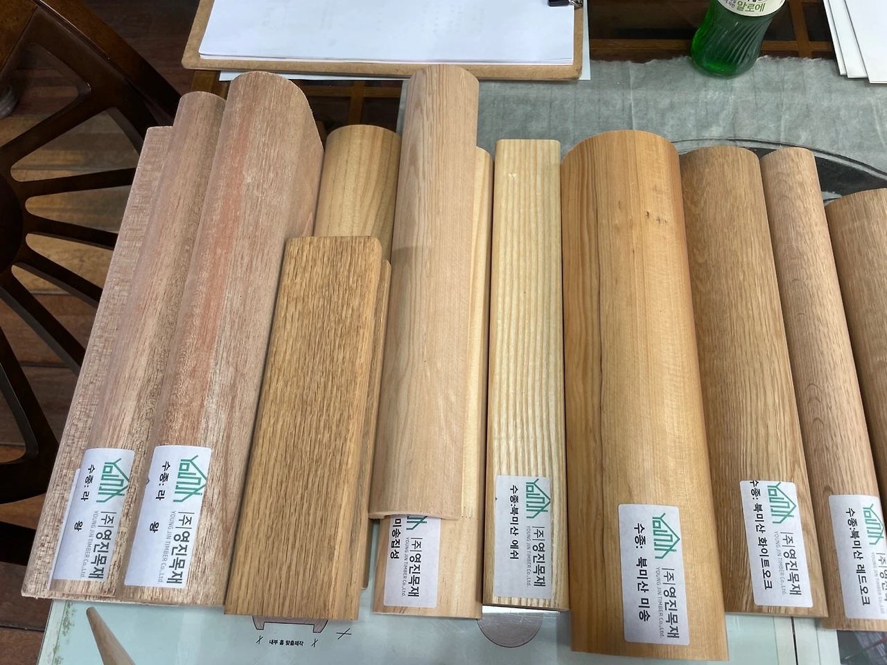 사무실 벽면은 오래된 책장처럼 온갖 목재들이 꽂혀있고 그 안에서 여러 가지 샘플을 꺼내서 쓸만한 것들을 보여주시고 설명도 해주셨다. 햇빛과 외부 날씨를 고려했을 때 오크 같은 수종은 몇 주 안되어 뒤틀어지고 갈라진다고 한다. 아무래도 더운 나라에서 자란 라왕이 내구성이 좋은 편이라고. 라왕의 붉은색도 그렇고 가시가 많은 거친 표면이 우려스러웠는데 실제로 보니 오크처럼 우아한 패턴은 아니지만 생각보다 붉은색이 강하지 않고 가공된 촉감도 나쁘지 않았다. 오래 쓰고 색이 바래면서 멋있어질 거 같기도 하다.