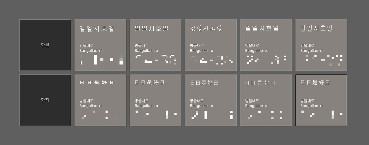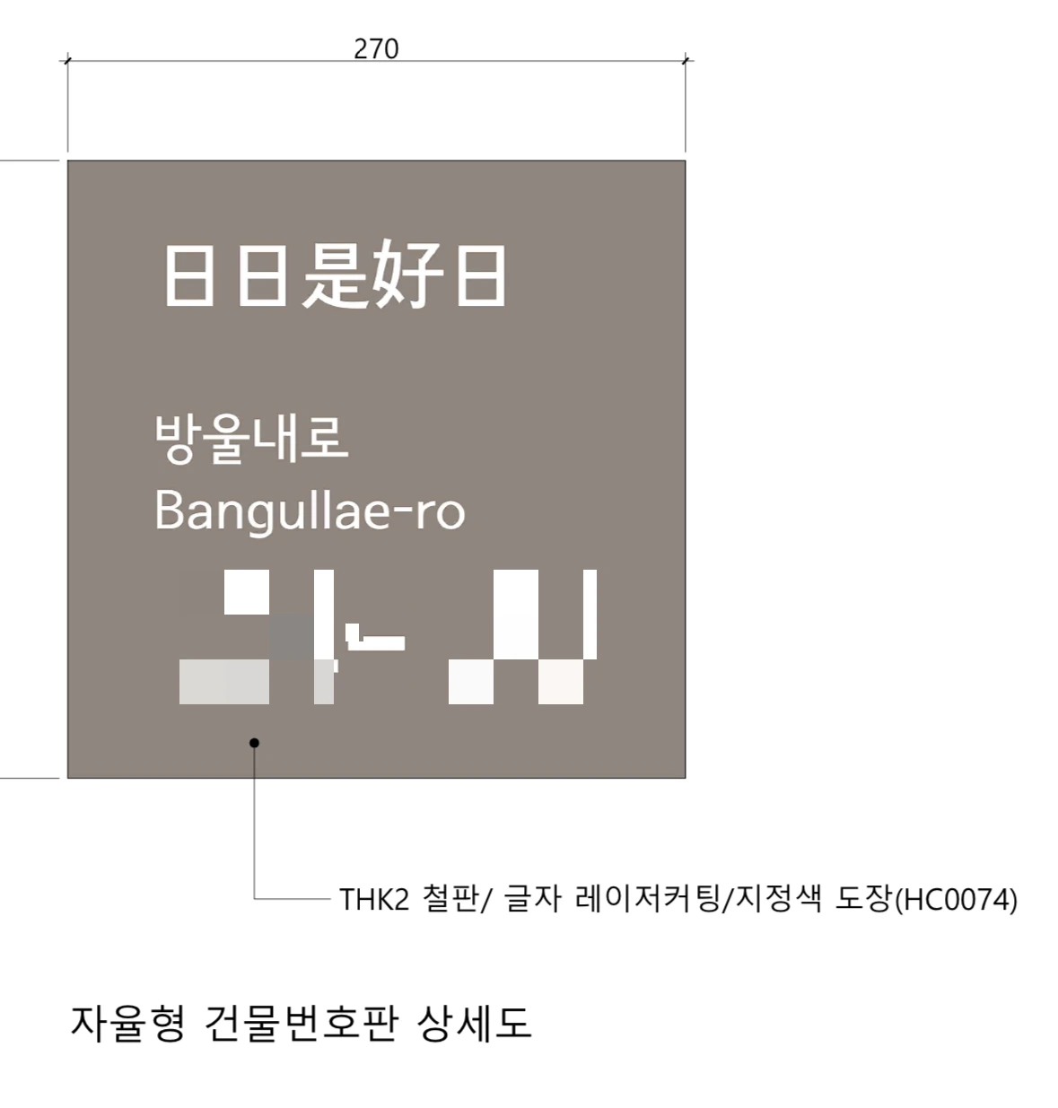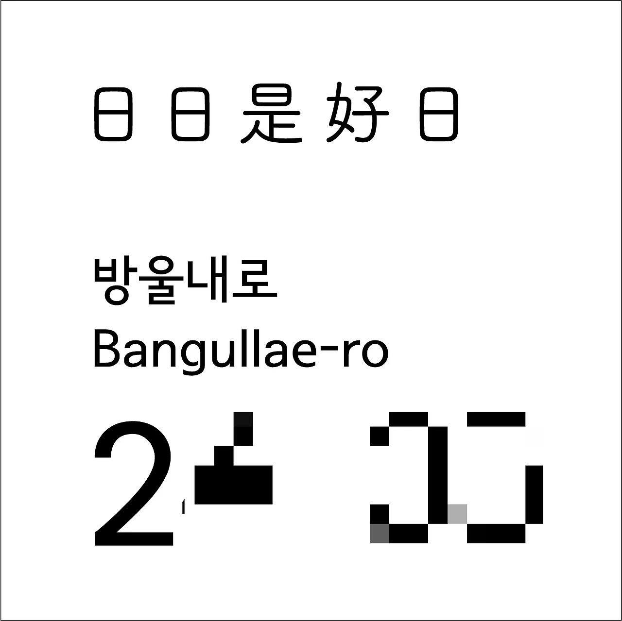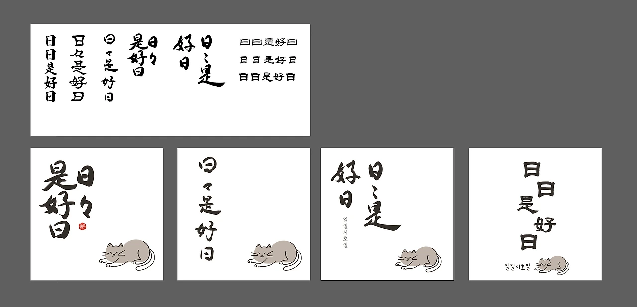 건물번호 부여와 주소판 신청을 준비하다 보니 건물 이름도 같이 만드는 게 좋을 거 같아 급히 지인에게 도움을 요청하였다. '일일시호일, 나날이 좋은 집'은 집을 짓기 시작할 때부터 마음에 둔 이름이고, 영화 일일시호일의 타이틀이나 장욱진 화가의 글씨가 여유로운 느낌을 잘 살린 것 같아 샘플로 공유했는데 우리 '디디'가 등장하는 깜찍한 안들이 등장했다! 주소와 함께 넣지는 못하고 나중에 스티커라도 만들어봐야겠다. 디자인을 보니 한자와 한글 배치도 괜찮은 선택이라 주소판에 넣은 한자 상용 폰트 배치도 다시 부탁해 보았다. (감사)