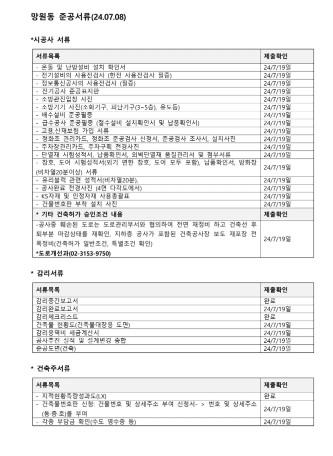 금주까지 준공서류를 마무리해서 제출하는 것이 목표이므로, 조소장님은 계속 사용승인 관련 서류를 챙기고 있다. 전기검사, 통신검사 필증도 서류제출에 포함되어 있어 이렇게 일정이 긴급히 돌아가는 모양이다. 통신검사 일정이 7/22로 잡히고 필증교부에 1-2일이 소요되어, 사용승인 신청일도 그에 맞춰 순연될 것으로 예상된다.