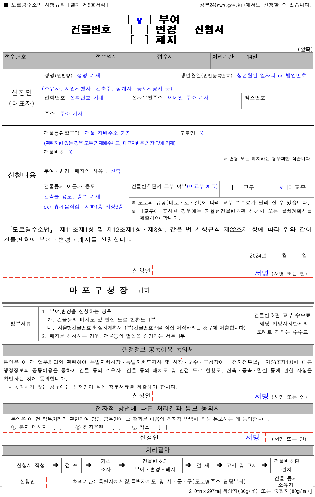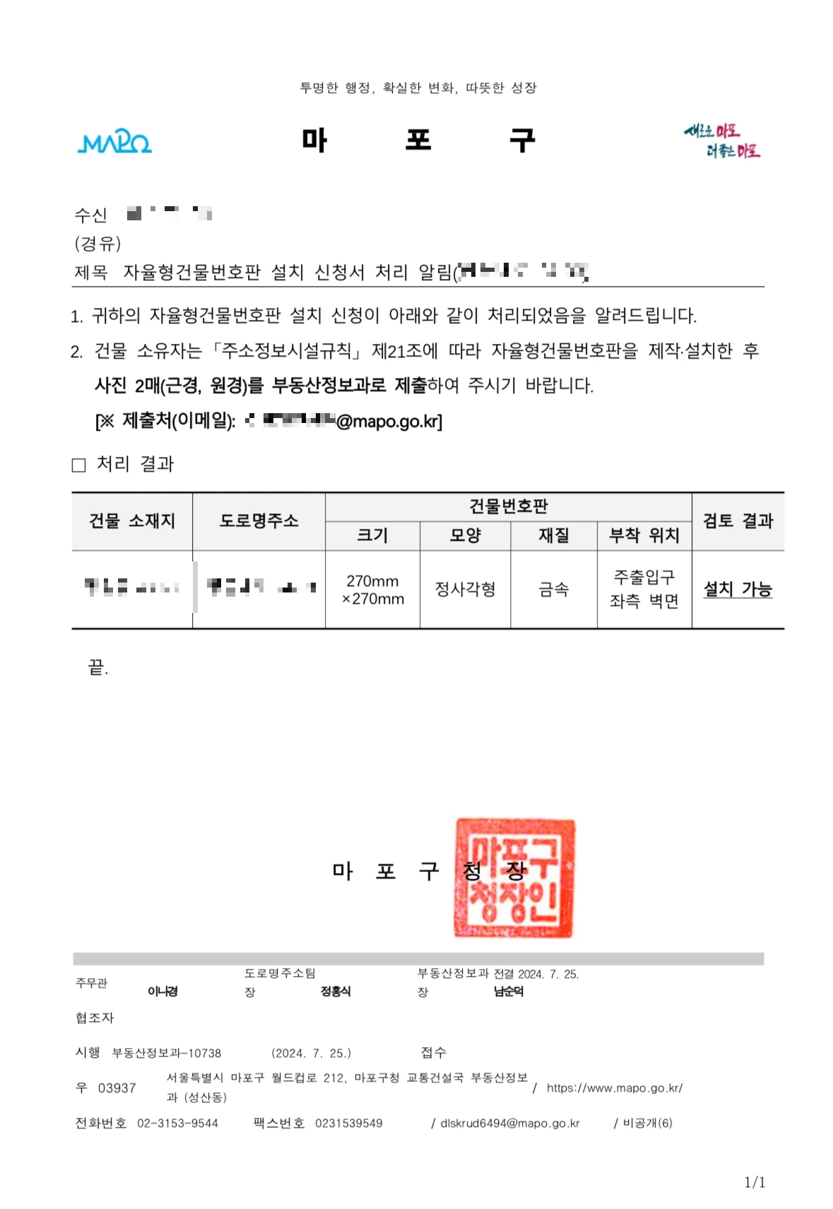 구청으로부터 자율형 건물 번호판 설치 신청이 처리되었다는 공문을 받았다. 자율형 건물 번호판도 기본 규격이 있어서 이에 맞게 제작하라고 알려주었고, 정부24에 올린 설치계획 도면에 글자 사이즈를 표기하여 구청 담당자에게 재송부하였다.