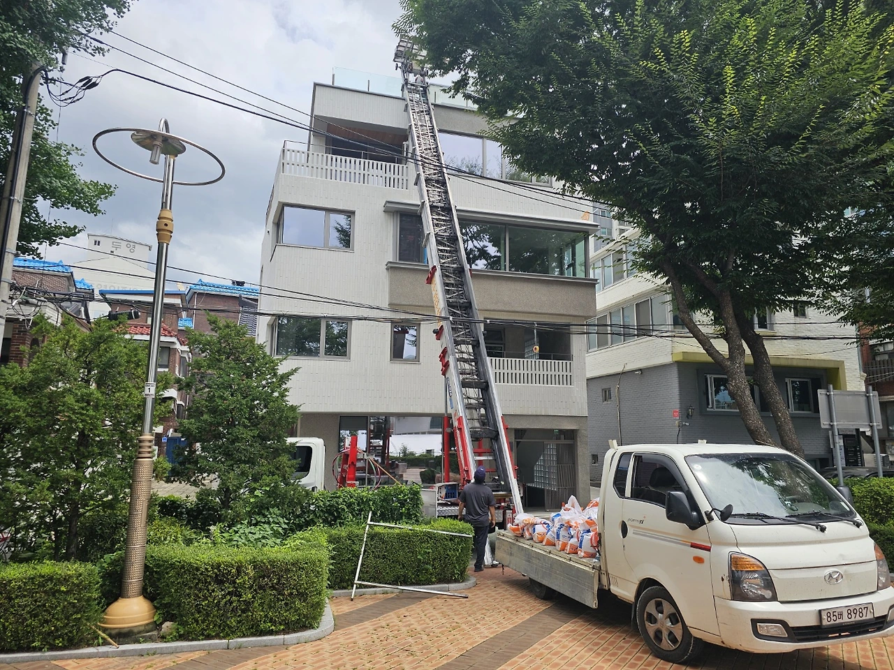 실제 주소판을 설치한 근경과 원경 사진을 사용 승인 전 부동산정보과로 이메일로 제출해야 하는데, 세움터에 올리는 것도 가능하다고 하여 조소장님이 사용승인 서류와 함께 챙기기로 했고, 준공서류에 완강기, 소방관 진입창, 주차장과 건축물 외관사진도 필요하여 현장에서 준비하였다.