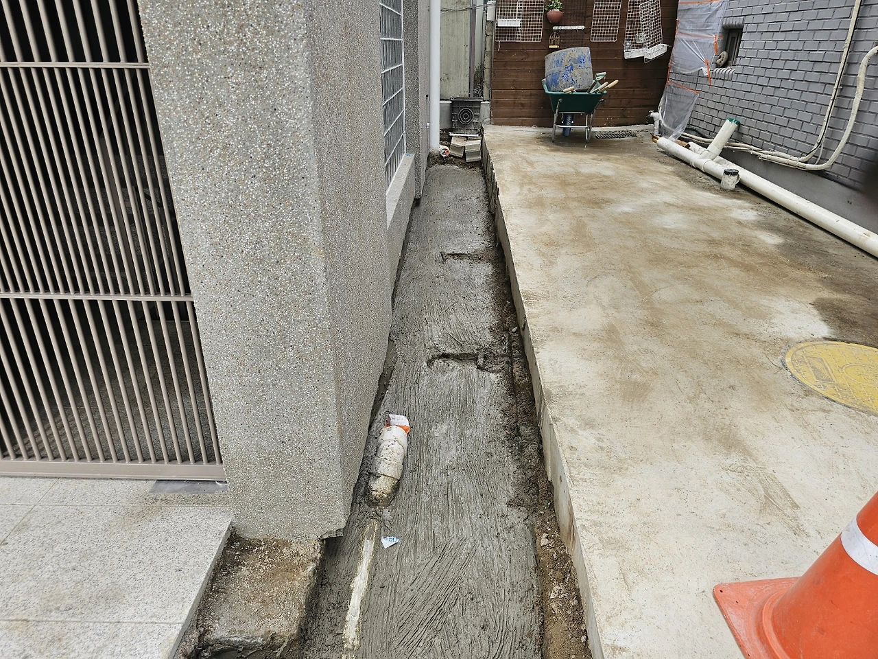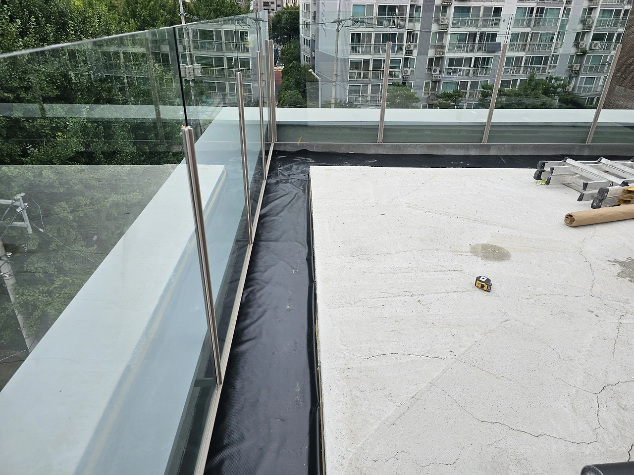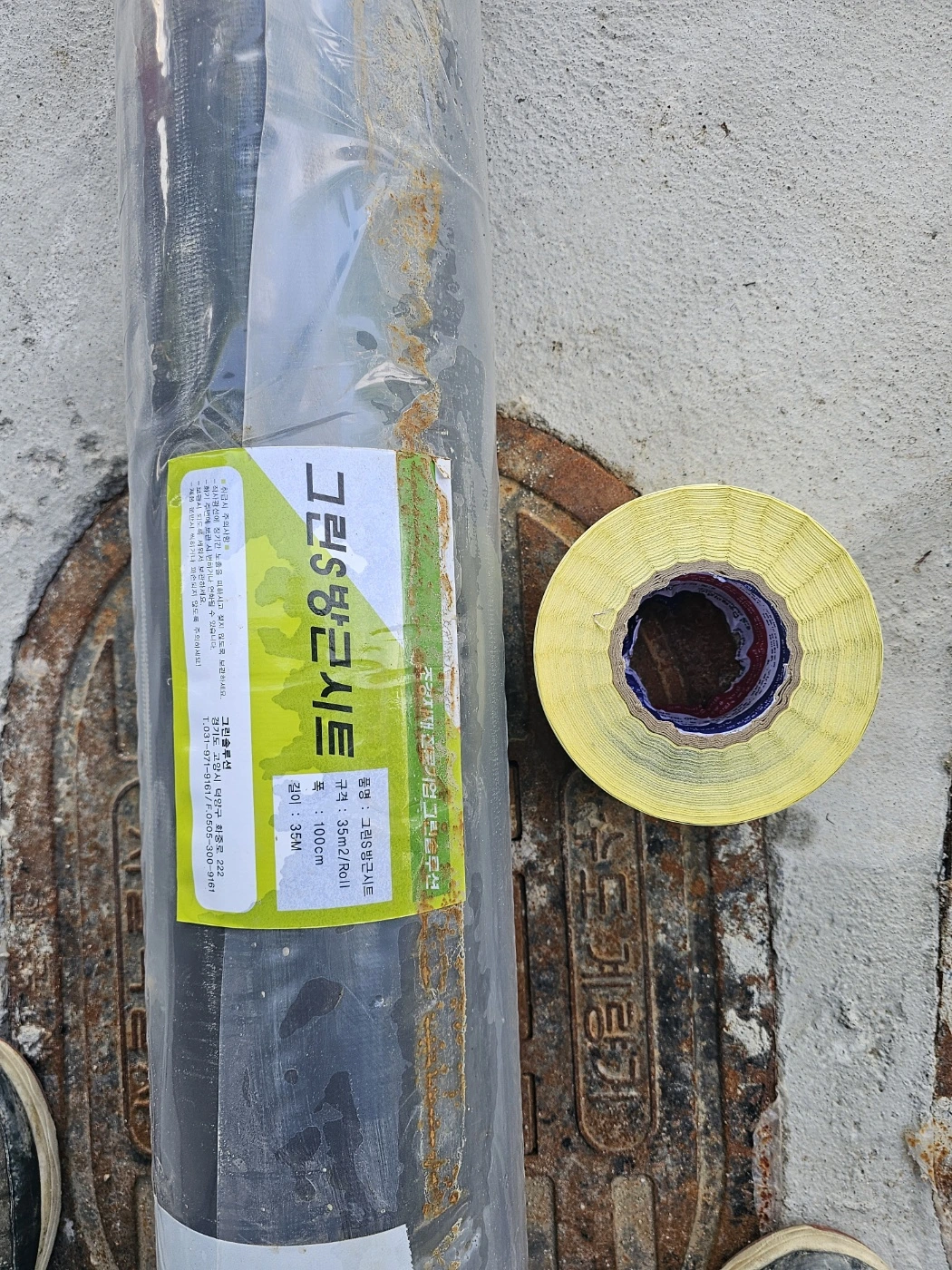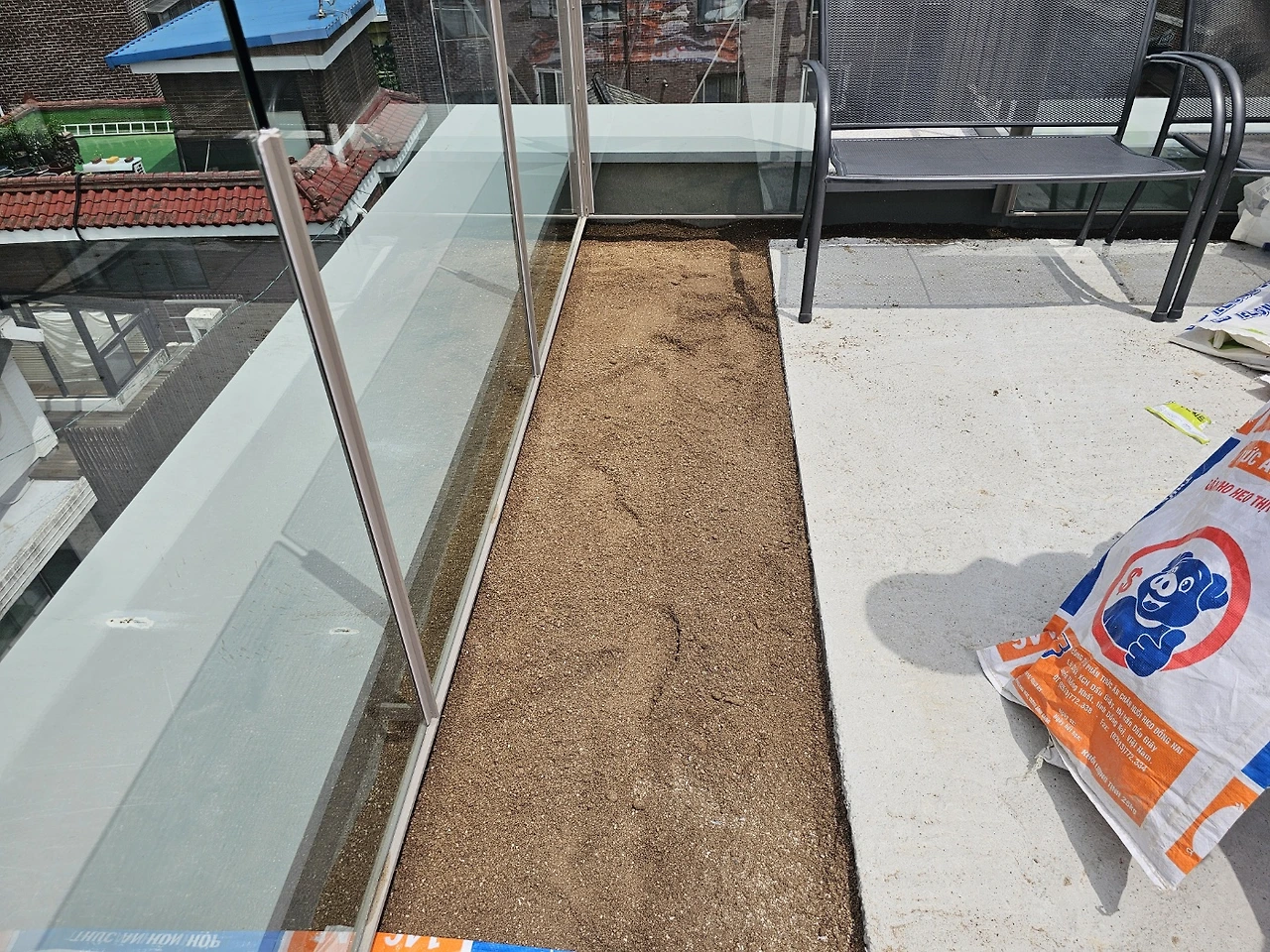 명일 : 옥상, 1층 바닥정리 시작, 화단 자리 드레인 보드+우수배관+잡석 깔기 후 금속 화단 견적